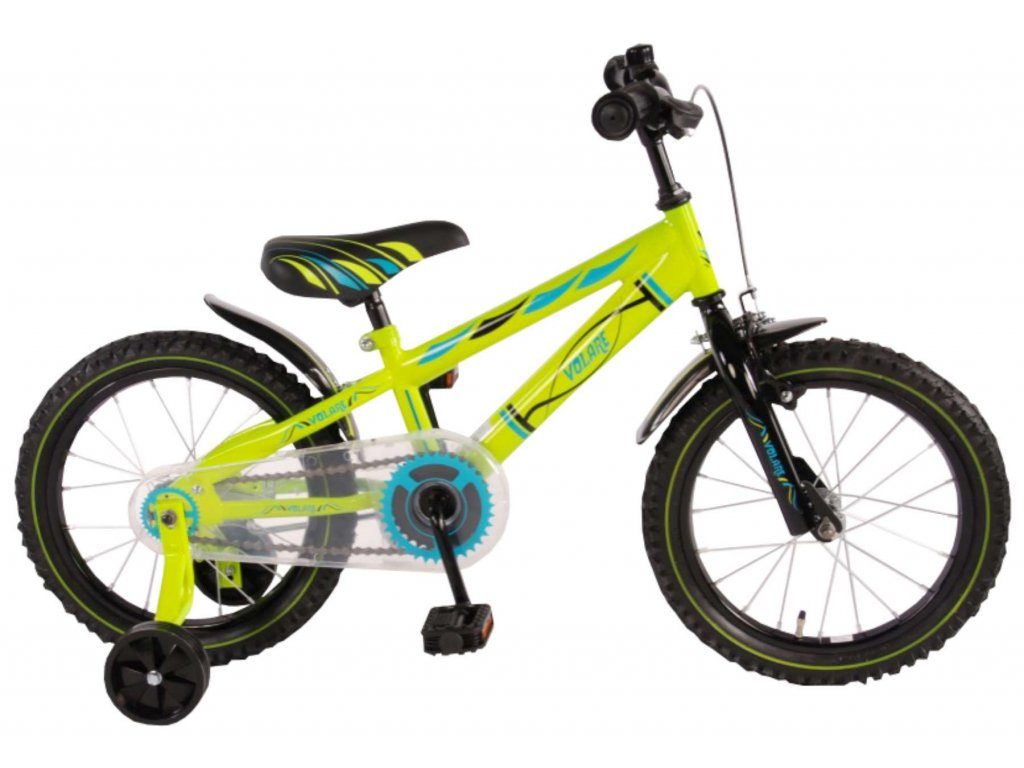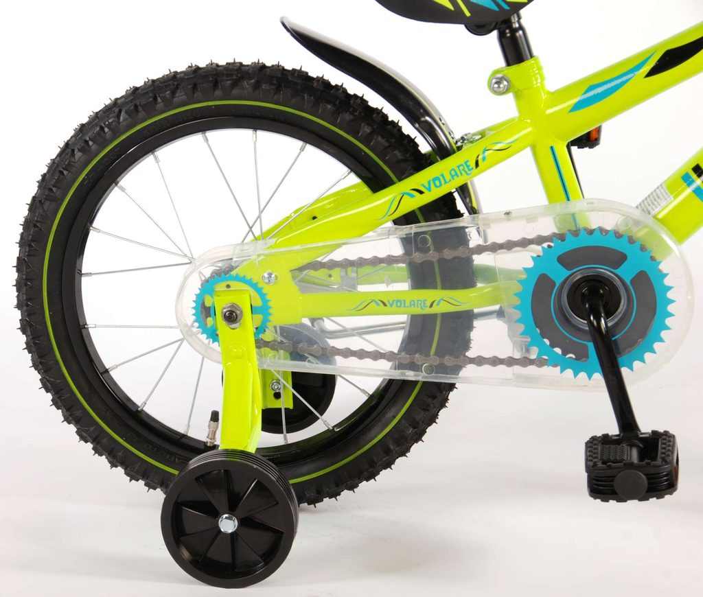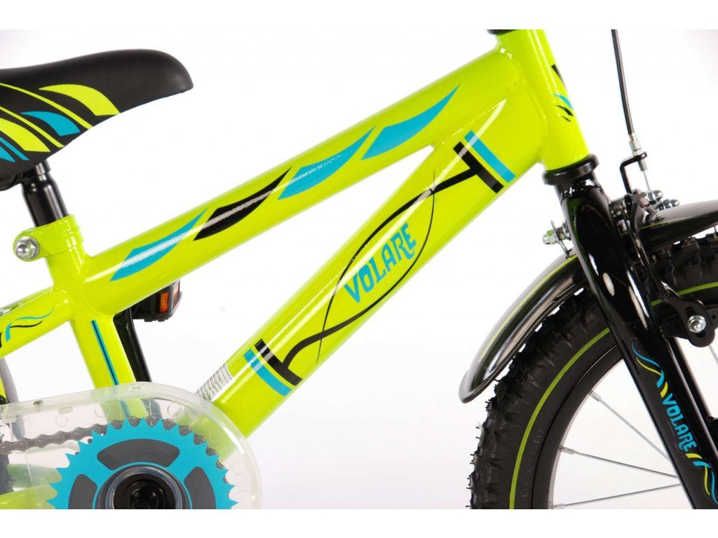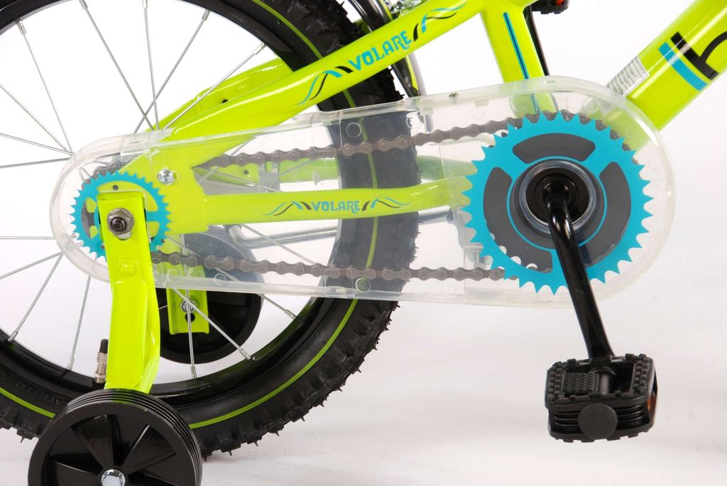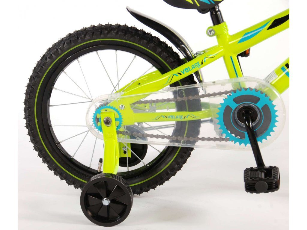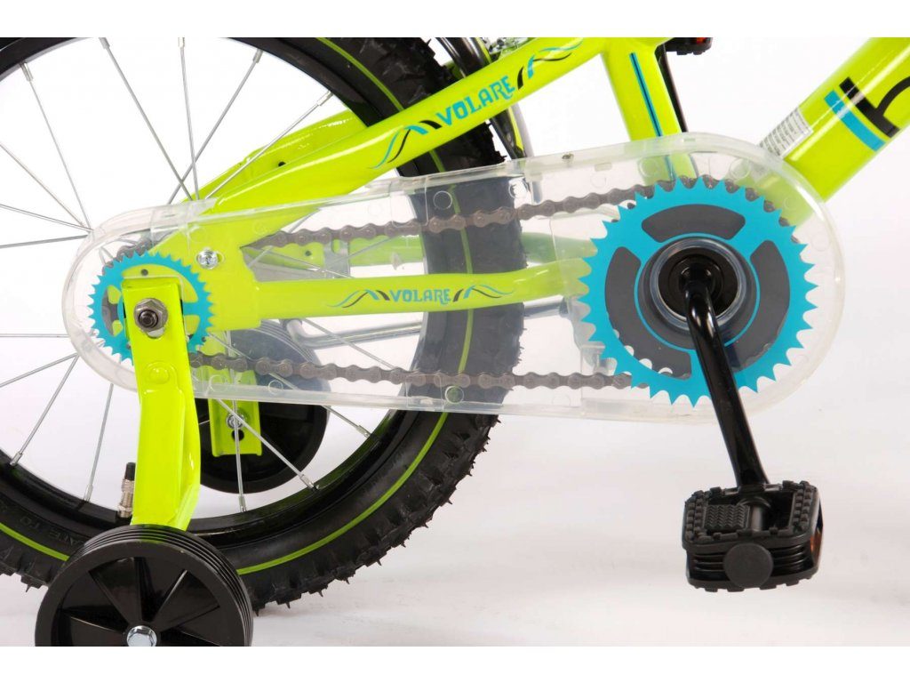 Originální dětské kolo od holandského výrobce Volare Electric Green s velikostí ráfků 16 palců je určeno pro děti ve věku od 4 do 6 let s výškou do 105 cm. Kolo je opatřeno demontovatelnými balančními kolečky, dítě se tedy bude cítit hned od první jízdy bezpečně a stabilně. Kolo je vybaveno 2 druhy brzd. Brždění probíhá buď protisměrnou zadní brzdou "torpédem",která možnuje brzdit zpětným záběrem pedálů nebo lze použít přední pákovou brzdu. Proti nechtěnému namotání nohavice nebo tkaničky do řetězu má kolo průhledný kryt, který zakrývá celý řetěz. Sedadlo i řídítka jsou výškově nastavitelné.