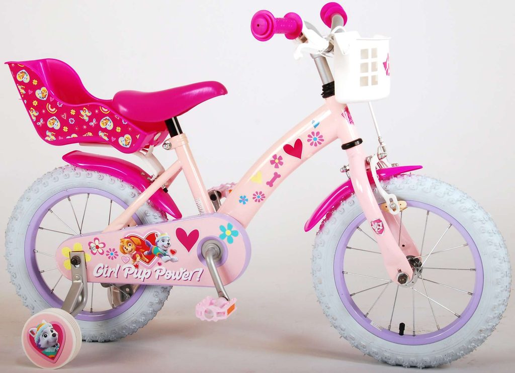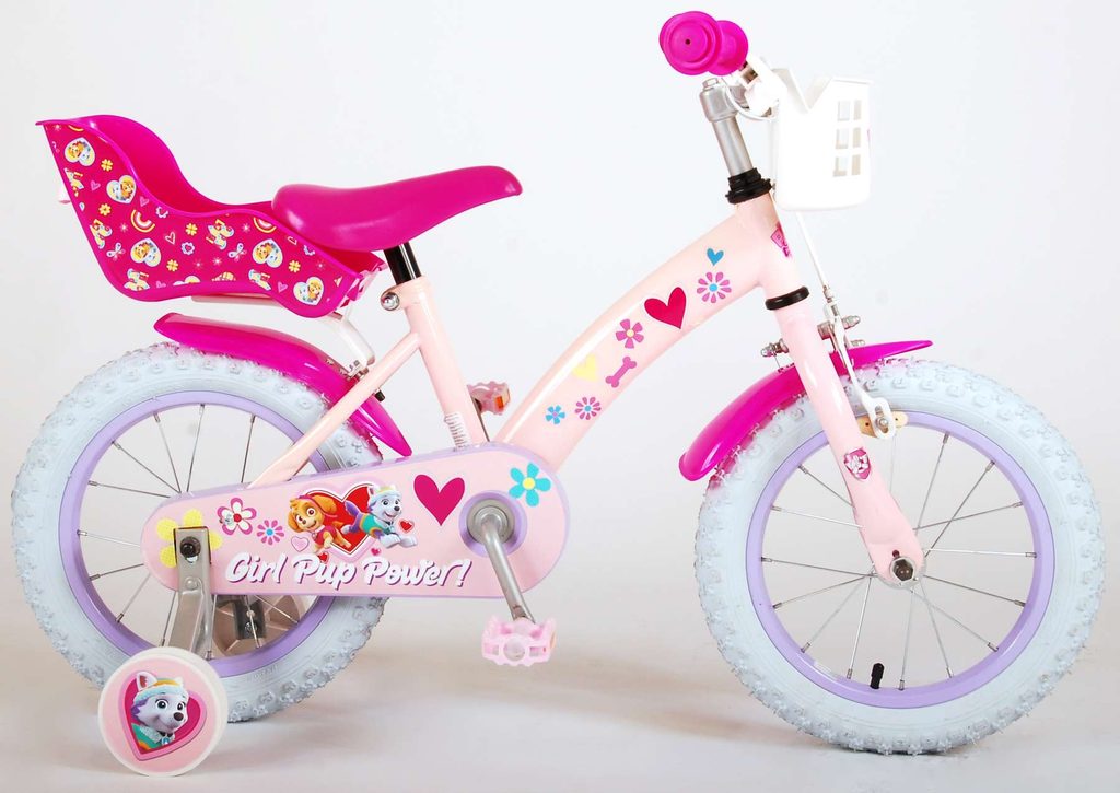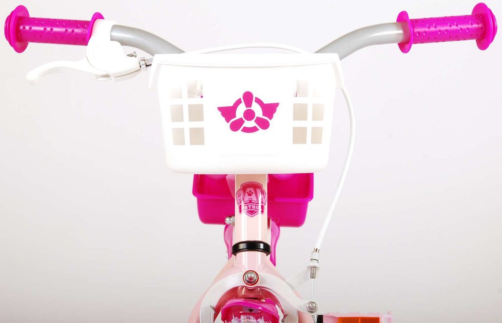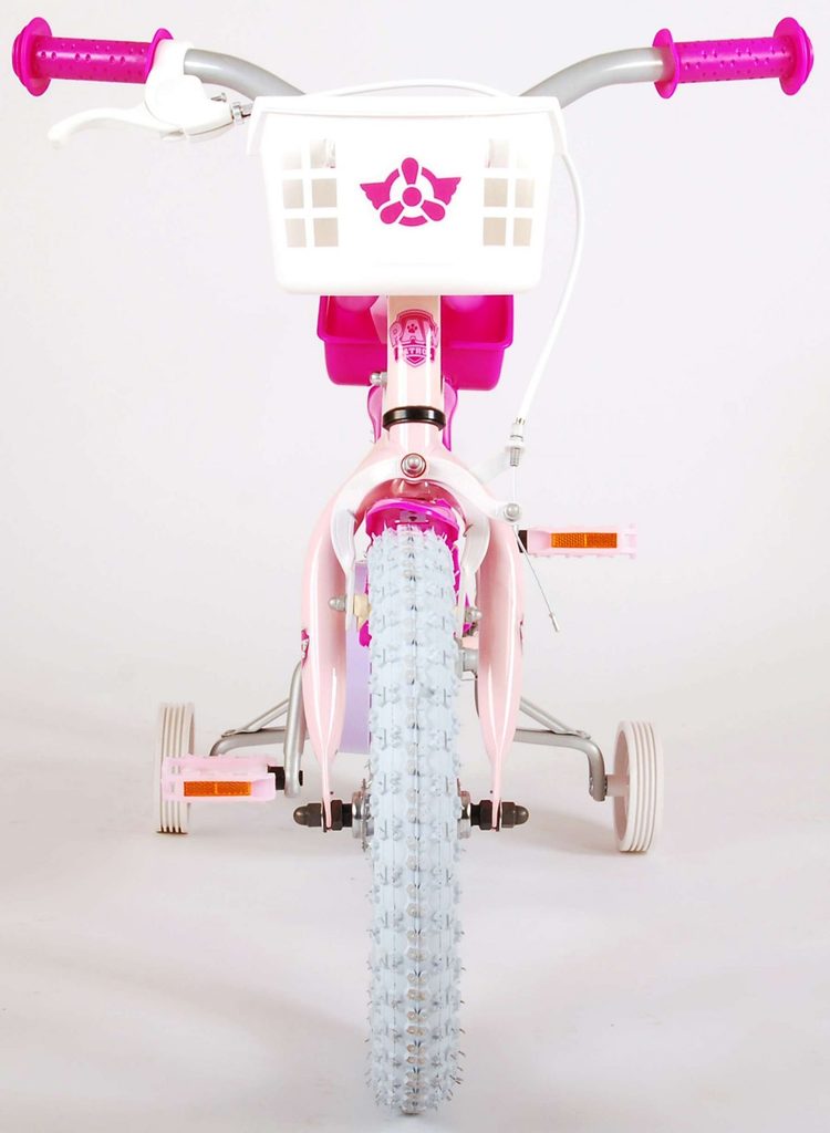 Originální dětské kolo od holandského výrobce Volare Girl Paw Patrol s velikostí ráfků 14 palců je určeno pro děti ve věku od 3,5 do 5 let s výškou do 100 cm. Kolo je opatřeno demontovatelnými balančními kolečky, dítě se tedy bude cítit hned od první jízdy bezpečně a stabilně. Kolo je vybaveno 2 druhy brzd. Brždění probíhá buď protisměrnou zadní brzdou "torpédem", která umožnuje brzdit zpětným záběrem pedálů nebo lze použít přední pákovou brzdu. Proti nechtěnému namotání nohavice nebo tkaničky do řetězu má kolo kryt s obrázky oblíbeného superhrdiny, který zakrývá celý řetěz. Sedadlo i řídítka jsou výškově nastavitelné. V zadní části je umístěný nosič na panenky a v přední části je košík na hračky.