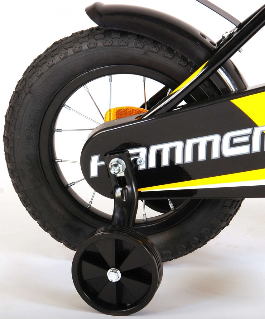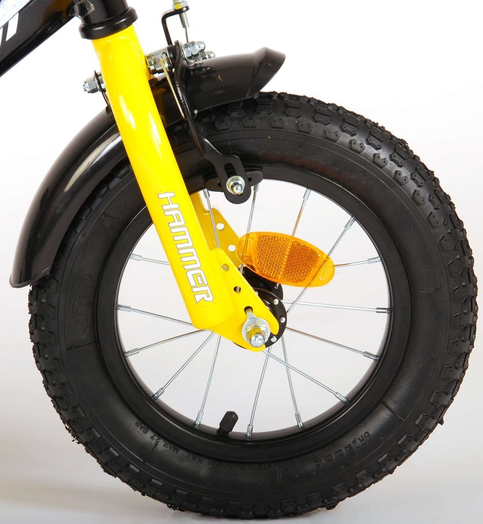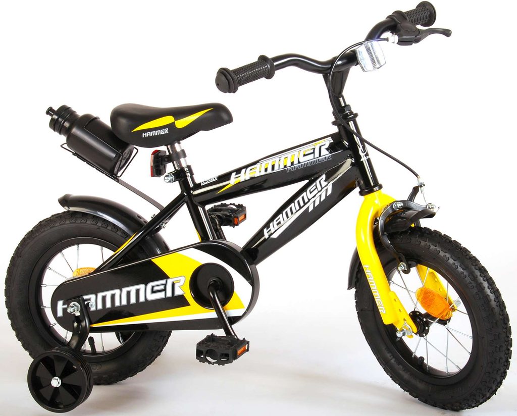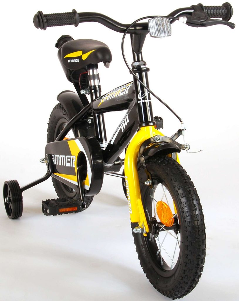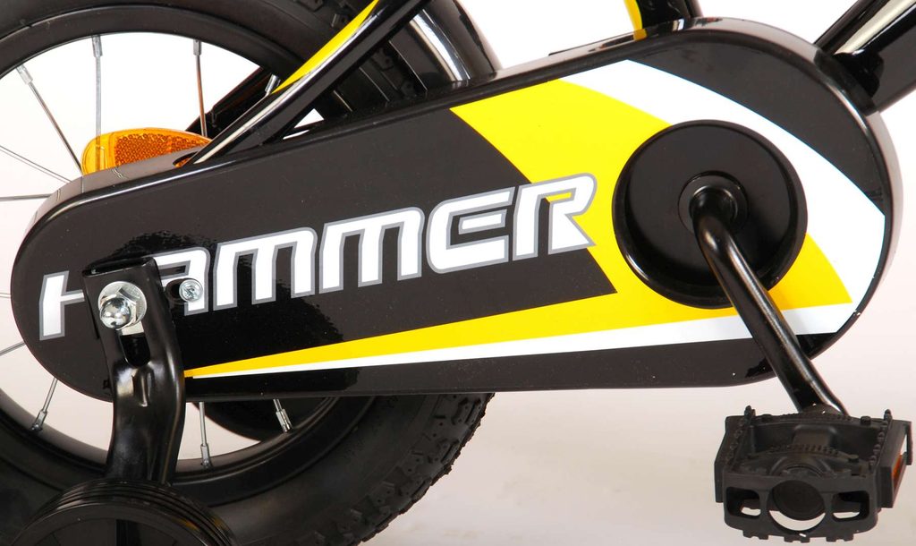 Originální dětské kolo od holandského výrobce Volare Hammer Yellow s velikostí ráfků 12 palců je určeno pro nejmenší děti ve věku od 3 do 4,5 let s výškou do 95 cm. Kolo je opatřeno demontovatelnými balančními kolečky, dítě se tedy bude cítit hned od první jízdy bezpečně a stabilně. Kolo je vybaveno 2 druhy brzd. Brždění probíhá buď protisměrnou zadní brzdou "torpédem", která umožnuje brzdit zpětným záběrem pedálů nebo lze použít přední pákovou brzdu. Proti nechtěnému namotání nohavice nebo tkaničky do řetězu má kolo kryt s barevným potiskem, který zakrývá celý řetěz. Sedadlo i řídítka jsou výškově nastavitelné. Za sedadlem je umístěný nosič s lahví na pití.