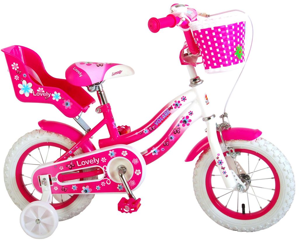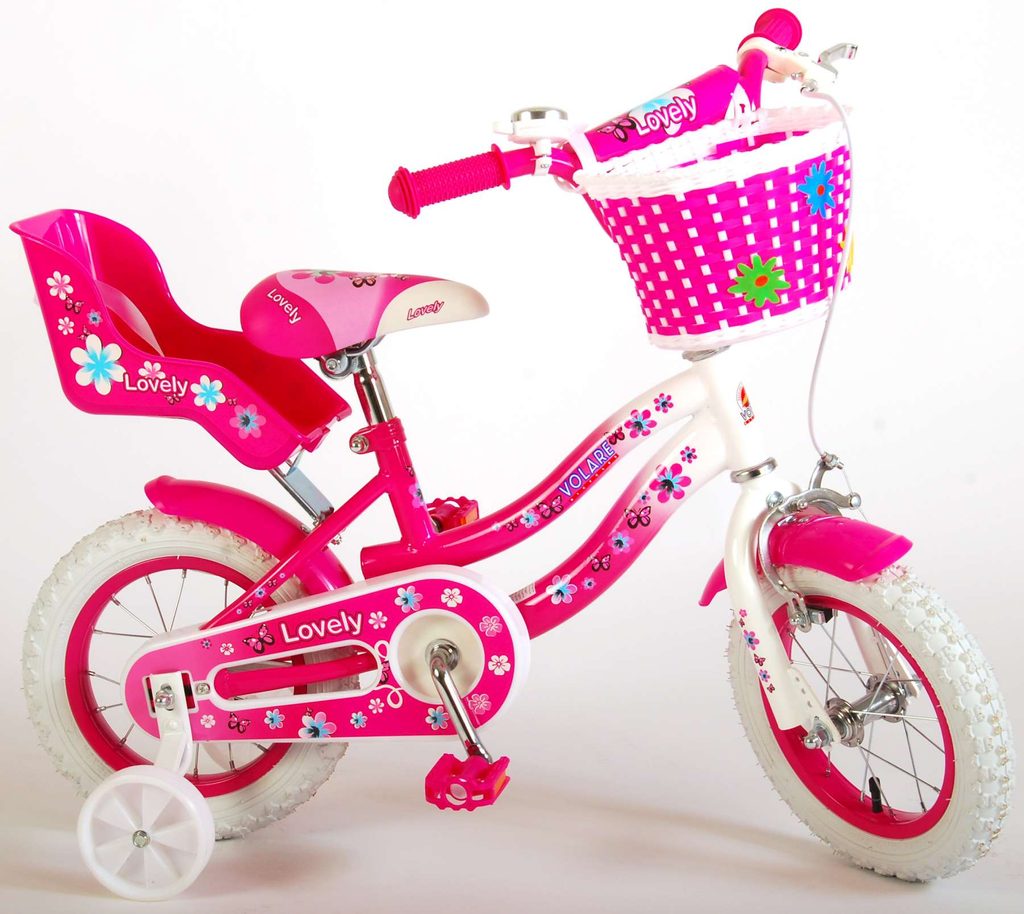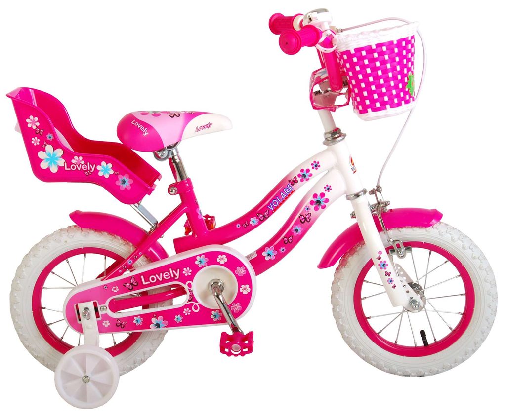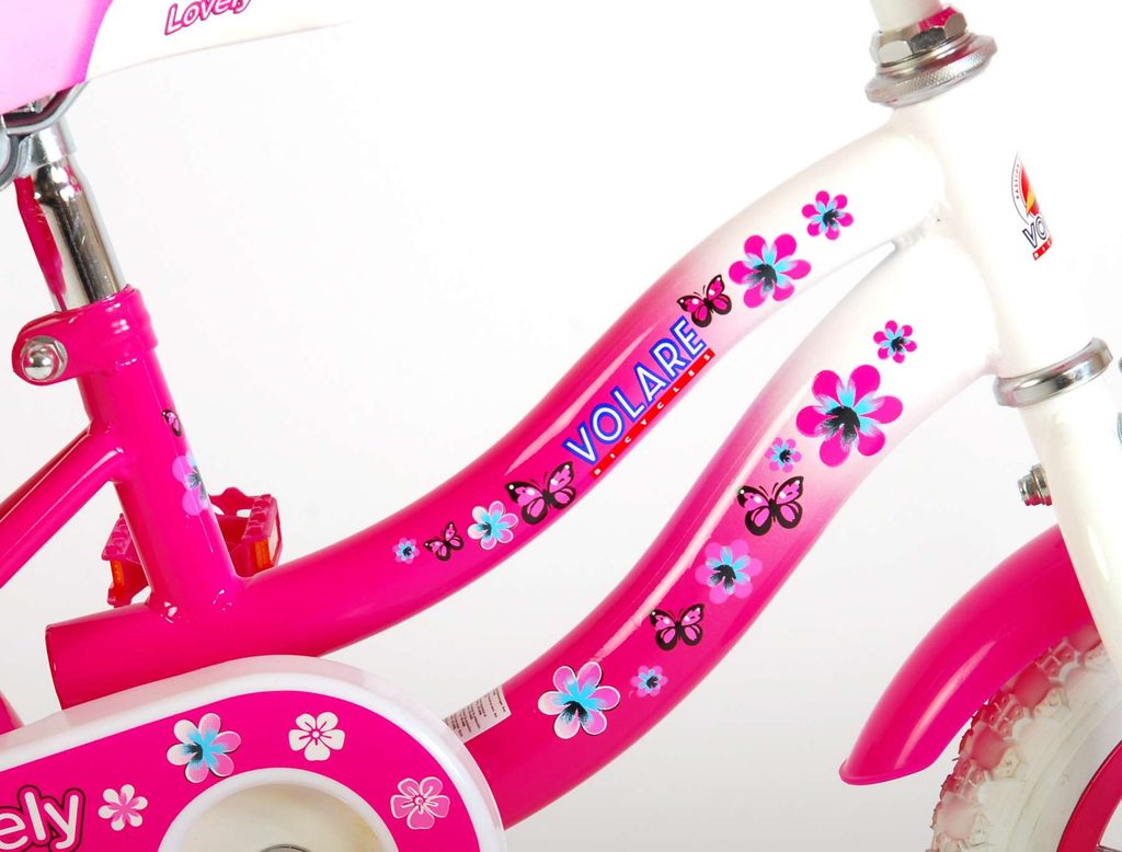 Originální dětské kolo od holandského výrobce Volare Lovely s velikostí ráfků 12 palců je určeno pro nejmenší děti ve věku od 3 do 4 let s výškou do 95 cm. Kolo je opatřeno demontovatelnými balančními kolečky, dítě se tedy bude cítit hned od první jízdy bezpečně a stabilně. Kolo je vybaveno 2 druhy brzd. Brždění probíhá buď protisměrnou zadní brzdou "torpédem", která umožnuje brzdit zpětným záběrem pedálů nebo lze použít přední pákovou brzdu. Proti nechtěnému namotání nohavice nebo tkaničky do řetězu má kolo kryt s barevným potiskem, který zakrývá celý řetěz. Sedadlo i řídítka jsou výškově nastavitelné. Na řídítkách je umístěn plastový košíček. V zadní části je připevněný nosič na panenku.