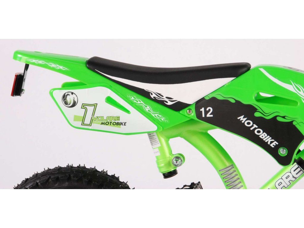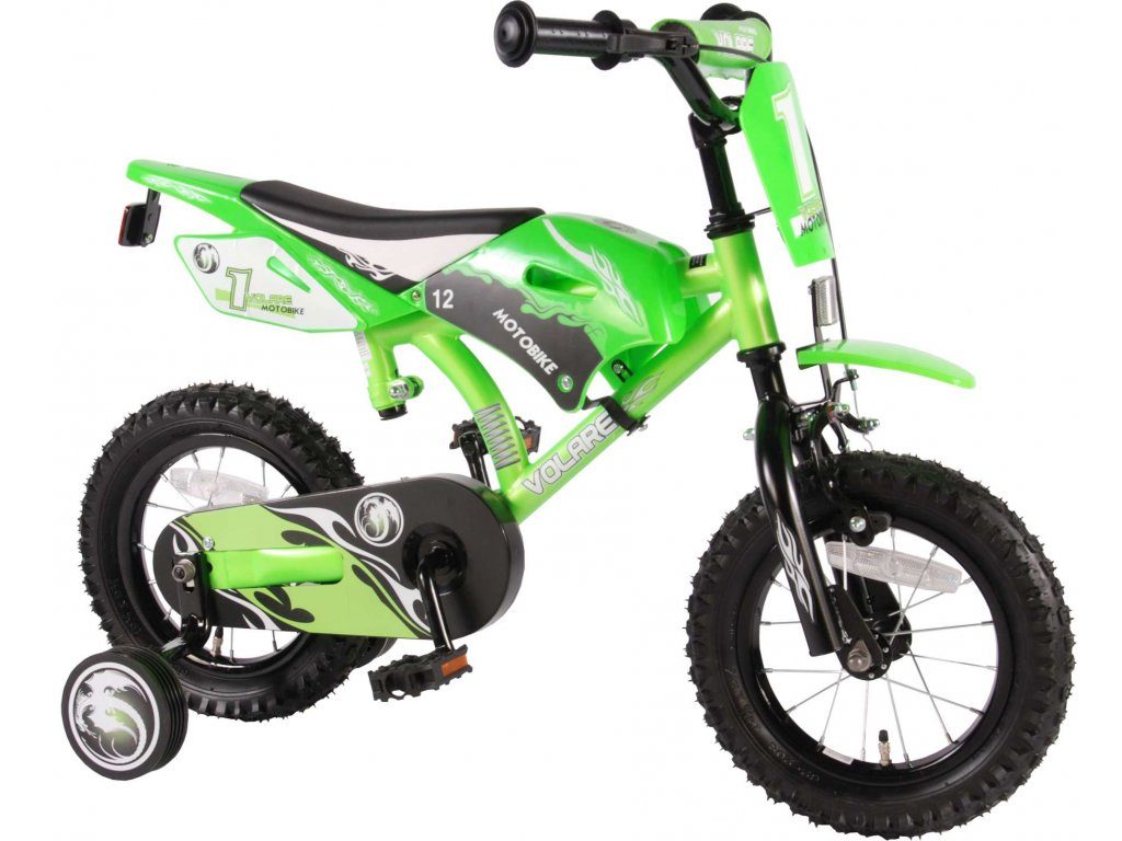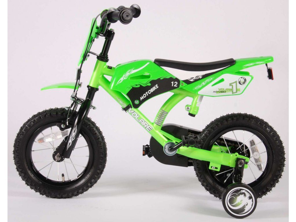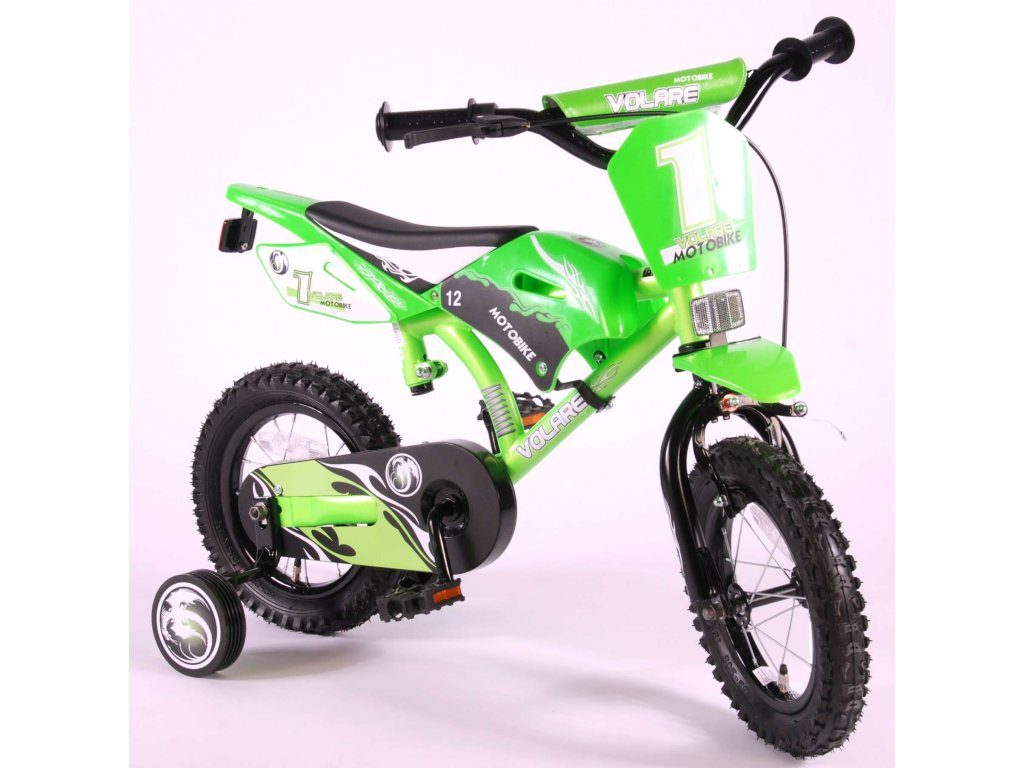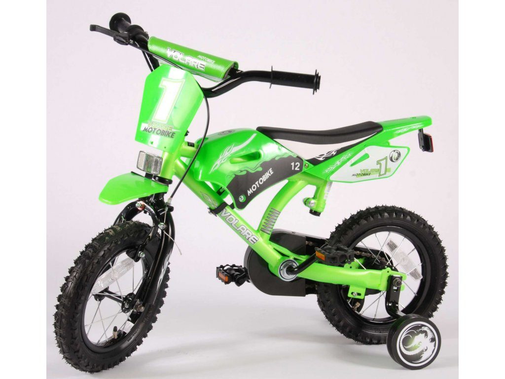 Originální dětské kolo se vzhledem motorky od holandského výrobce Volare Motobike Green s velikostí ráfků 12 palců je určeno pro děti ve věku od 3 do 4,5 let s výškou do 95 cm. Kolo je opatřeno demontovatelnými balančními kolečky, dítě se tedy bude cítit hned od první jízdy bezpečně a stabilně. Kolo je vybaveno 2 druhy brzd a extra širokými pneumatikami. Brždění probíhá buď protisměrnou zadní brzdou "torpédem",která možnuje brzdit zpětným záběrem pedálů nebo lze použít přední pákovou brzdu. Proti nechtěnému namotání nohavice nebo tkaničky do řetězu má kolo barevný kryt, který zakrývá celý řetěz. Sedadlo i řídítka jsou výškově nastavitelné.