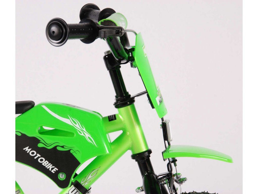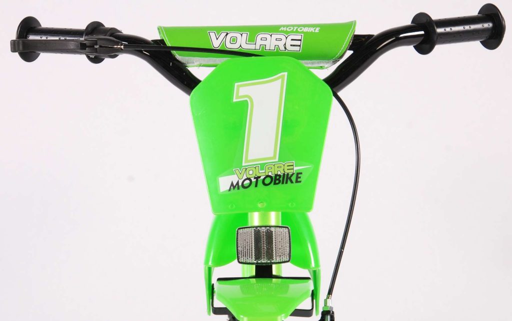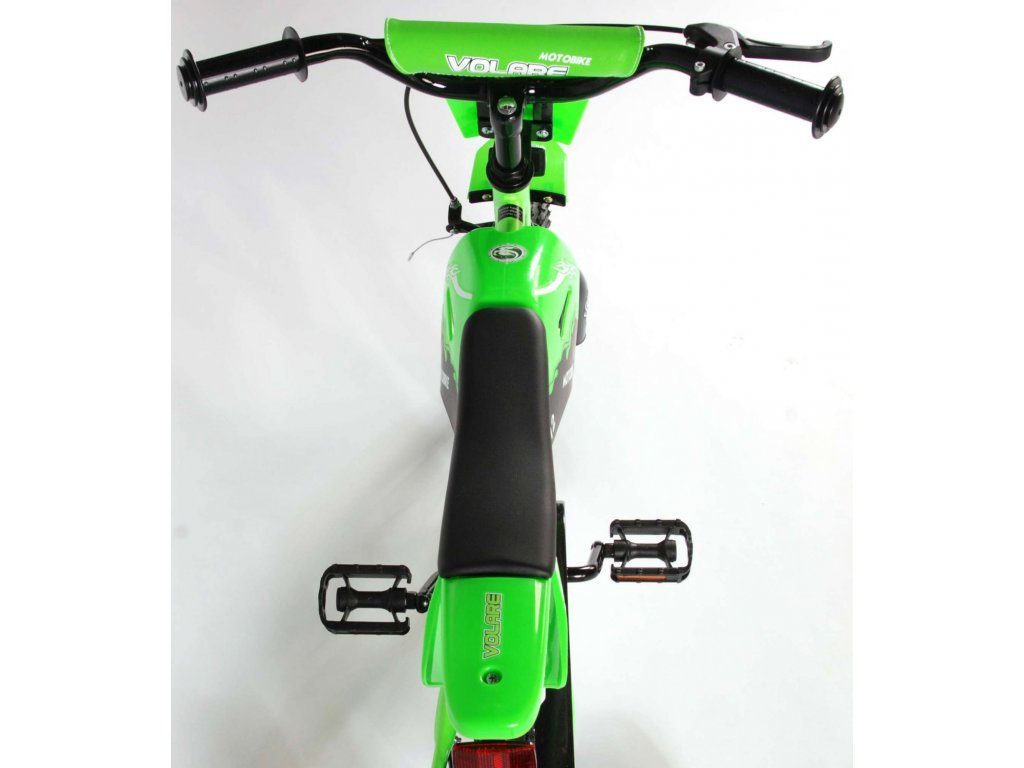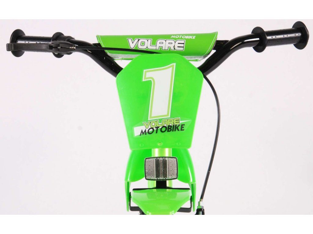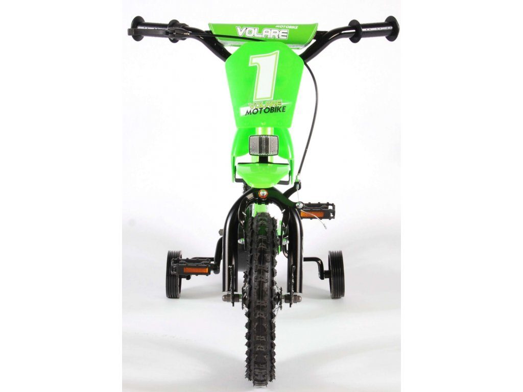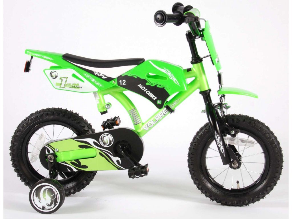 Originální dětské kolo se vzhledem motorky od holandského výrobce Volare Motobike Green s velikostí ráfků 12 palců je určeno pro děti ve věku od 3 do 4,5 let s výškou do 95 cm. Kolo je opatřeno demontovatelnými balančními kolečky, dítě se tedy bude cítit hned od první jízdy bezpečně a stabilně. Kolo je vybaveno 2 druhy brzd a extra širokými pneumatikami. Brždění probíhá buď protisměrnou zadní brzdou "torpédem",která možnuje brzdit zpětným záběrem pedálů nebo lze použít přední pákovou brzdu. Proti nechtěnému namotání nohavice nebo tkaničky do řetězu má kolo barevný kryt, který zakrývá celý řetěz. Sedadlo i řídítka jsou výškově nastavitelné.