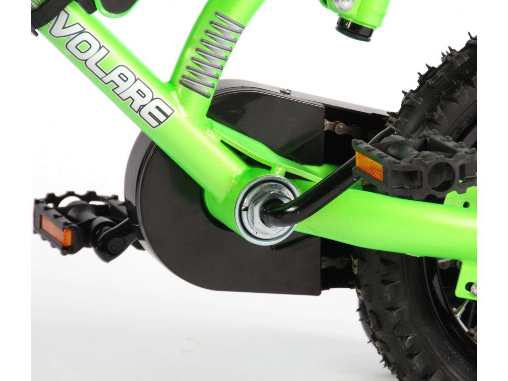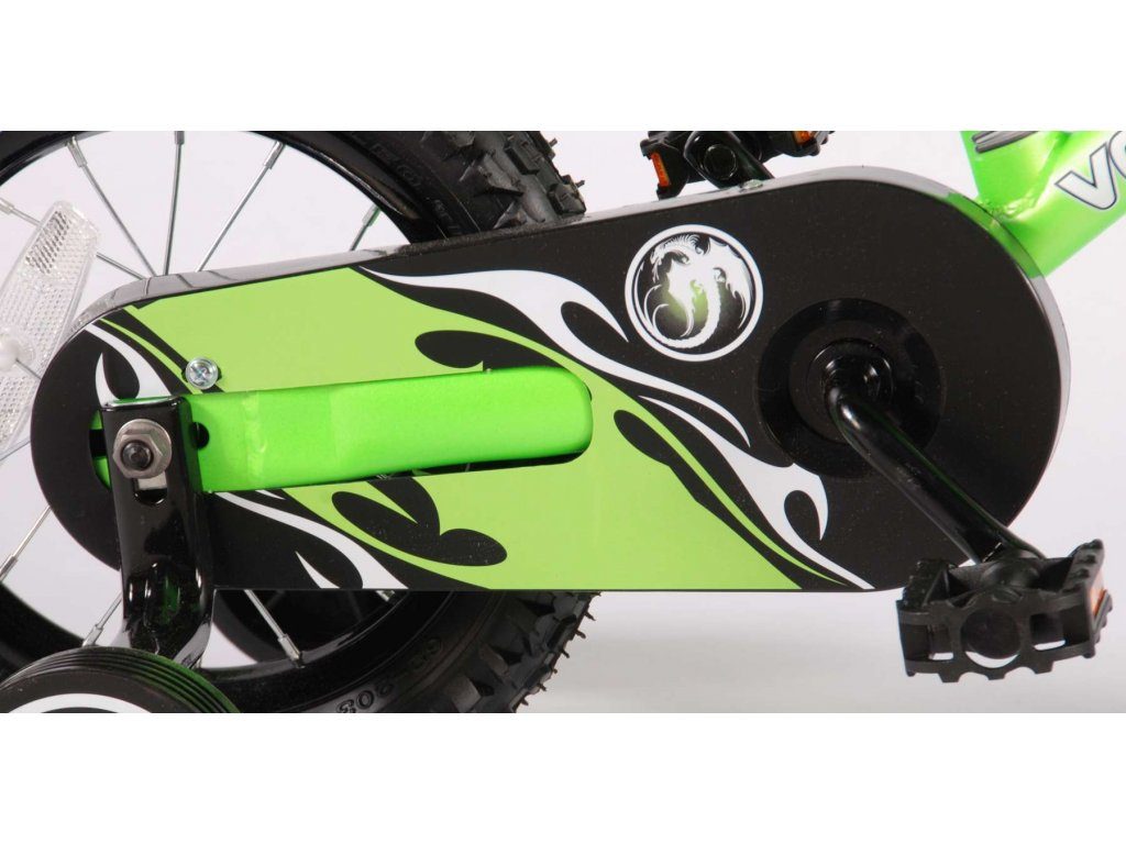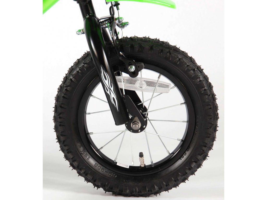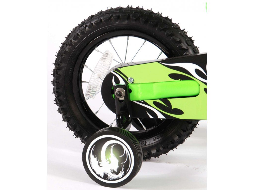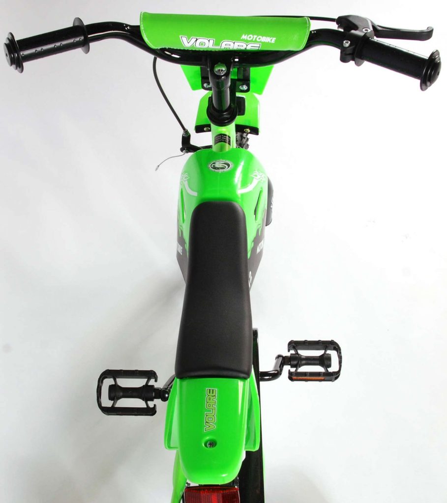 Originální dětské kolo se vzhledem motorky od holandského výrobce Volare Motobike Green s velikostí ráfků 12 palců je určeno pro děti ve věku od 3 do 4,5 let s výškou do 95 cm. Kolo je opatřeno demontovatelnými balančními kolečky, dítě se tedy bude cítit hned od první jízdy bezpečně a stabilně. Kolo je vybaveno 2 druhy brzd a extra širokými pneumatikami. Brždění probíhá buď protisměrnou zadní brzdou "torpédem",která možnuje brzdit zpětným záběrem pedálů nebo lze použít přední pákovou brzdu. Proti nechtěnému namotání nohavice nebo tkaničky do řetězu má kolo barevný kryt, který zakrývá celý řetěz. Sedadlo i řídítka jsou výškově nastavitelné.