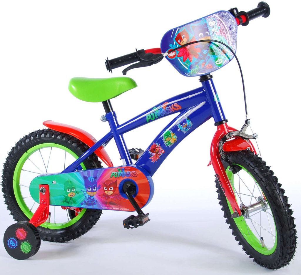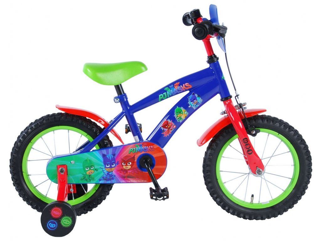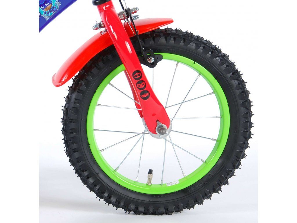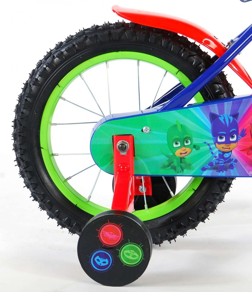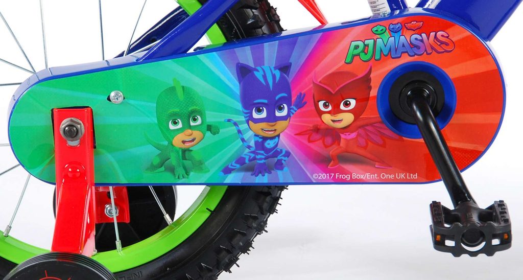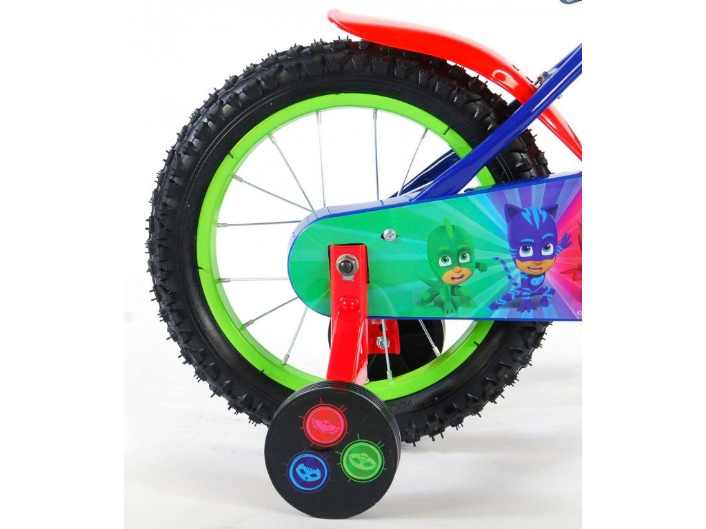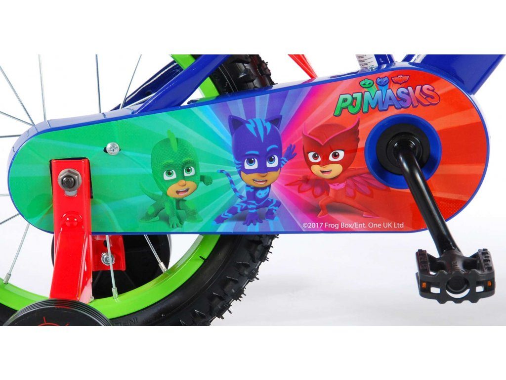 Originální dětské kolo od holandského výrobce Volare PJ Masks s velikostí ráfků 14 palců je určeno pro děti ve věku od 3,5 do 5 let s výškou do 100 cm. Kolo je opatřeno demontovatelnými balančními kolečky, dítě se tedy bude cítit hned od první jízdy bezpečně a stabilně. Kolo je vybaveno 2 druhy brzd. Brždění probíhá buď protisměrnou zadní brzdou "torpédem",která možnuje brzdit zpětným záběrem pedálů nebo lze použít přední pákovou brzdu. Proti nechtěnému namotání nohavice nebo tkaničky do řetězu má kolo kryt s barevným potiskem, který zakrývá celý řetěz. Sedadlo i řídítka jsou výškově nastavitelné. Za sedadlem je umístěný nosič s lahví na pití.