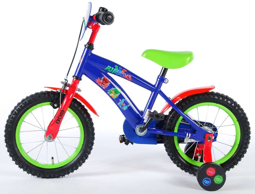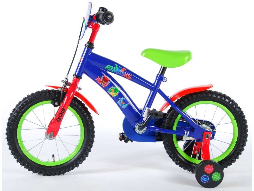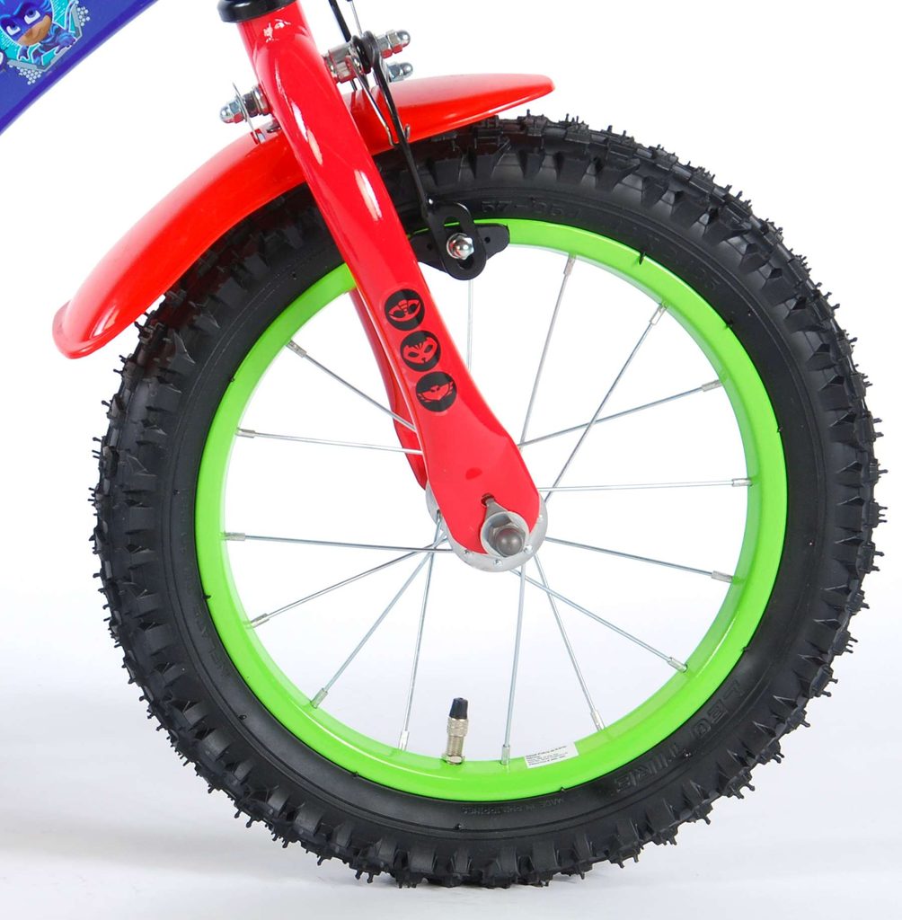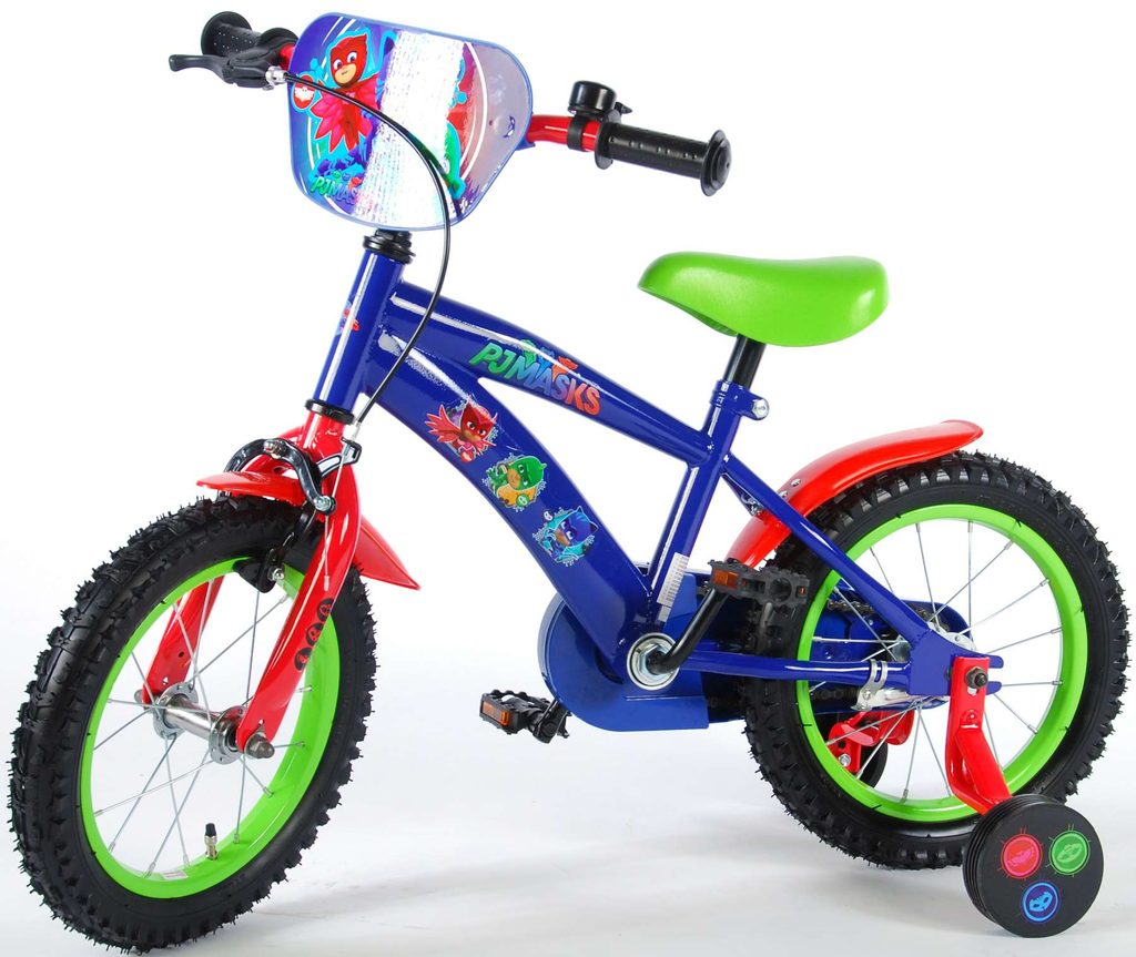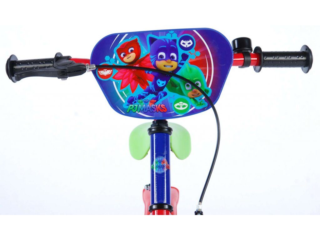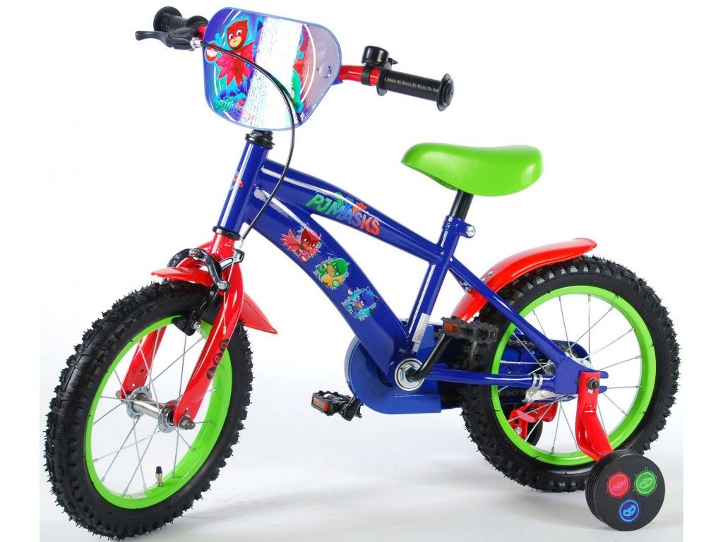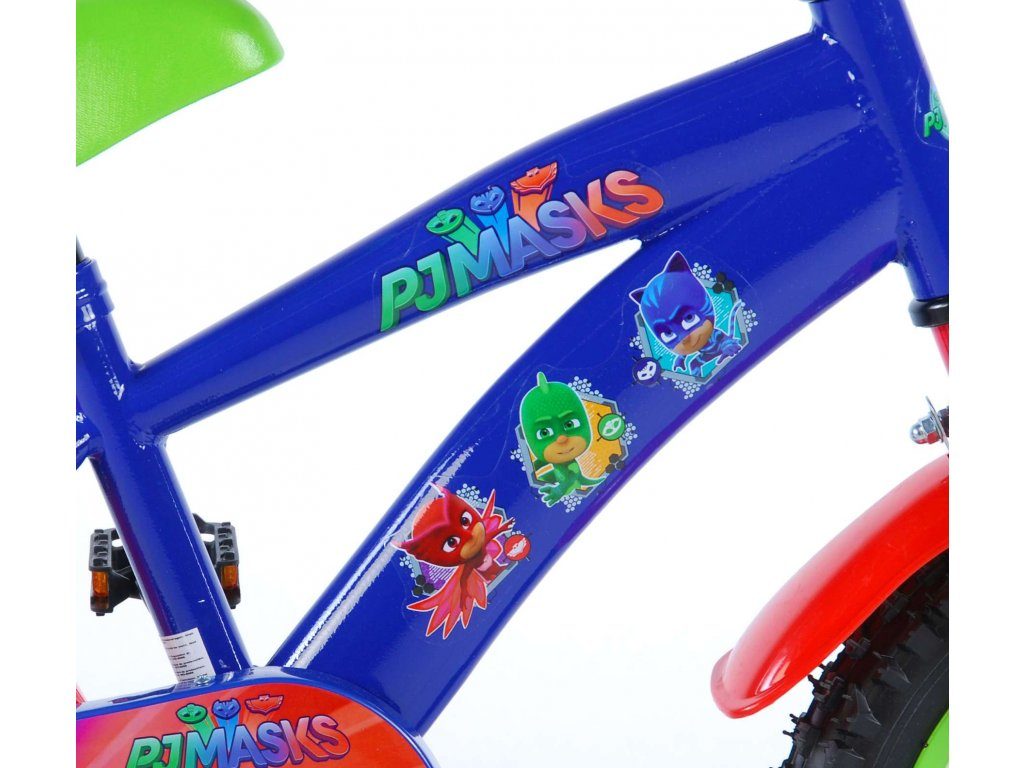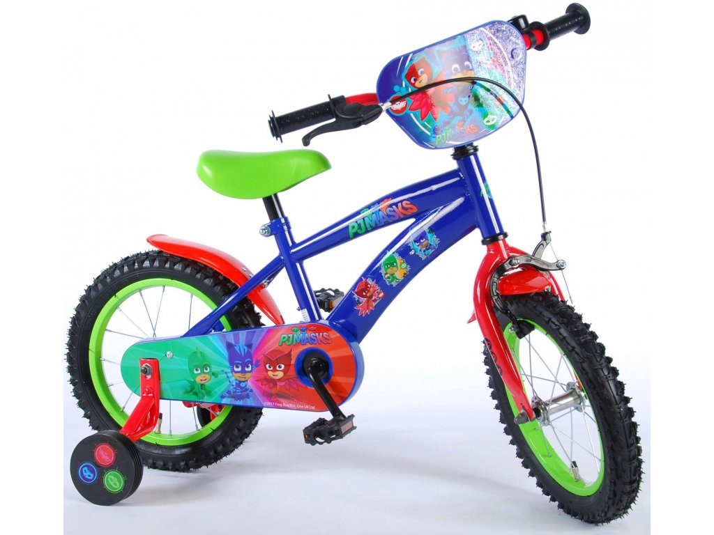 Originální dětské kolo od holandského výrobce Volare PJ Masks s velikostí ráfků 14 palců je určeno pro děti ve věku od 3,5 do 5 let s výškou do 100 cm. Kolo je opatřeno demontovatelnými balančními kolečky, dítě se tedy bude cítit hned od první jízdy bezpečně a stabilně. Kolo je vybaveno 2 druhy brzd. Brždění probíhá buď protisměrnou zadní brzdou "torpédem",která možnuje brzdit zpětným záběrem pedálů nebo lze použít přední pákovou brzdu. Proti nechtěnému namotání nohavice nebo tkaničky do řetězu má kolo kryt s barevným potiskem, který zakrývá celý řetěz. Sedadlo i řídítka jsou výškově nastavitelné. Za sedadlem je umístěný nosič s lahví na pití.