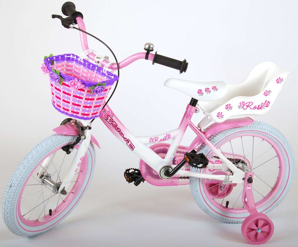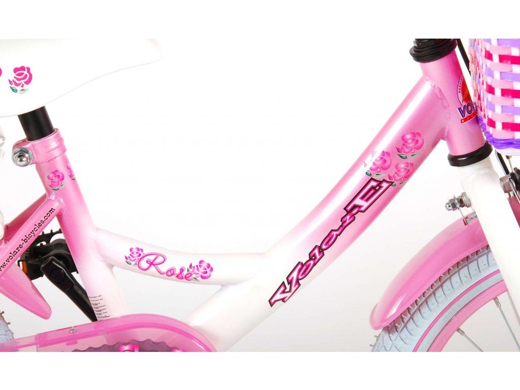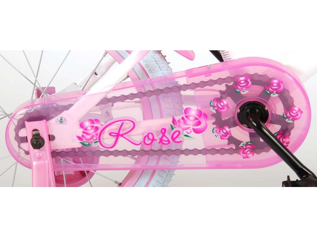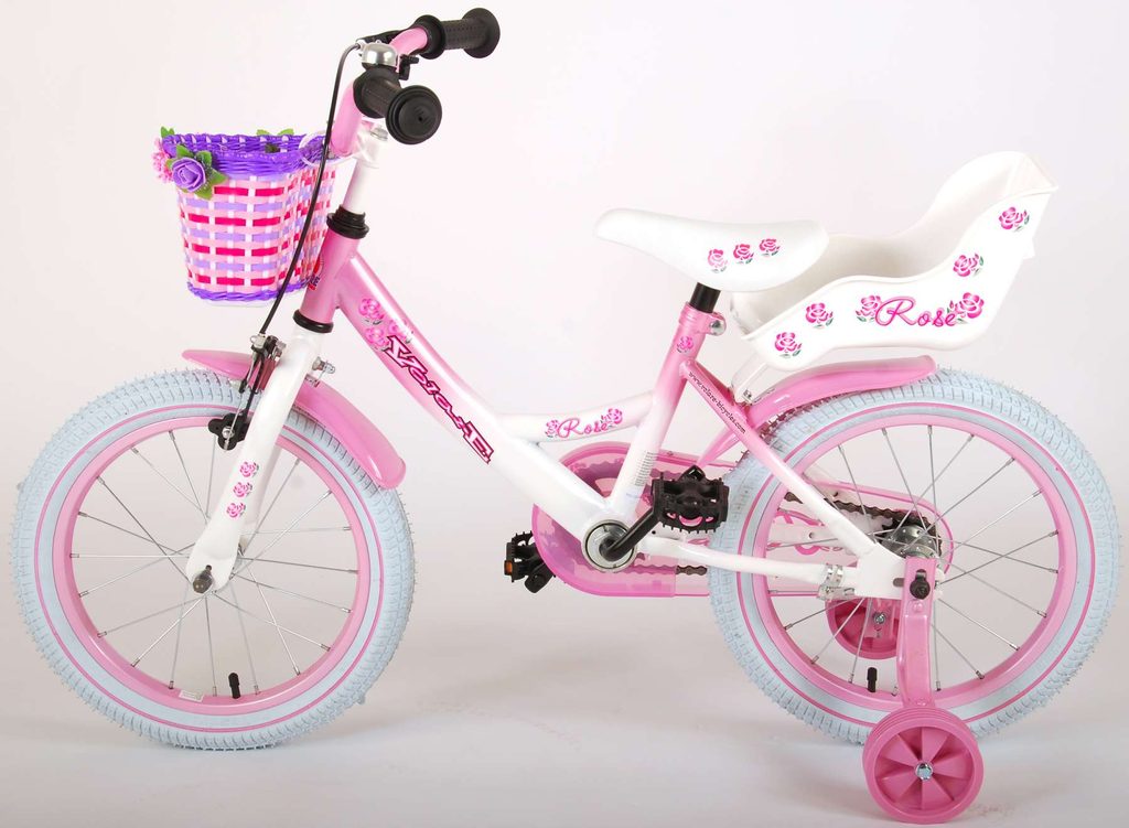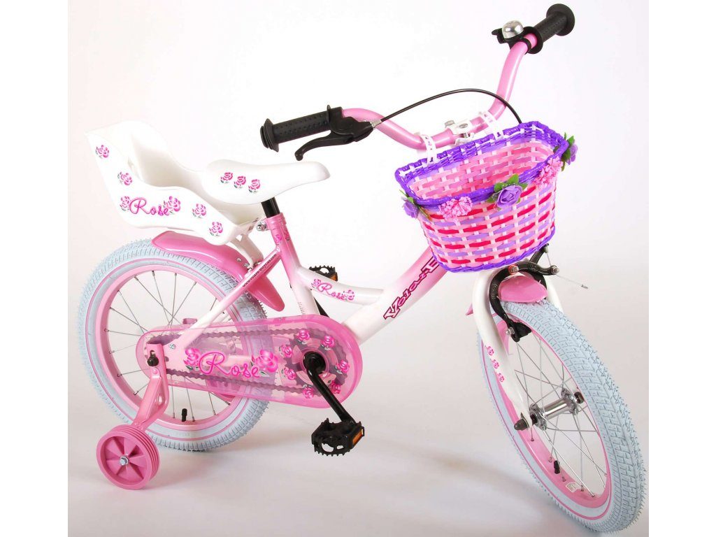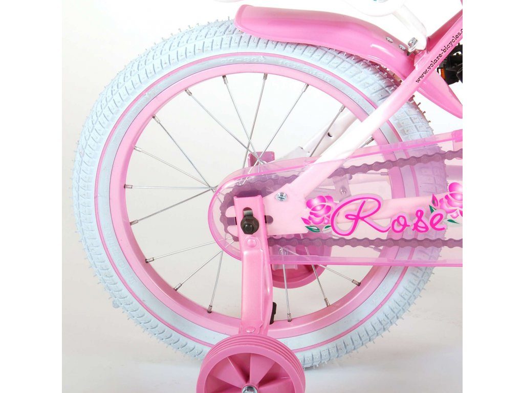 Originální dětské kolo od holandského výrobce Volare Rose s velikostí ráfků 16 palců je určeno pro děti ve věku od 4 do 6 let s výškou do 105 cm. Kolo je opatřeno demontovatelnými balančními kolečky, dítě se tedy bude cítit hned od první jízdy bezpečně a stabilně. Kolo je vybaveno 2 druhy brzd. Brždění probíhá buď protisměrnou zadní brzdou "torpédem", která možnuje brzdit zpětným záběrem pedálů nebo lze použít přední pákovou brzdu. Proti nechtěnému namotání nohavice nebo tkaničky do řetězu má kolo kryt s barevným potiskem, který zakrývá celý řetěz. Sedadlo i řídítka jsou výškově nastavitelné. Na řídítkách je umístěn košíček a zvonek. V zadní části je připevněný nosič na panenky.