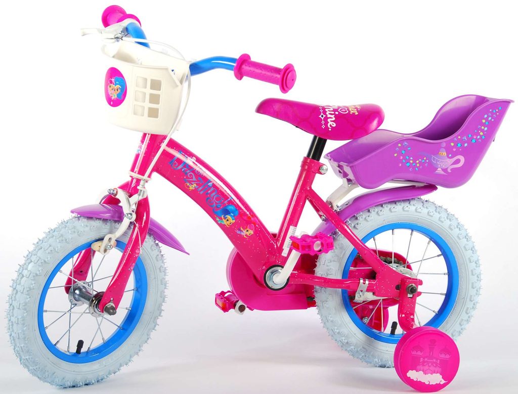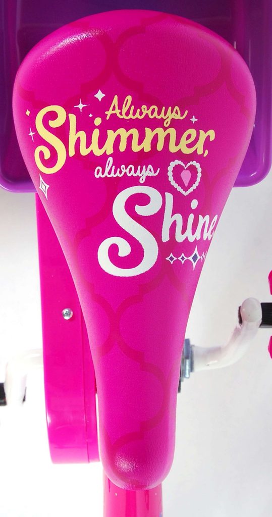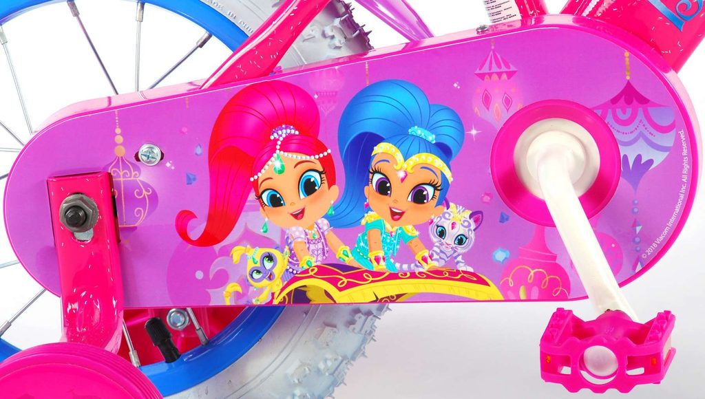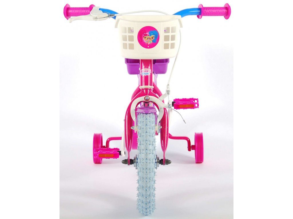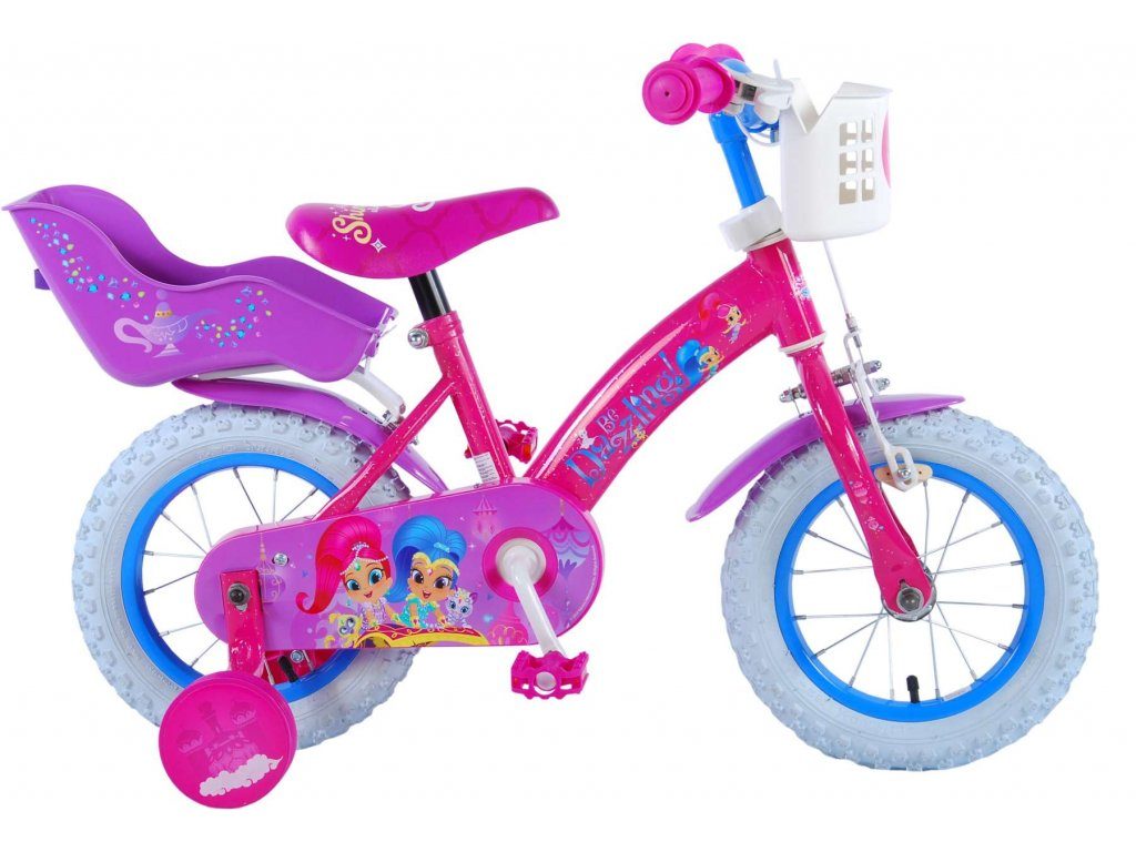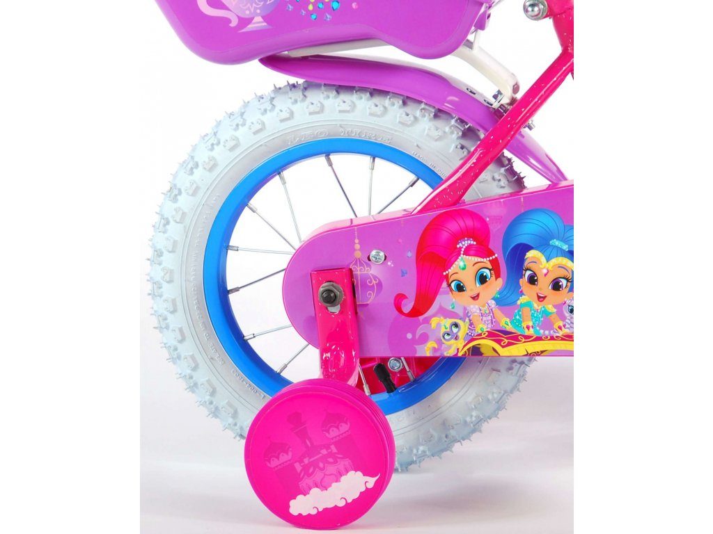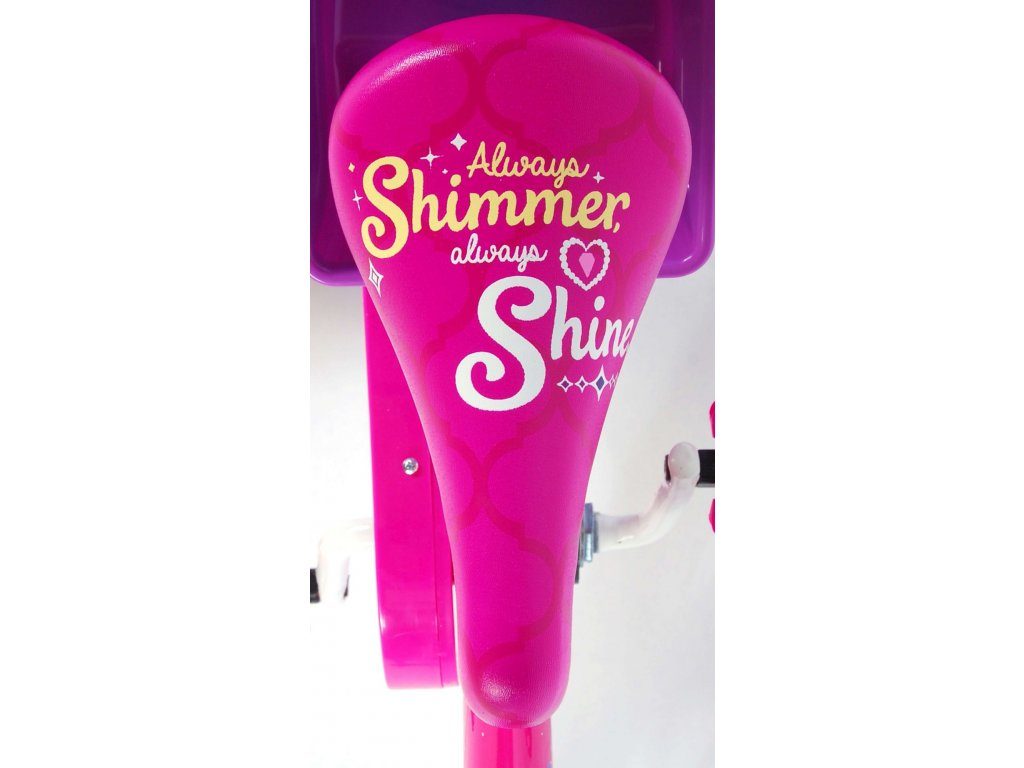 Originální dětské kolo od holandského výrobce Volare Shimmer&Shine s velikostí ráfků 12 palců je určeno pro nejmenší děti ve věku od 3 do 4 let s výškou do 95 cm. Kolo je opatřeno demontovatelnými balančními kolečky, dítě se tedy bude cítit hned od první jízdy bezpečně a stabilně. Kolo je vybaveno 2 druhy brzd. Brždění probíhá buď protisměrnou zadní brzdou "torpédem", která možnuje brzdit zpětným záběrem pedálů nebo lze použít přední pákovou brzdu. Proti nechtěnému namotání nohavice nebo tkaničky do řetězu má kolo kryt s barevným potiskem, který zakrývá celý řetěz. Sedadlo i řídítka jsou výškově nastavitelné. Na řídítkách je umístěn plastový košíček. V zadní části je připevněný nosič na panenku.