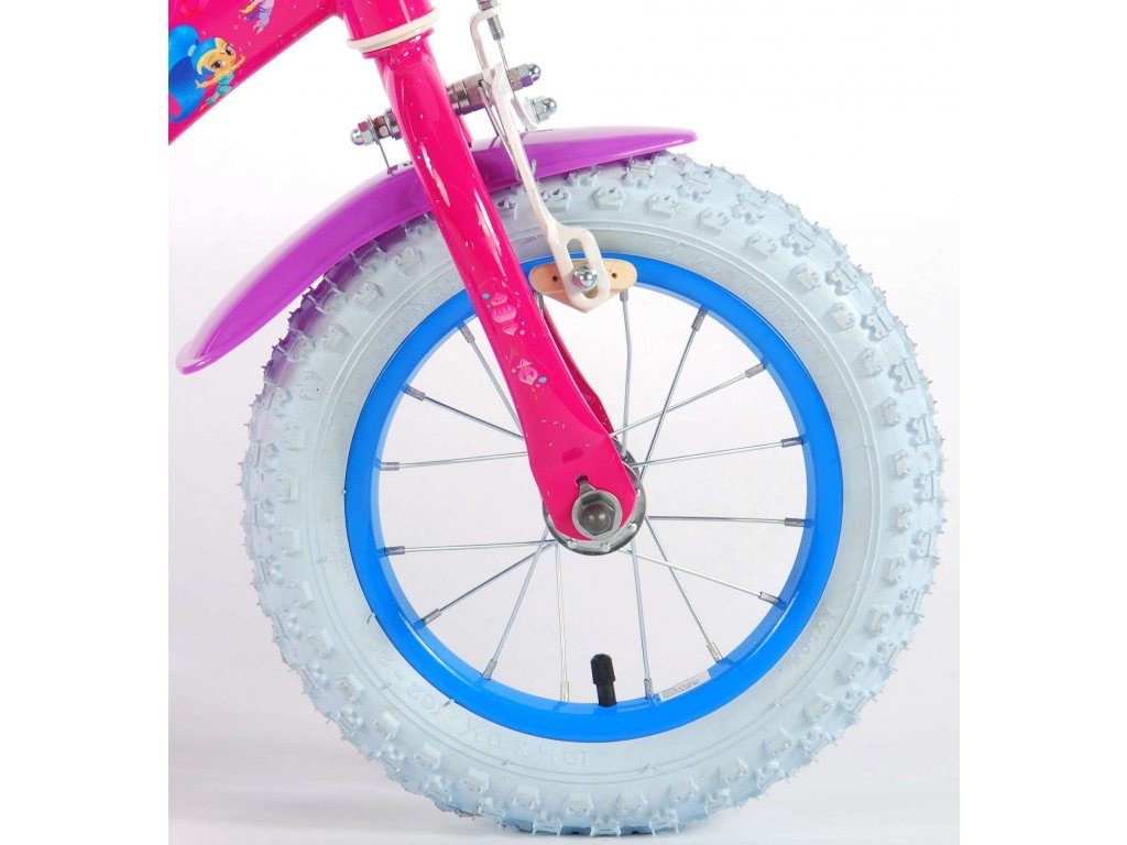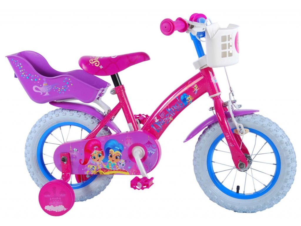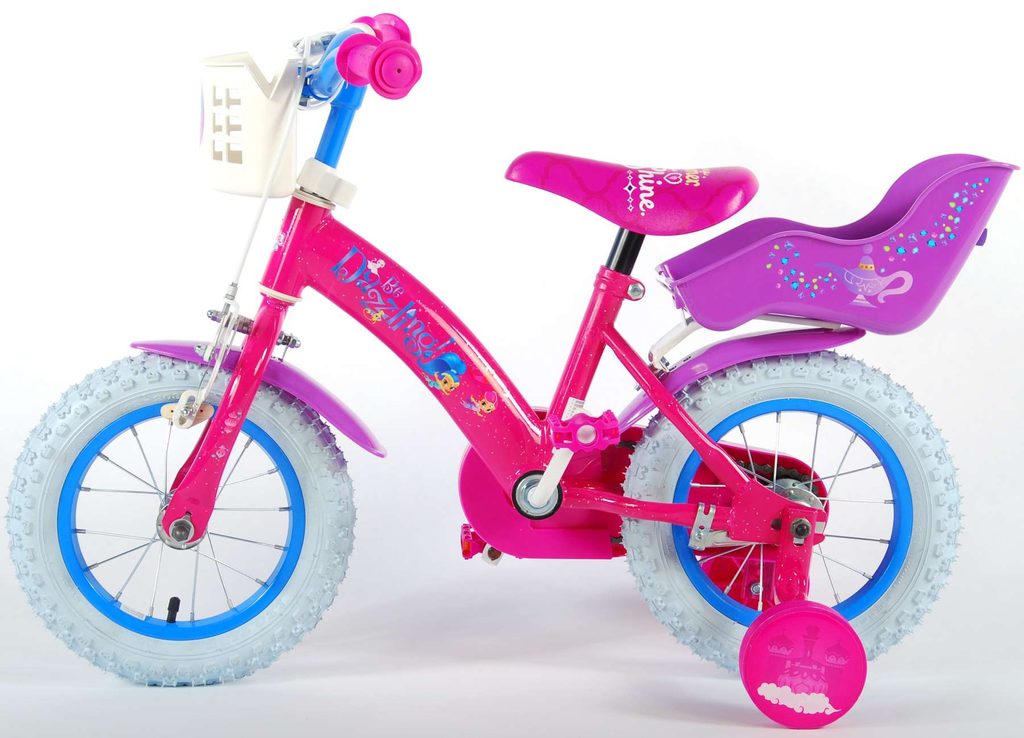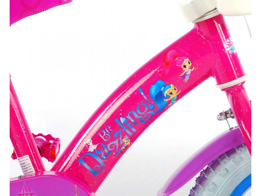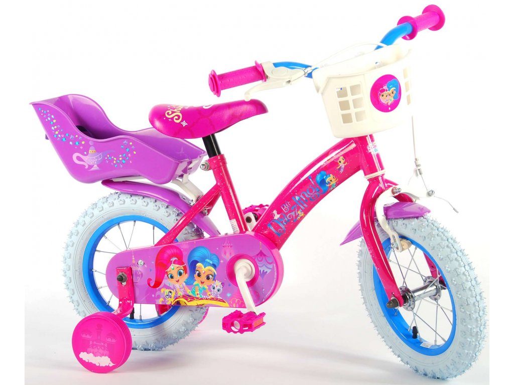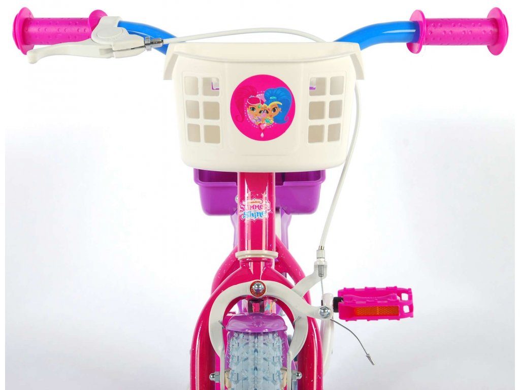 Originální dětské kolo od holandského výrobce Volare Shimmer&Shine s velikostí ráfků 12 palců je určeno pro nejmenší děti ve věku od 3 do 4 let s výškou do 95 cm. Kolo je opatřeno demontovatelnými balančními kolečky, dítě se tedy bude cítit hned od první jízdy bezpečně a stabilně. Kolo je vybaveno 2 druhy brzd. Brždění probíhá buď protisměrnou zadní brzdou "torpédem", která možnuje brzdit zpětným záběrem pedálů nebo lze použít přední pákovou brzdu. Proti nechtěnému namotání nohavice nebo tkaničky do řetězu má kolo kryt s barevným potiskem, který zakrývá celý řetěz. Sedadlo i řídítka jsou výškově nastavitelné. Na řídítkách je umístěn plastový košíček. V zadní části je připevněný nosič na panenku.