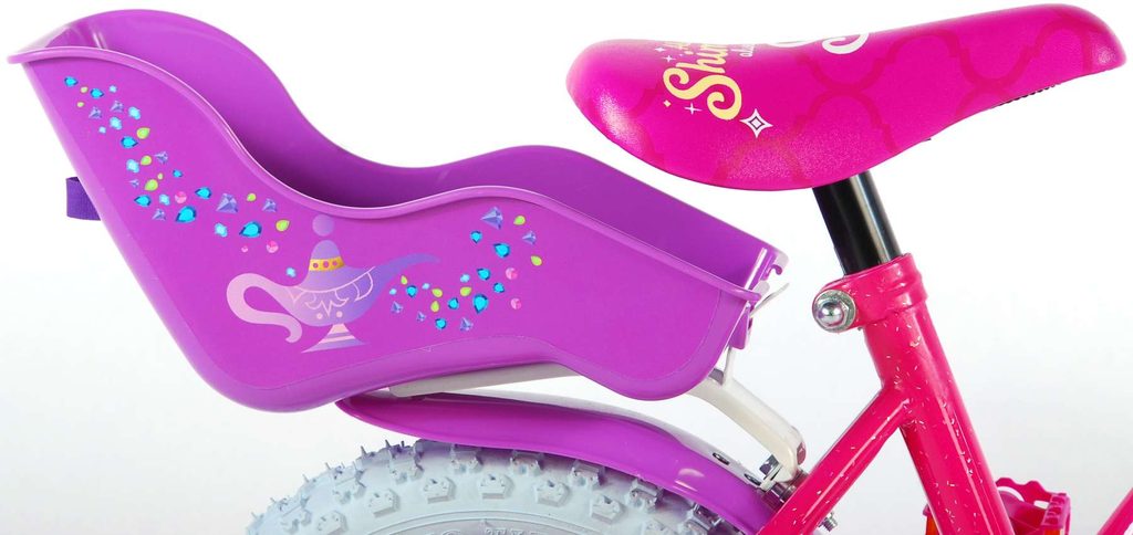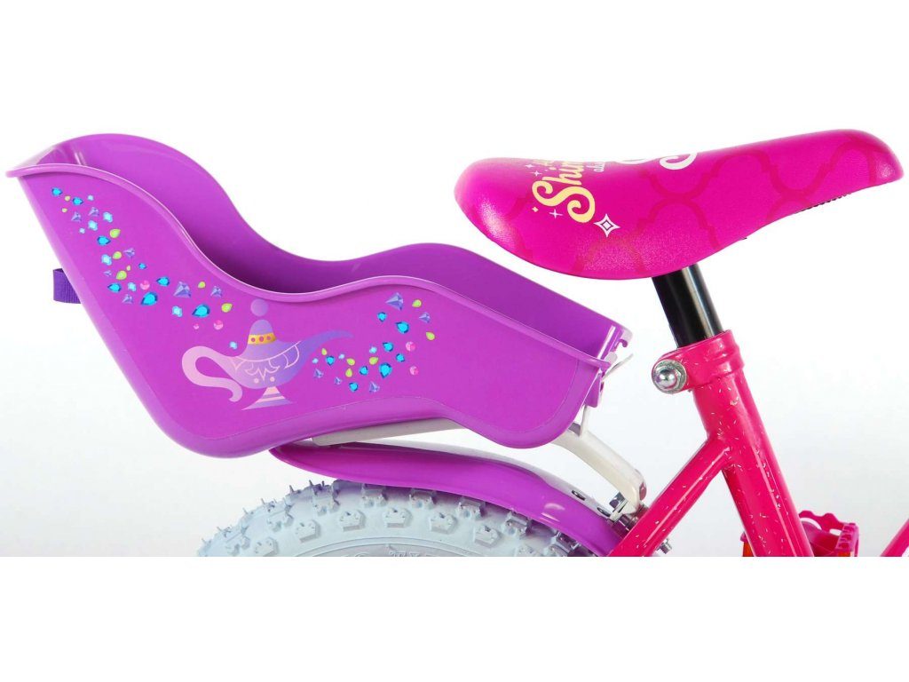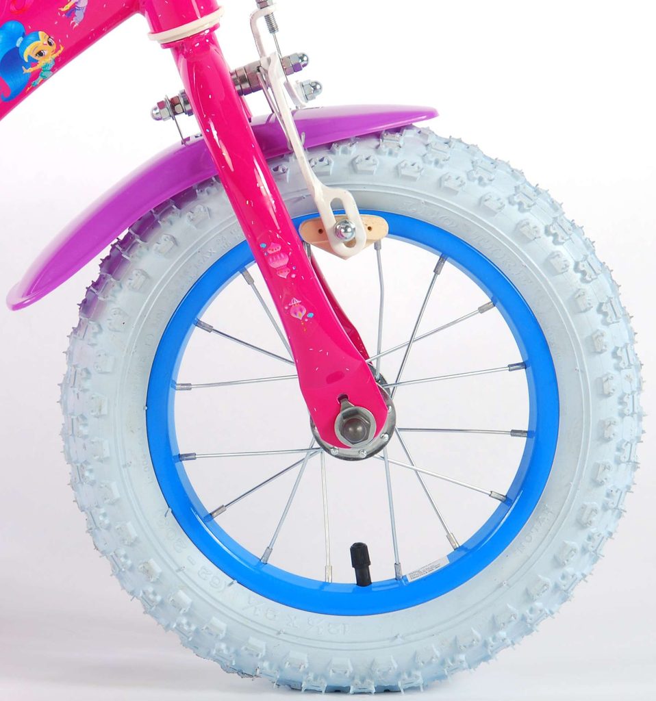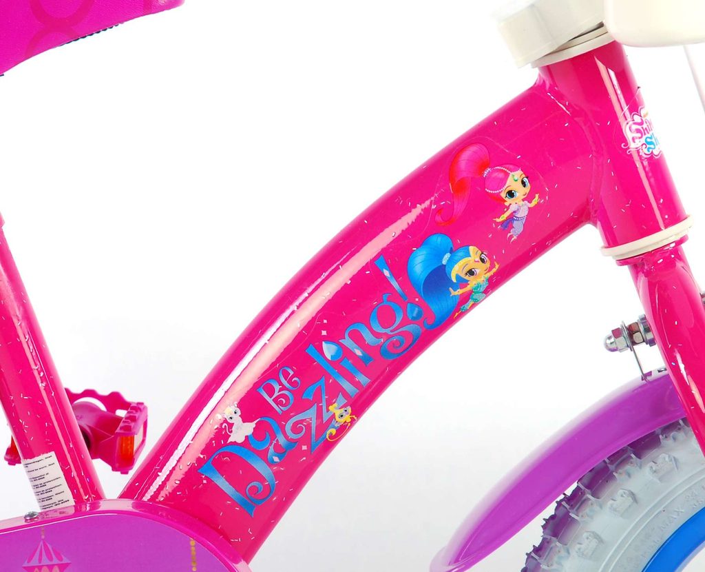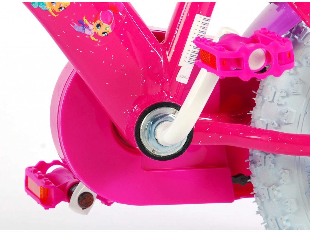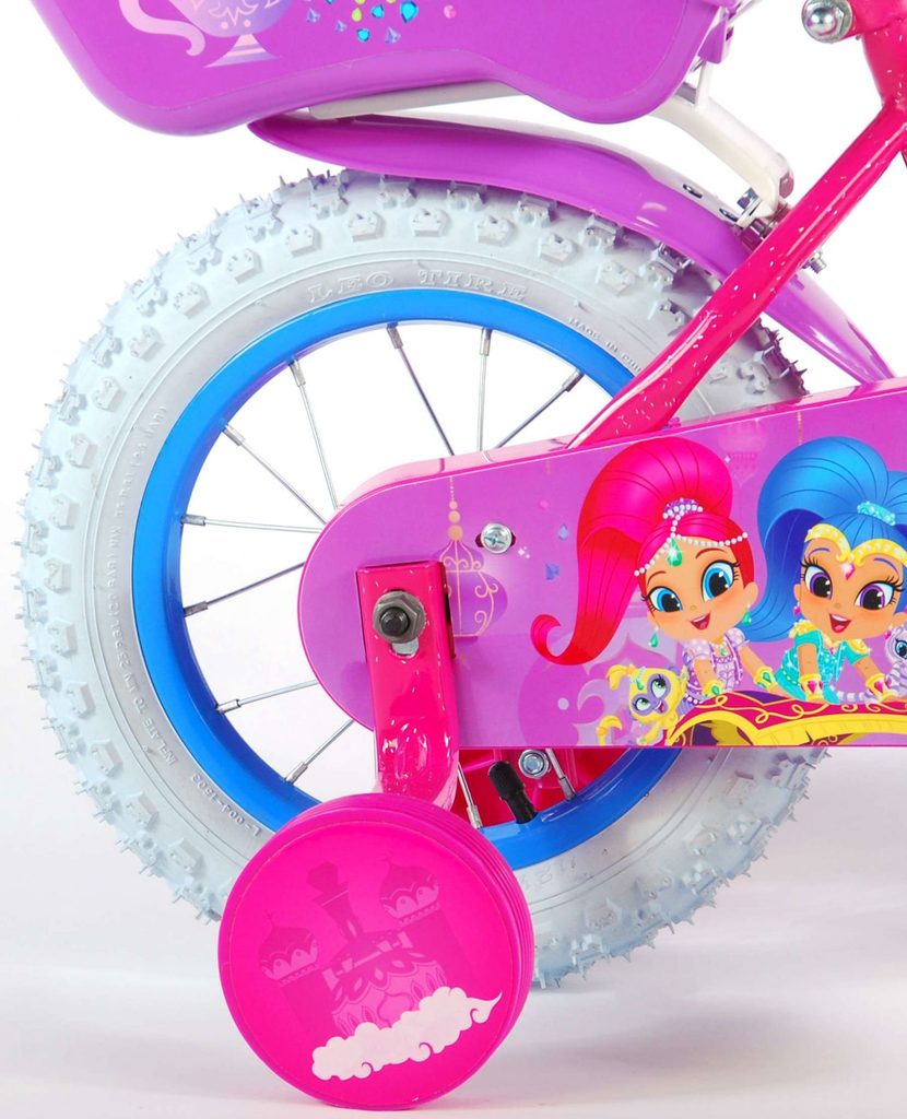 Originální dětské kolo od holandského výrobce Volare Shimmer&Shine s velikostí ráfků 12 palců je určeno pro nejmenší děti ve věku od 3 do 4 let s výškou do 95 cm. Kolo je opatřeno demontovatelnými balančními kolečky, dítě se tedy bude cítit hned od první jízdy bezpečně a stabilně. Kolo je vybaveno 2 druhy brzd. Brždění probíhá buď protisměrnou zadní brzdou "torpédem", která možnuje brzdit zpětným záběrem pedálů nebo lze použít přední pákovou brzdu. Proti nechtěnému namotání nohavice nebo tkaničky do řetězu má kolo kryt s barevným potiskem, který zakrývá celý řetěz. Sedadlo i řídítka jsou výškově nastavitelné. Na řídítkách je umístěn plastový košíček. V zadní části je připevněný nosič na panenku.
