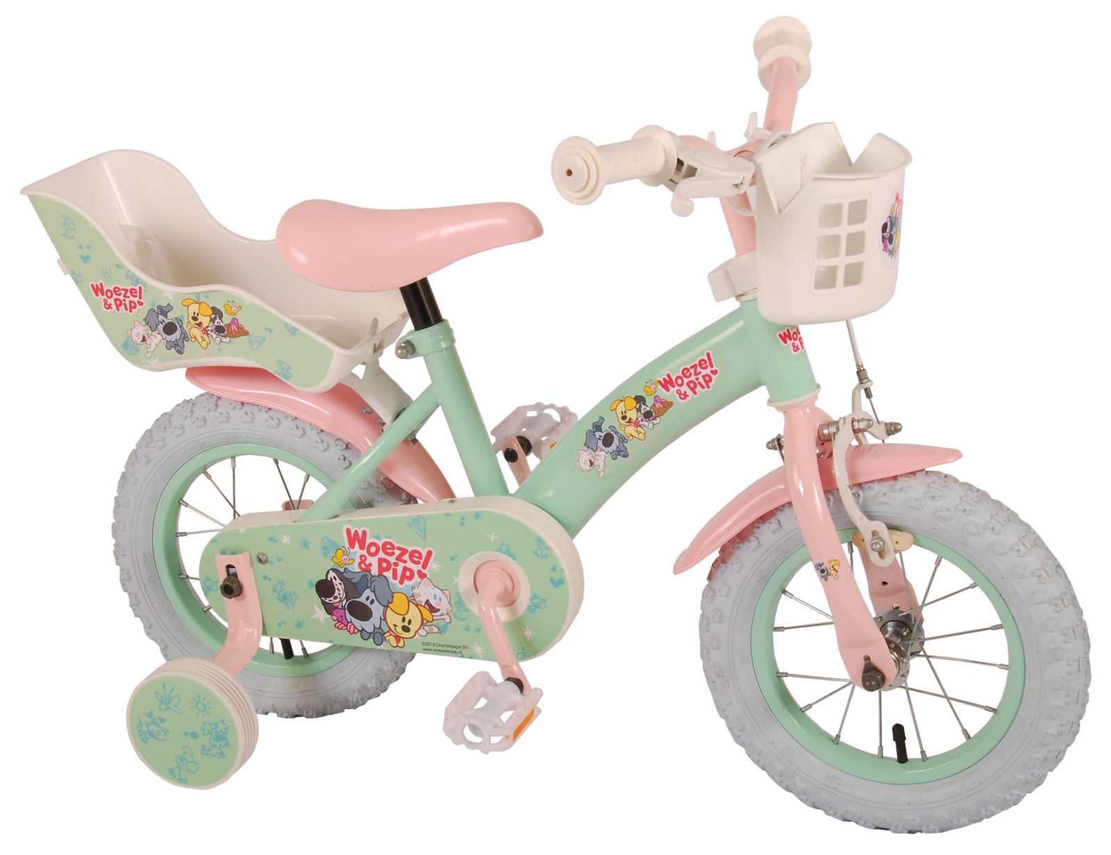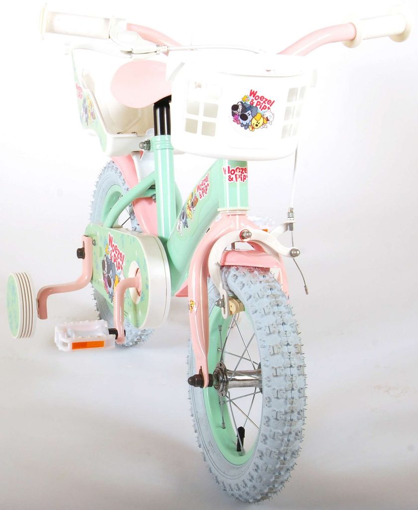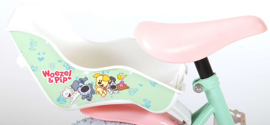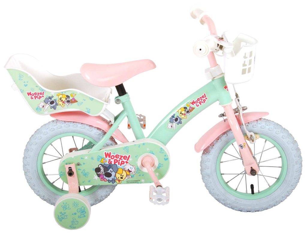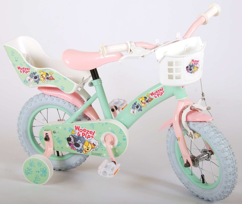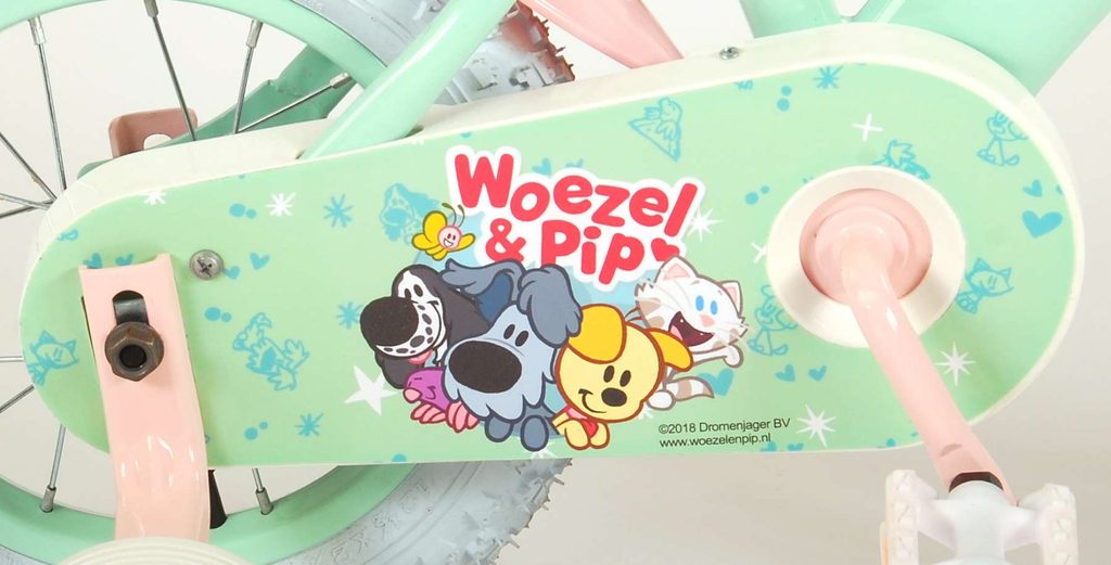 Originální dětské kolo od holandského výrobce Volare Woezel&Pip s velikostí ráfků 12 palců je určeno pro nejmenší děti ve věku od 3 do 4 let s výškou do 95 cm. Kolo je opatřeno demontovatelnými balančními kolečky, dítě se tedy bude cítit hned od první jízdy bezpečně a stabilně. Kolo je vybaveno 2 druhy brzd. Brždění probíhá buď protisměrnou zadní brzdou "torpédem", která umožnuje brzdit zpětným záběrem pedálů nebo lze použít přední pákovou brzdu. Proti nechtěnému namotání nohavice nebo tkaničky do řetězu má kolo kryt s barevným potiskem, který zakrývá celý řetěz. Sedadlo i řídítka jsou výškově nastavitelné. Na řídítkách je umístěn plastový košíček.