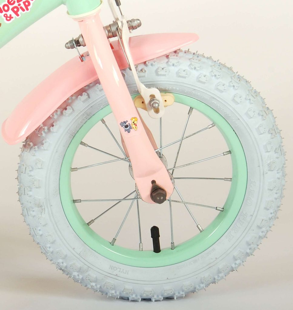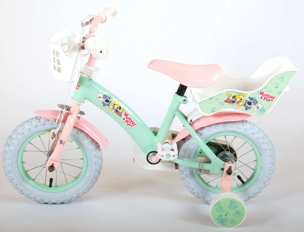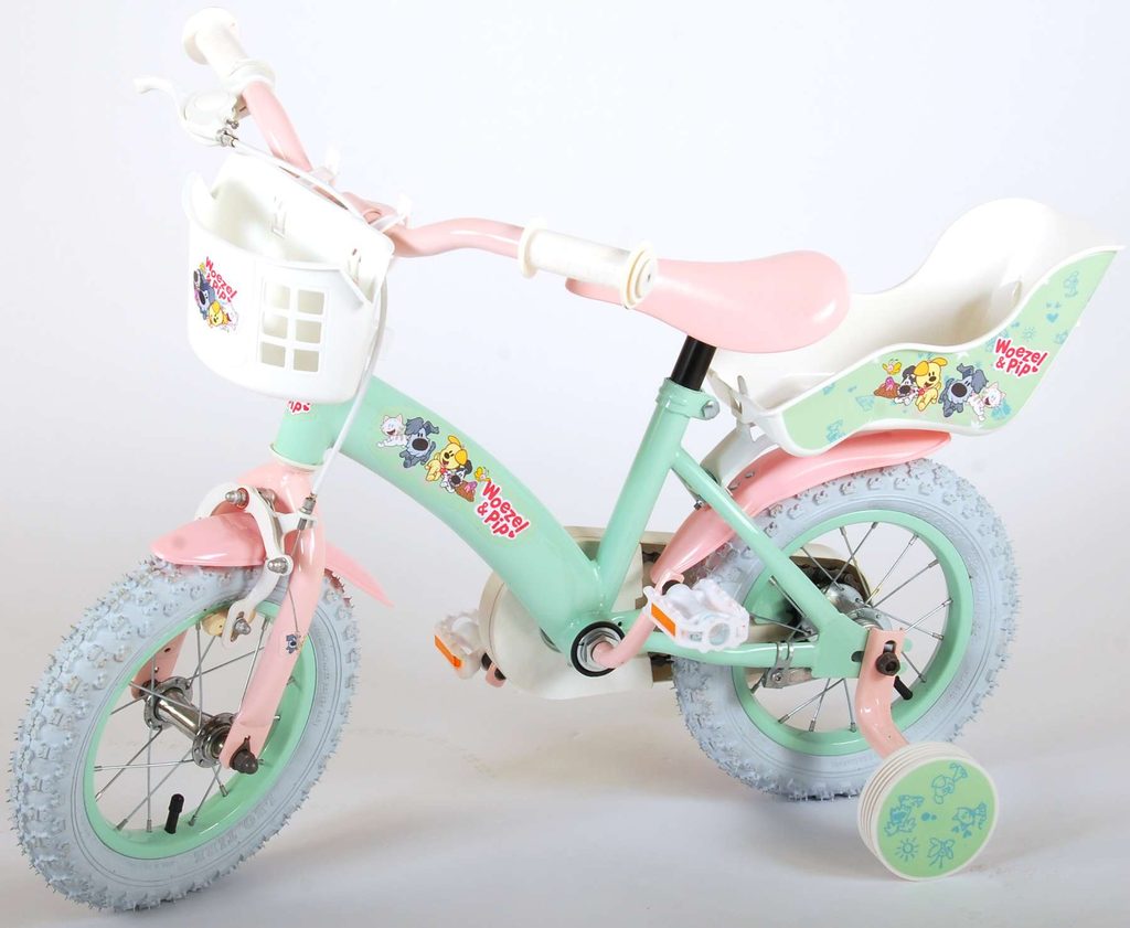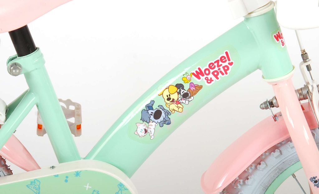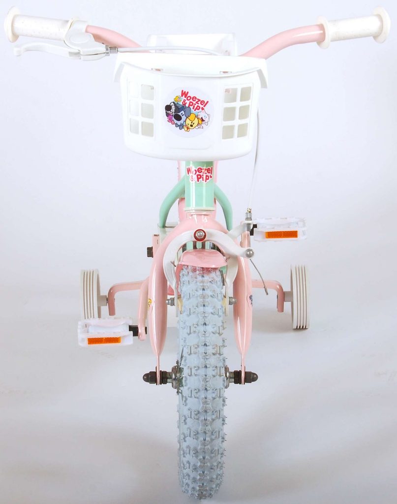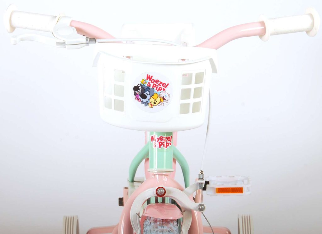 Originální dětské kolo od holandského výrobce Volare Woezel&Pip s velikostí ráfků 12 palců je určeno pro nejmenší děti ve věku od 3 do 4 let s výškou do 95 cm. Kolo je opatřeno demontovatelnými balančními kolečky, dítě se tedy bude cítit hned od první jízdy bezpečně a stabilně. Kolo je vybaveno 2 druhy brzd. Brždění probíhá buď protisměrnou zadní brzdou "torpédem", která umožnuje brzdit zpětným záběrem pedálů nebo lze použít přední pákovou brzdu. Proti nechtěnému namotání nohavice nebo tkaničky do řetězu má kolo kryt s barevným potiskem, který zakrývá celý řetěz. Sedadlo i řídítka jsou výškově nastavitelné. Na řídítkách je umístěn plastový košíček.