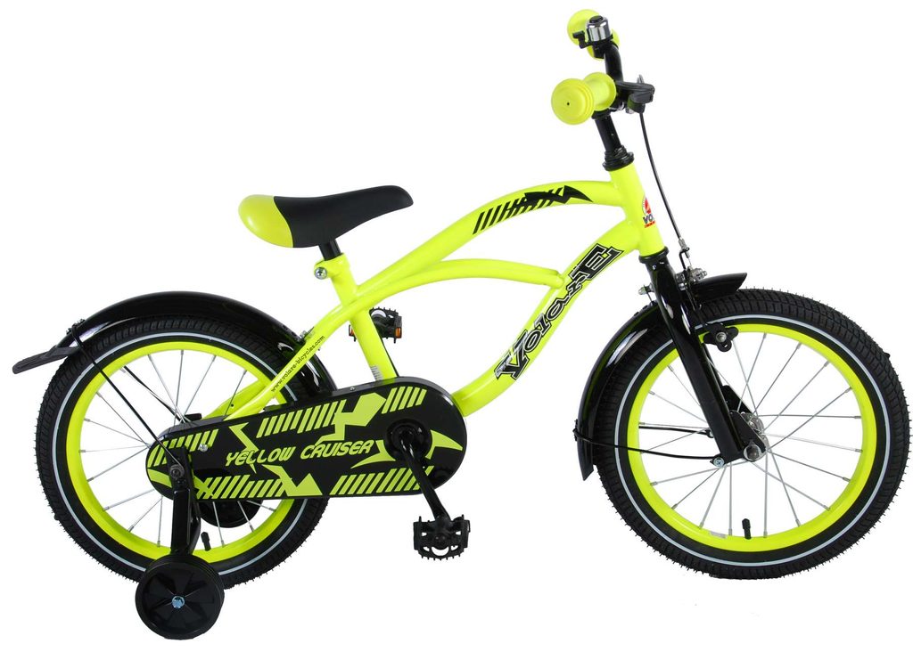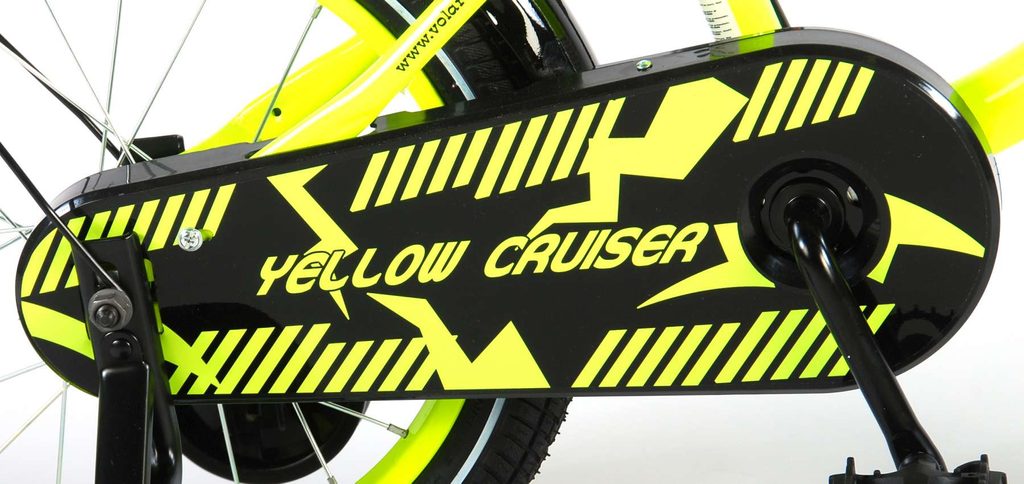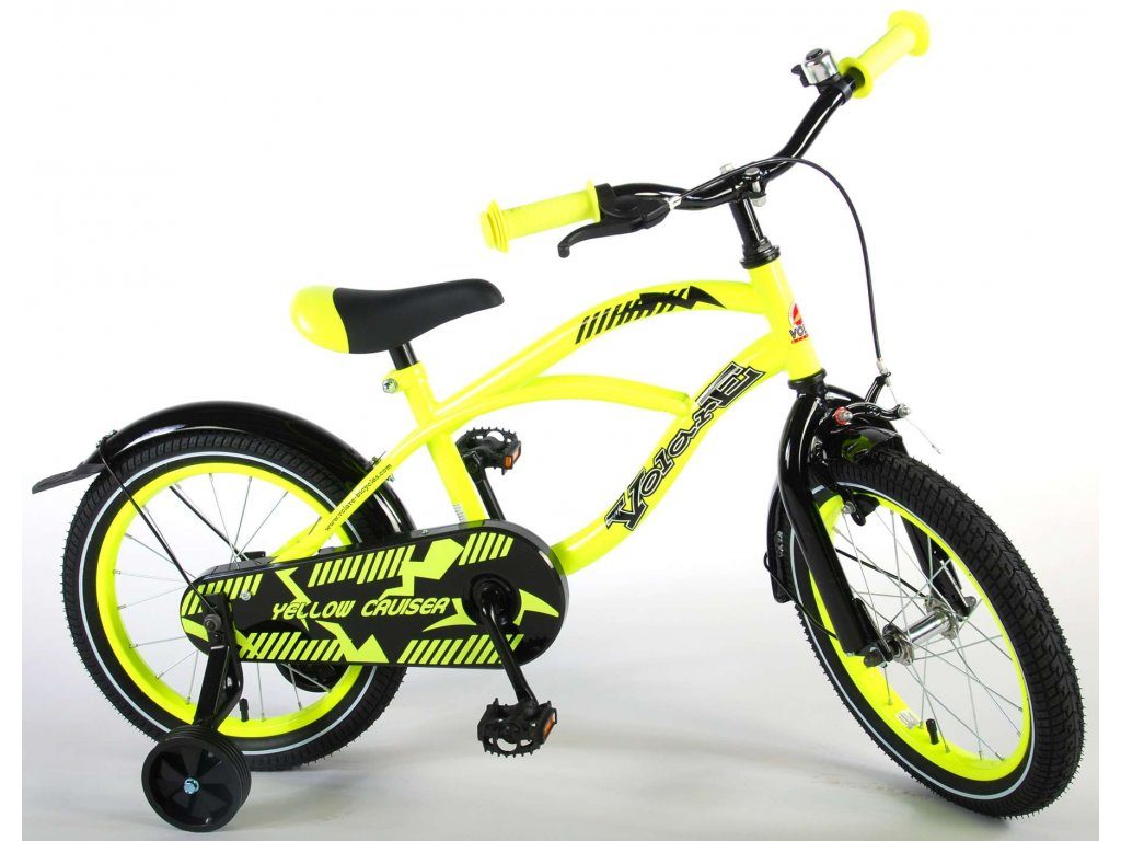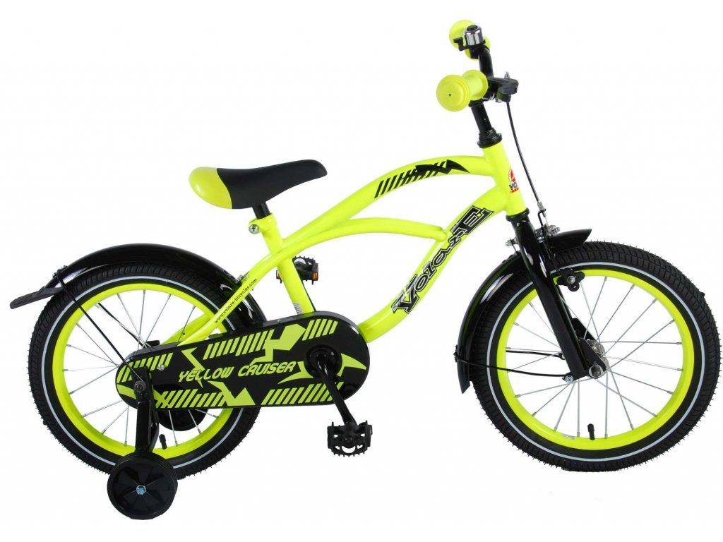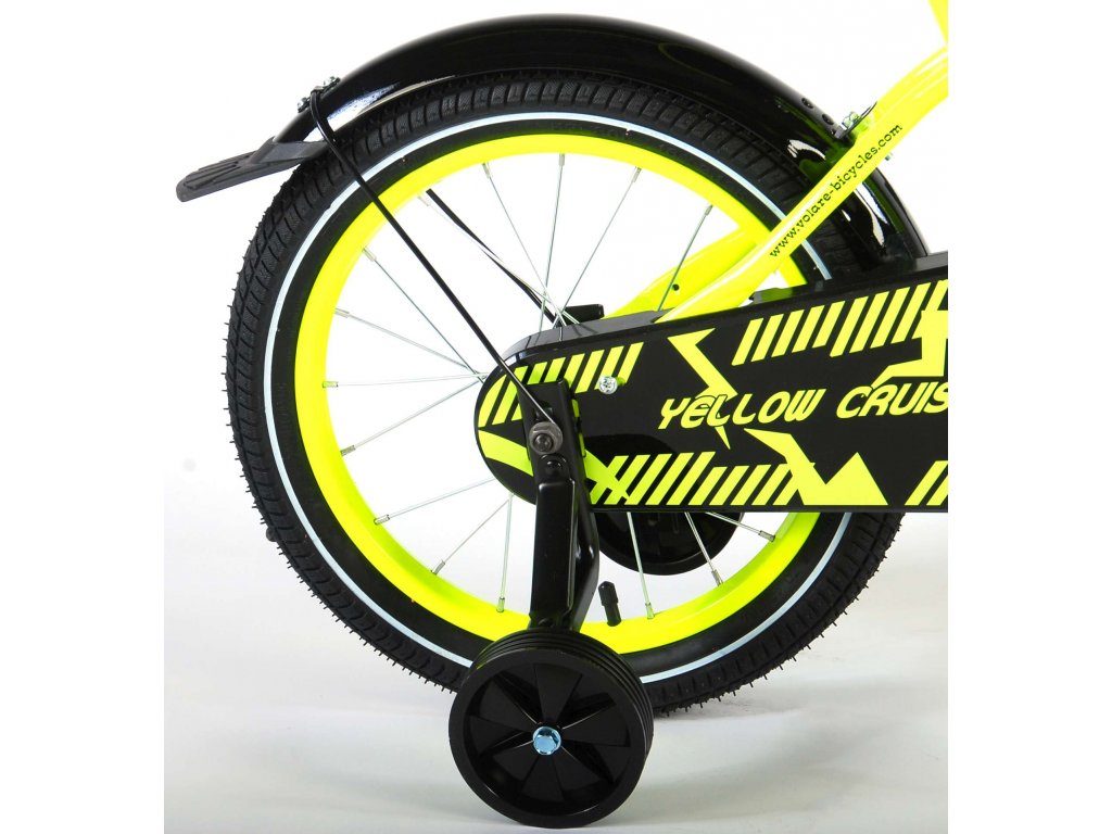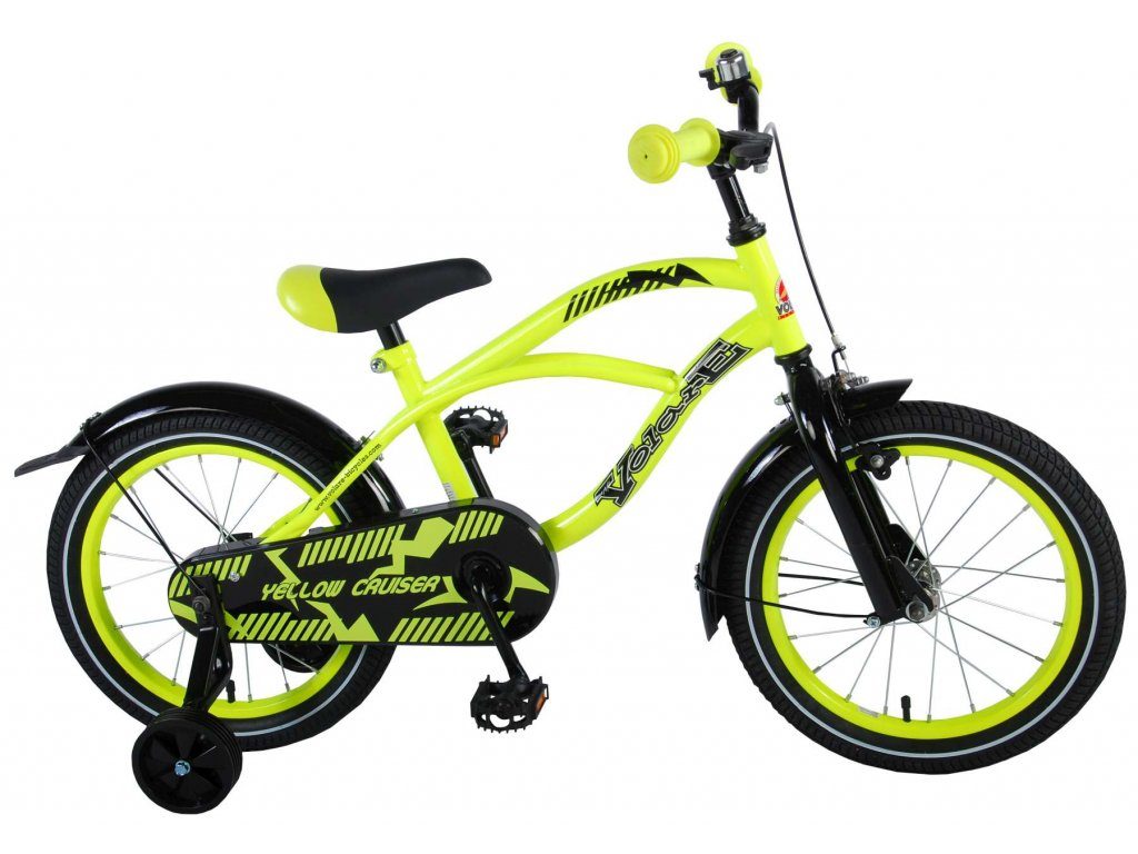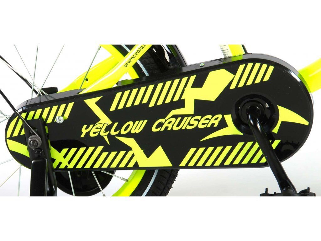 Originální dětské kolo od holandského výrobce Volare Yellow Cruiser s velikostí ráfků 16 palců je určeno pro děti ve věku od 4 do 6 let s výškou do 105 cm. Kolo je opatřeno demontovatelnými balančními kolečky, dítě se tedy bude cítit hned od první jízdy bezpečně a stabilně. Kolo je vybaveno 2 druhy brzd. Brždění probíhá buď protisměrnou zadní brzdou "torpédem",která možnuje brzdit zpětným záběrem pedálů nebo lze použít přední pákovou brzdu. Proti nechtěnému namotání nohavice nebo tkaničky do řetězu má kolo kryt s barevným potiskem, který zakrývá celý řetěz. Sedadlo i řídítka jsou výškově nastavitelné.