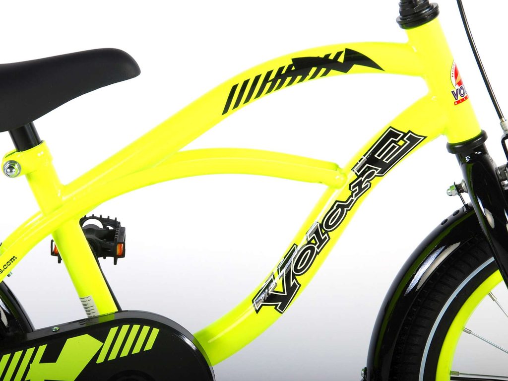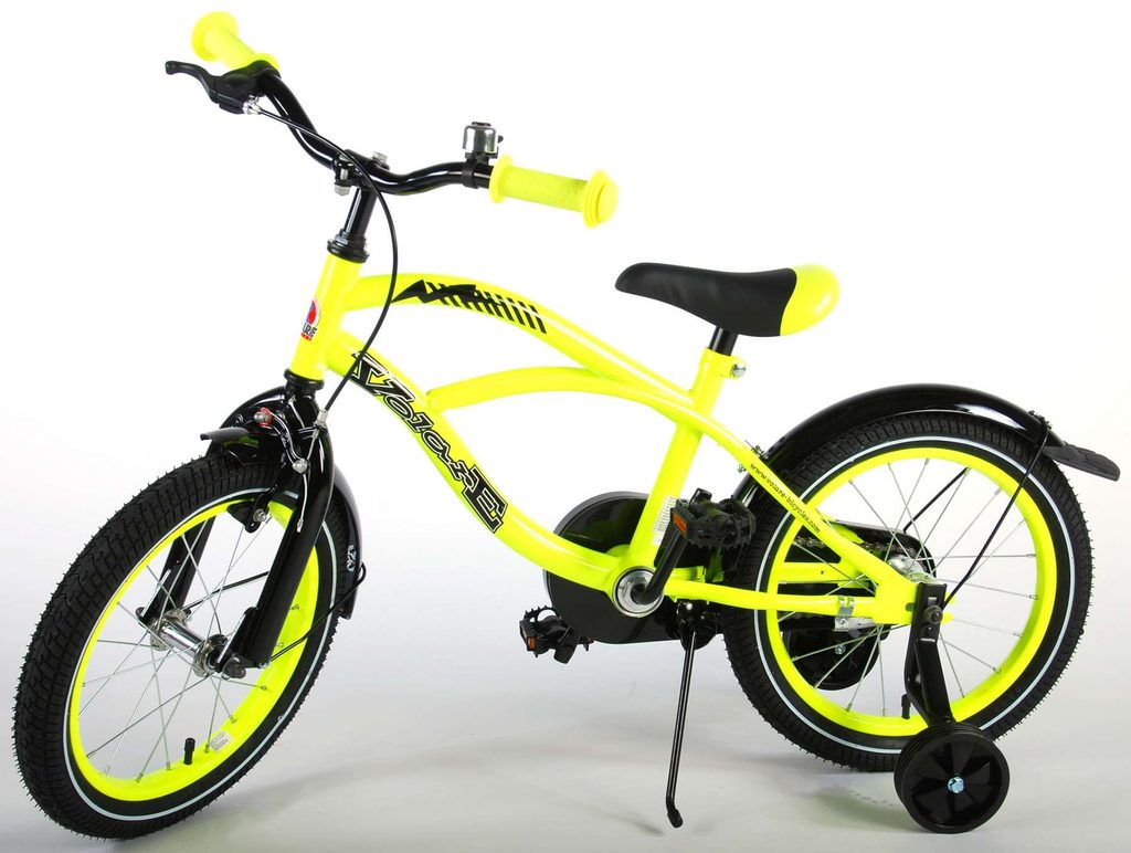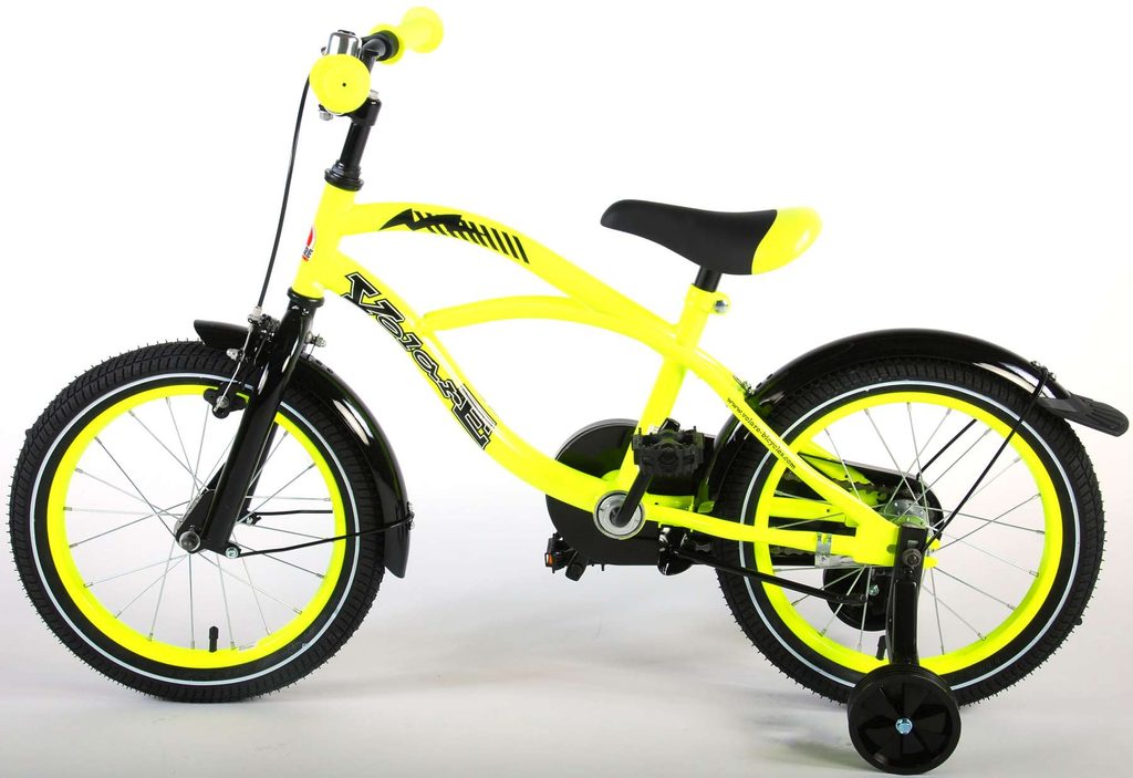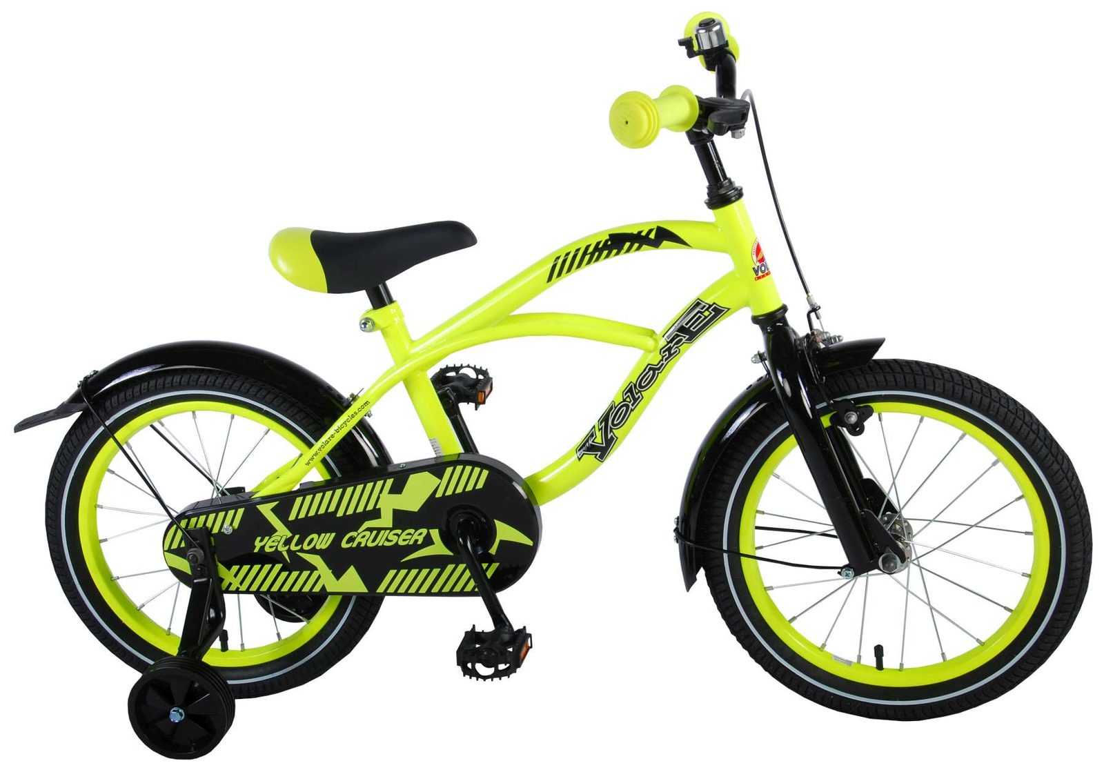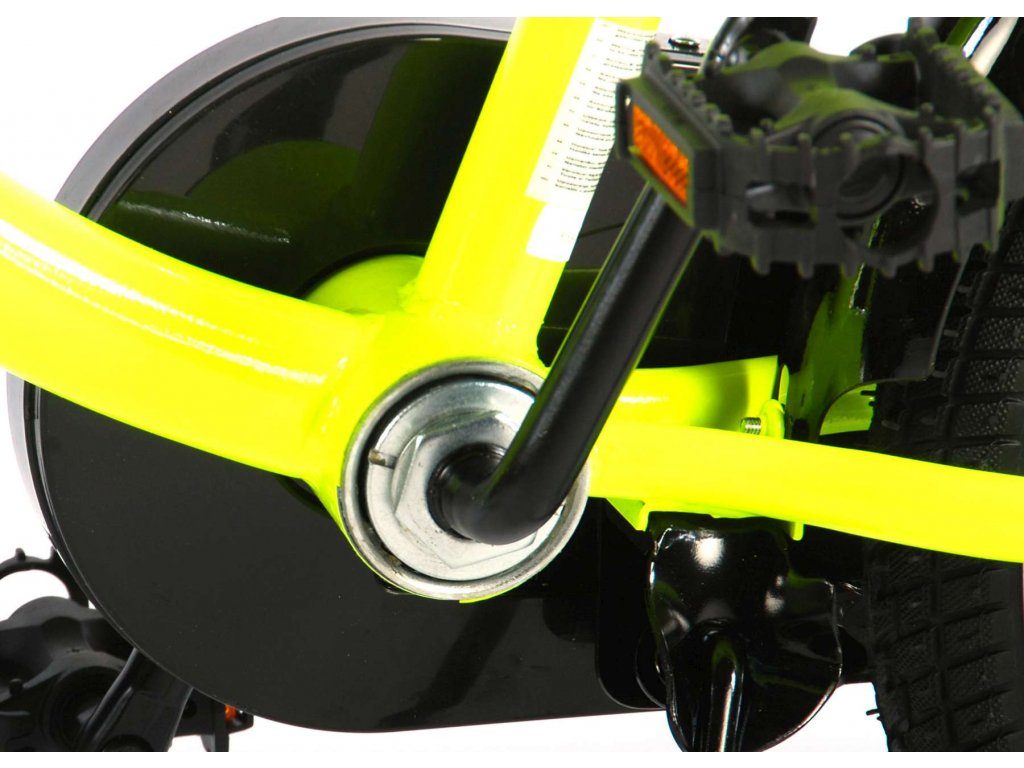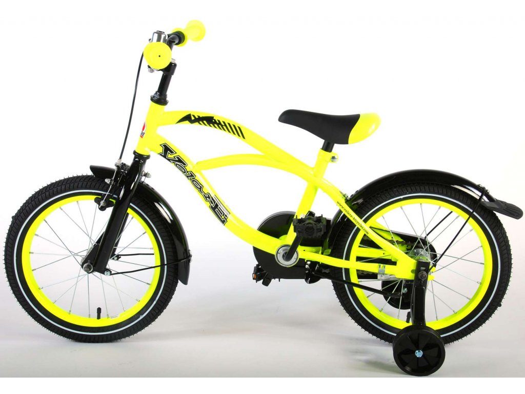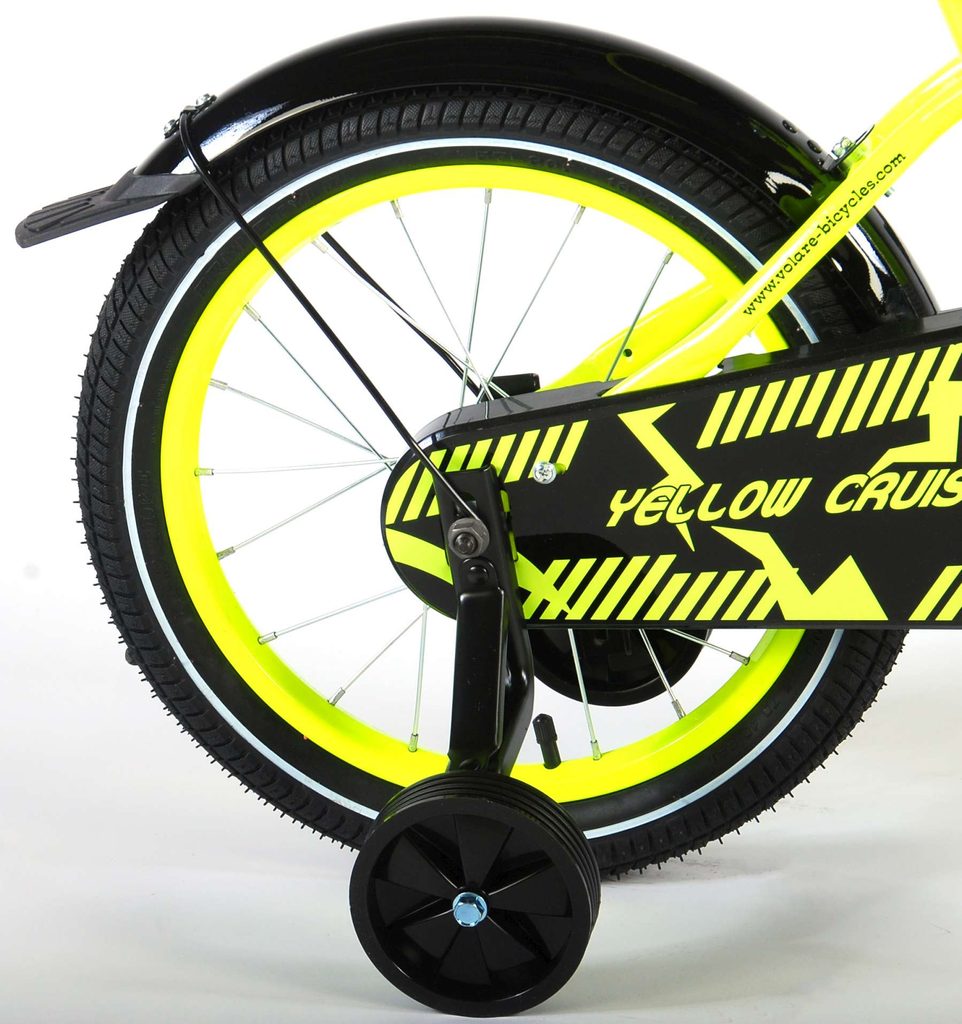 Originální dětské kolo od holandského výrobce Volare Yellow Cruiser s velikostí ráfků 16 palců je určeno pro děti ve věku od 4 do 6 let s výškou do 105 cm. Kolo je opatřeno demontovatelnými balančními kolečky, dítě se tedy bude cítit hned od první jízdy bezpečně a stabilně. Kolo je vybaveno 2 druhy brzd. Brždění probíhá buď protisměrnou zadní brzdou "torpédem",která možnuje brzdit zpětným záběrem pedálů nebo lze použít přední pákovou brzdu. Proti nechtěnému namotání nohavice nebo tkaničky do řetězu má kolo kryt s barevným potiskem, který zakrývá celý řetěz. Sedadlo i řídítka jsou výškově nastavitelné.