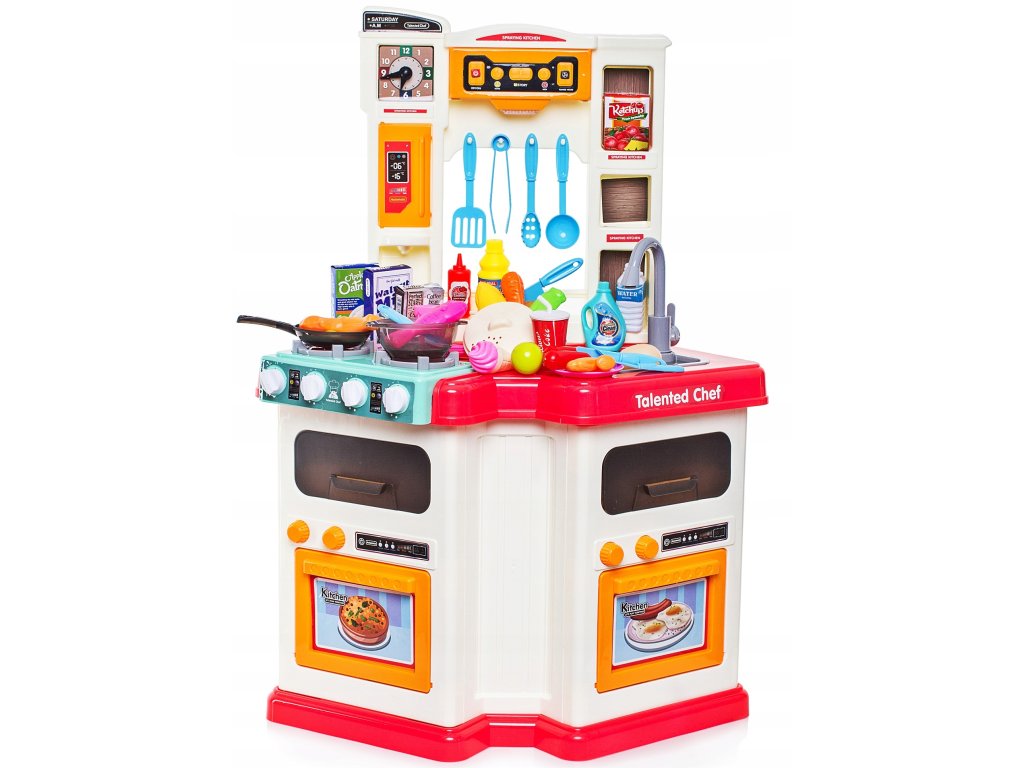 Interaktivní dětská kuchyňka Doris Talented Chef se zvuky a světlem a tekoucí vodou je určena pro děti od 36 měsíců věku. Je vybavena celkem 67 elementy jako jsou příbory, pánev, salátová misky, hotová jídla, talíře, imitace potravin a mnoho dalších. Jeden hořák způsobuje po nalití malého množství vody efekt studené páry takže vaření bude opravdu jako skutečné. V přední části je umístěna digestoř, která vydává charakteristický zvuk a má panel ze kterého lze ovládat zvuky a světelné efekty. Po nalití vody do dřezu a zmáčknutí speciálního tlačítka začne téct voda a děti mohou mýt nádobí jako v reálné kuchyni. Vaše dítě se určitě s touto velkou kuchyňkou nudit nebude. Trouba a lednice jsou otevírací. Hodiny s posuvnými ručičkami pomůžou hlídat čas vaření. velkou výhodou je rohové provedení kuchyňky, kdy si může hrát více dětí najednou aniž by si překáželi. Je vyrobena z kvalitního plastu v pestrobarevném provedení.
