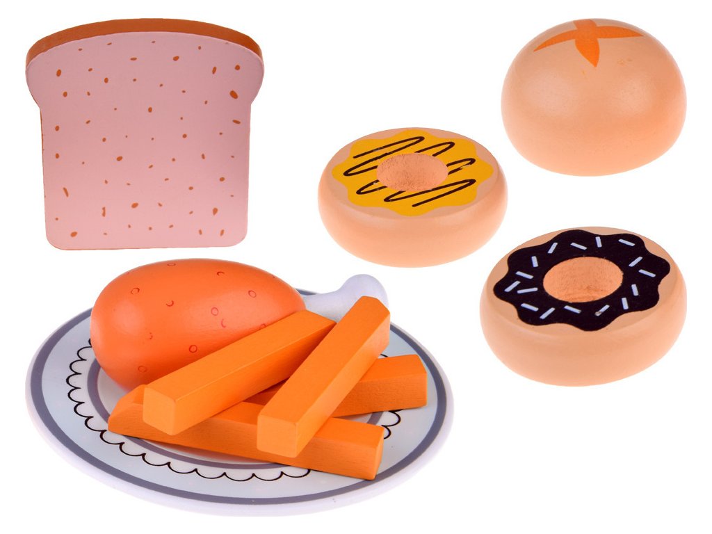 Sada je obohacena o krásný talíř, lahodné koláčky, hranolky ze sladkých brambor, kuřecí stehno a chutný toast, to vše pro to, aby bylo jídlo neuvěřitelně lahodné.