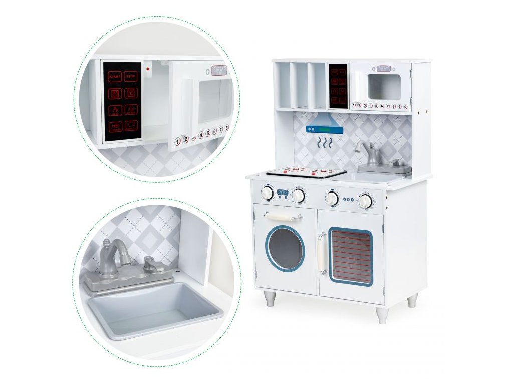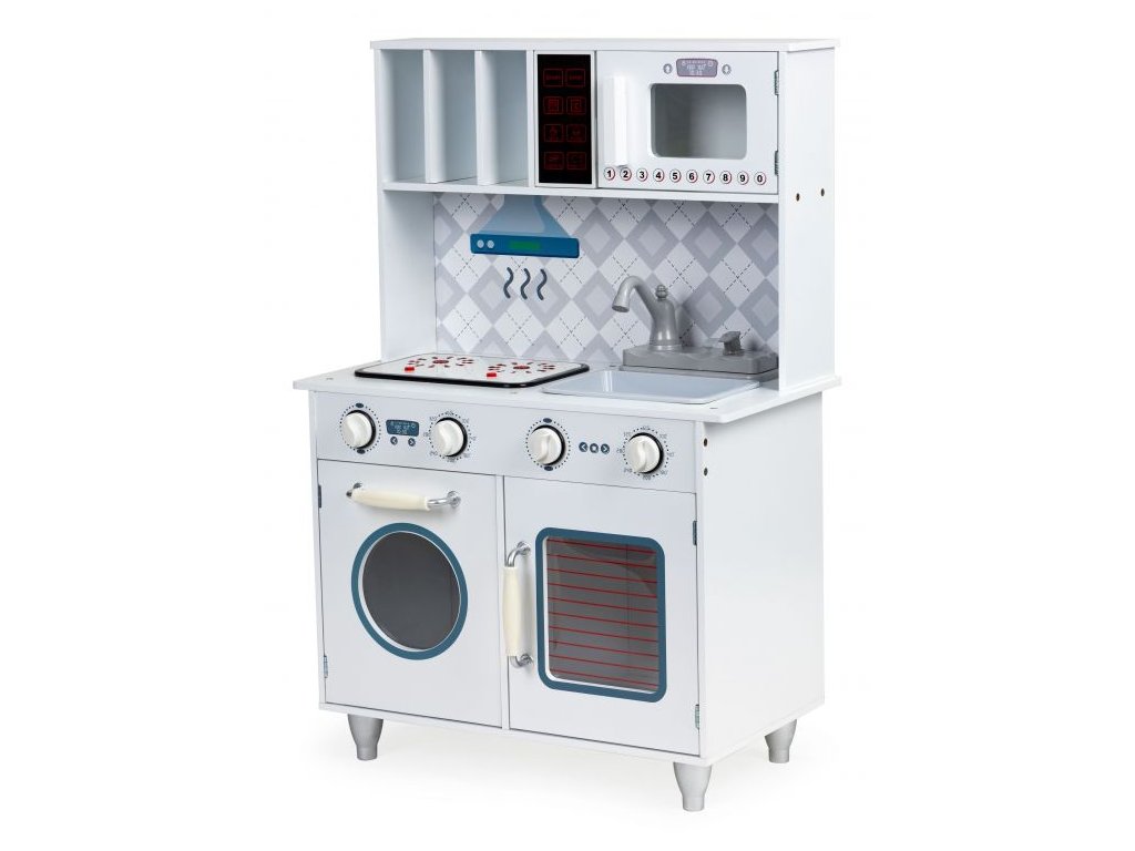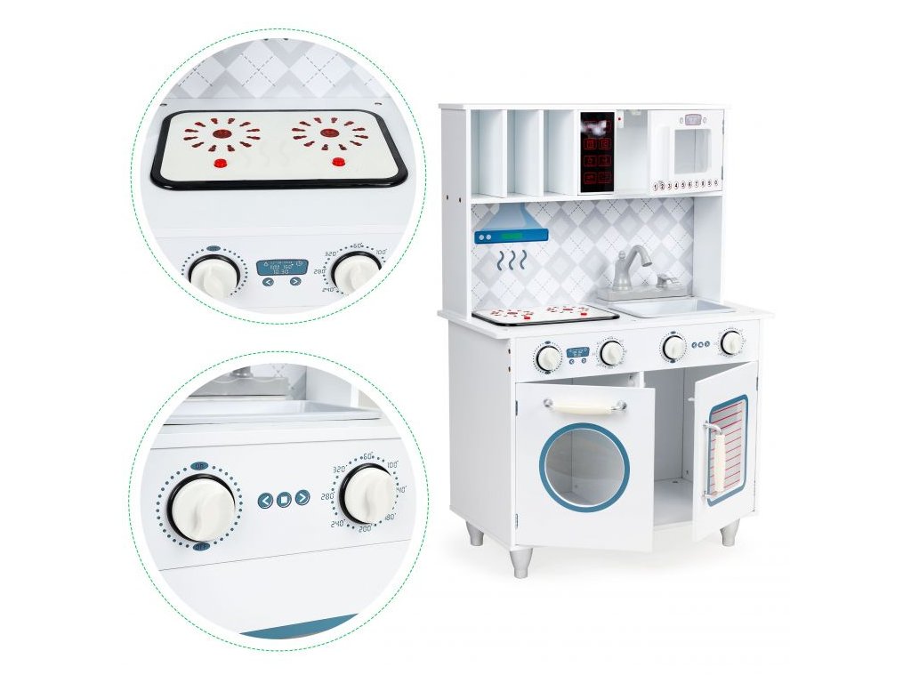 Dřevěná dětská kuchyňka Ecotoys Fancy Kitchen je určena pro děti od 3 let věku. Vaše dítě se určitě s touto kuchyňkou nudit nebude. Hořáky sporáku jsou podsvícené LED diodami a malý reproduktor vydává zvuky vaření. Kuchyňka má plastový dřez s kohoutky, odkládací poličky a otočné vypínače sporáku, které vydávají zvuk "klik". Trouba, pračka a mikrovlnka jsou otevírací. Kuchyňka je vyrobena ze dřeva v pestrobarevném provedení.