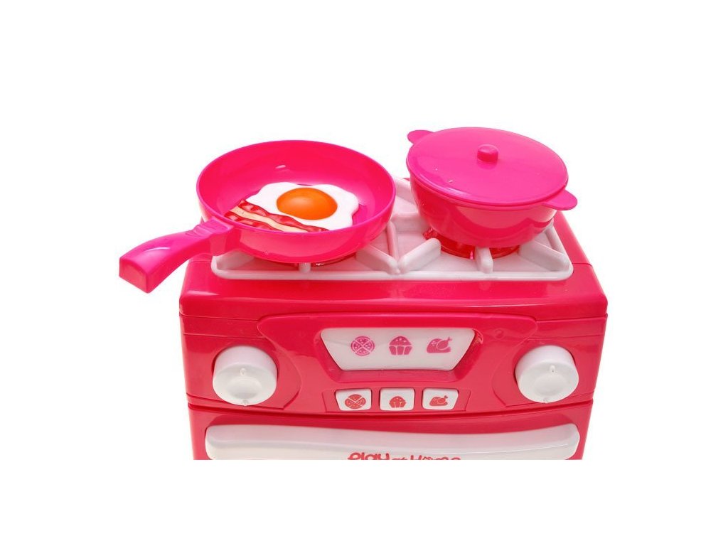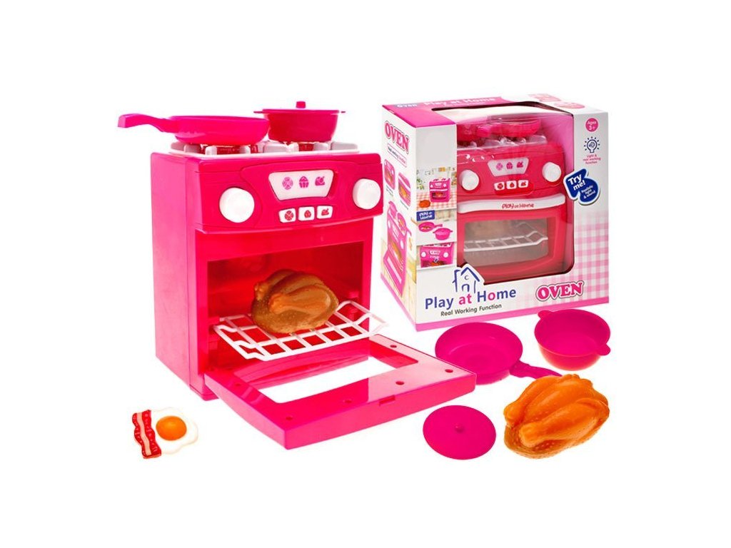 Dětská trouba se sporákem Pink Oven umožní Vašemu dítěti "ohřát" jakékoliv jídlo jako ve skutečné kuchyni. Součástí sady jsou kromě samotné trouby také pánev s poklicí, kuře, sázené vejce a slanina. Tlačítka v přední části spouštějí různé světelné a zvukové efekty. Hračka je určena pro děti od 36 měsíců věku.