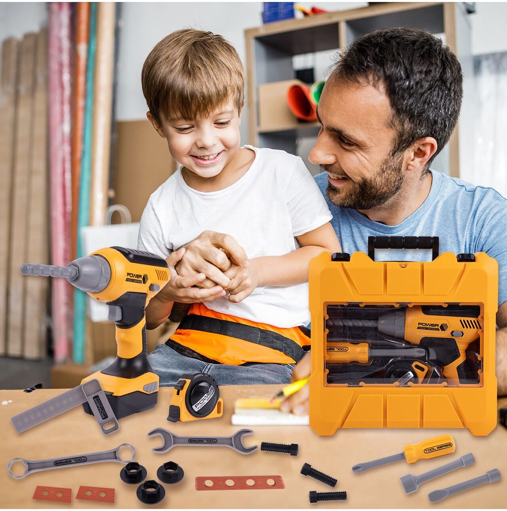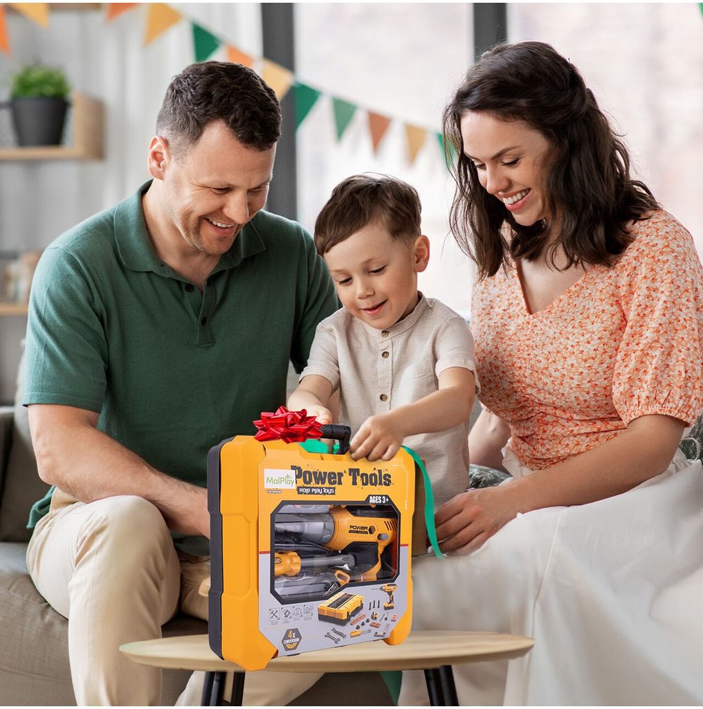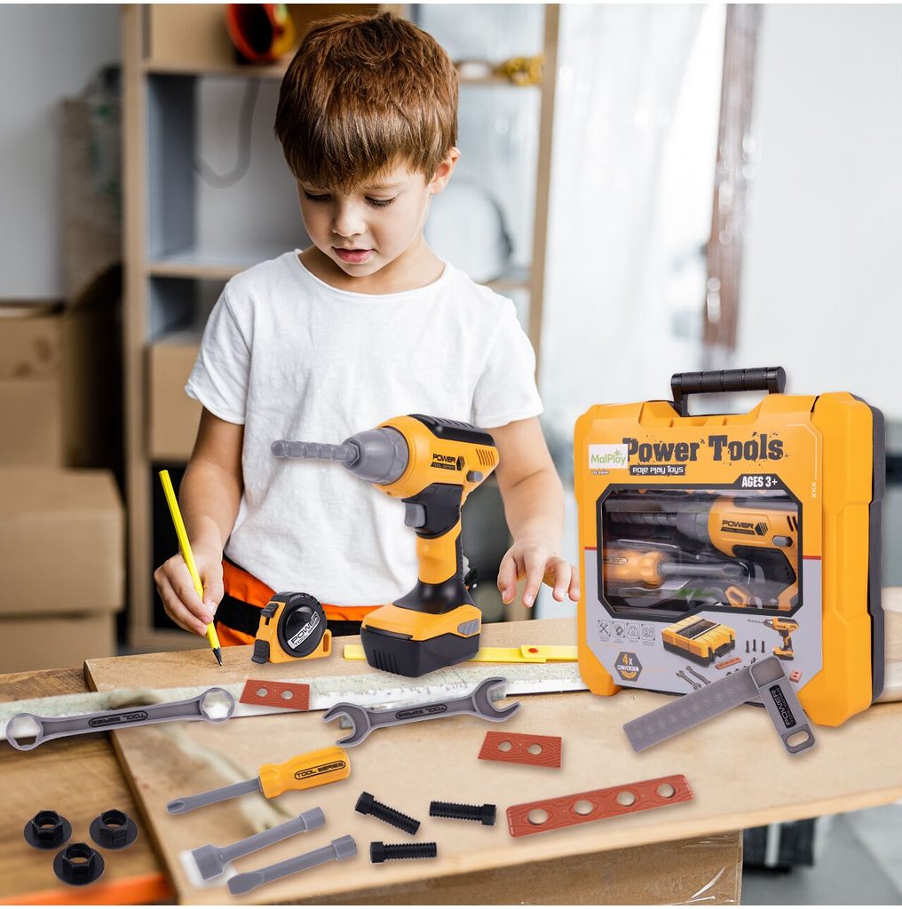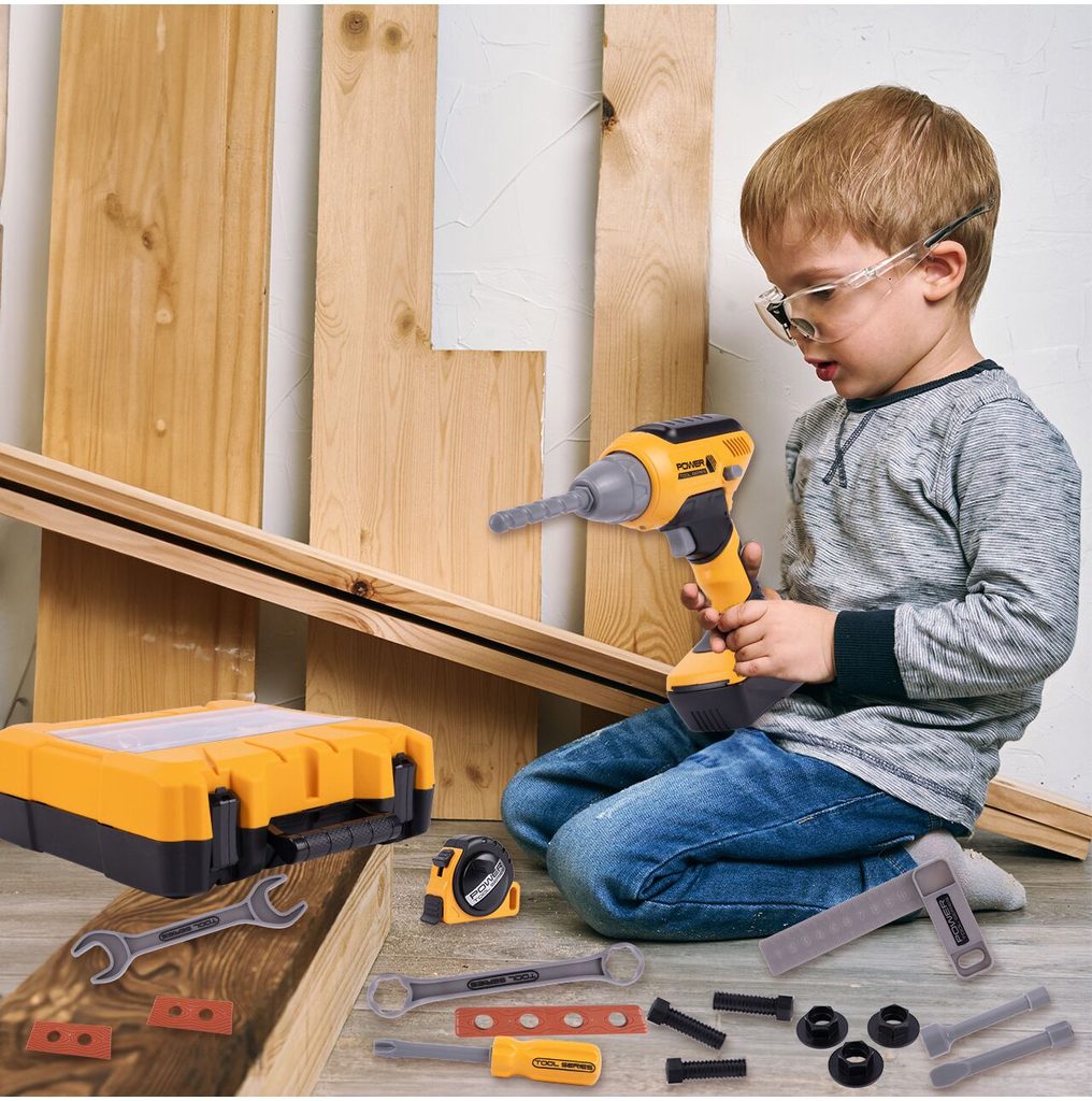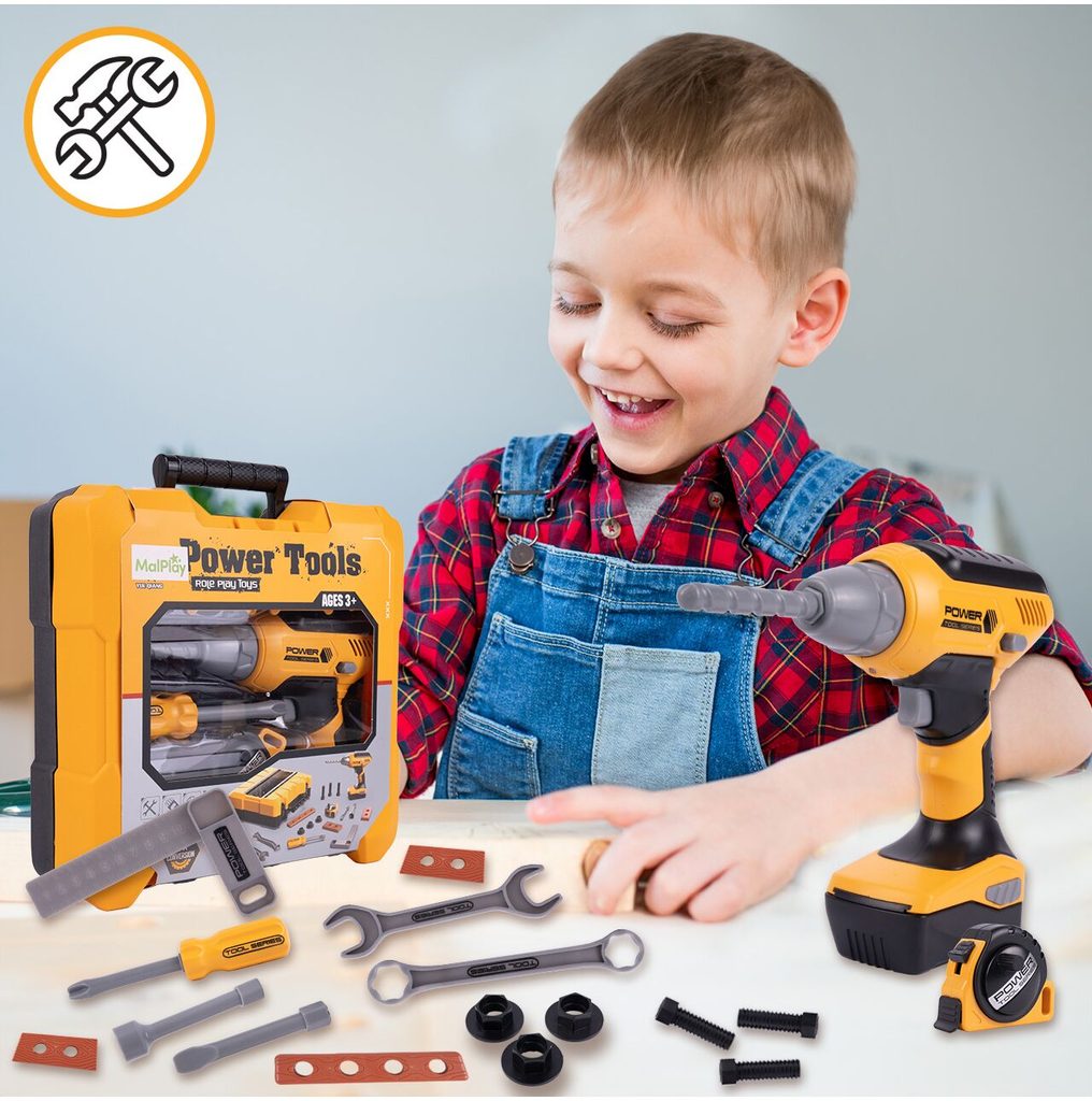 Sada plastového nářadí v praktickém kufříku s úchytem Power Tools je ideální hračkou pro všechny malé kutily. Díky tašce si může své oblíbené nářadí přenášet kamkoliv bude potřebovat. Sada obsahuje celkem 20 součástí včetně šroubováku, klíčů, šroubků, matic, konstrukčních prvků a dalšího nářadí. V sadě je také vrtačka na baterie, které po zapnutí vydává charakteristický zvuk a má také osvětlení. Hračka je určena pro děti od 36 měsíců věku.