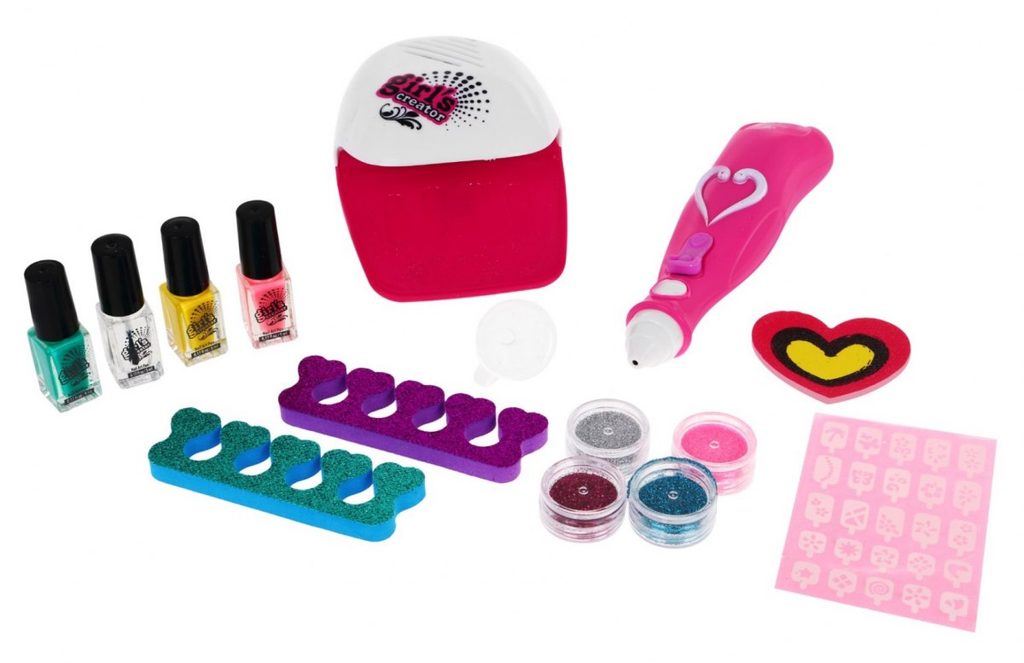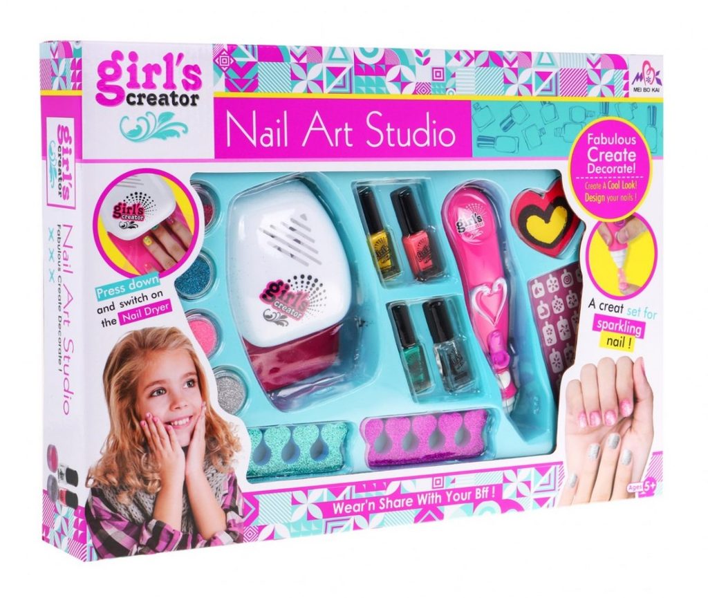 Kompletní nehtové studio Nail Art obsahuje vše potřebné k péči o dětské nehty. Holčičky zde najdou laky a třpyty na nehty, oddělovače, pilníček ve tvaru srdce, nálepky na nehty a také sušičku na baterie pod kterou si mohou hotové nehty hned usušit. Pro snadnou aplikaci třpytů je součástí také aplikátor na baterie. Sada je vyrobena z bezpečných netoxických materiálů. Po nalakování lze lak jednoduše odloupnout bez použití odlakovače. Hračka je vyrobená z plastu v pestrobarevném provedení a určena pro děti od 5 let