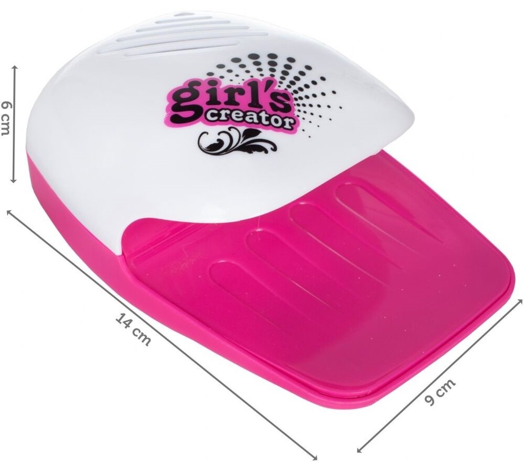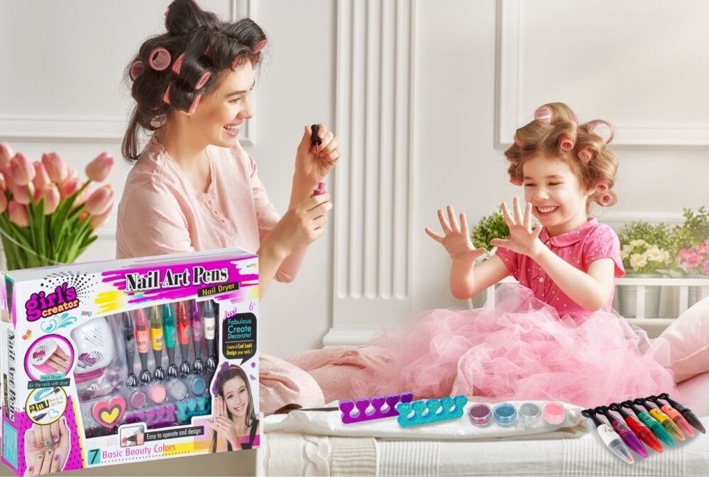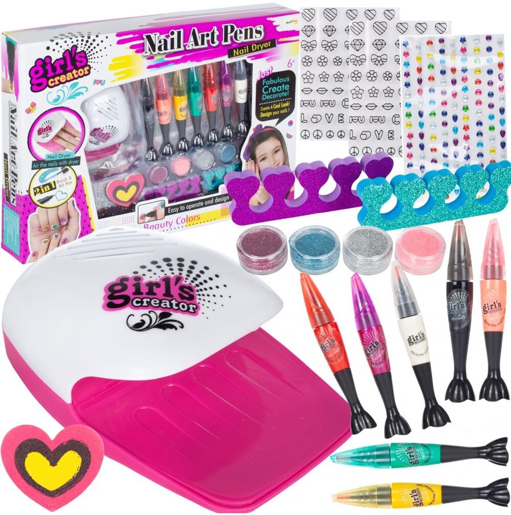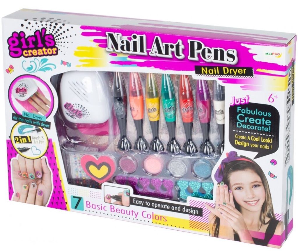 Kompletní nehtové studio Nail Art Pens obsahuje vše potřebné k péči o dětské nehty. Holčičky zde najdou laky a třpyty na nehty, pilníček ve tvaru srdce, nálepky a dekorace na nehty a také sušičku na baterie pod kterou si mohou hotové nehty hned usušit. Sada je vyrobena z bezpečných netoxických materiálů. Po nalakování lze lak jednoduše odloupnout bez použití odlakovače. Hračka je vyrobená z plastu v pestrobarevném provedení a určena pro děti od 6 let.