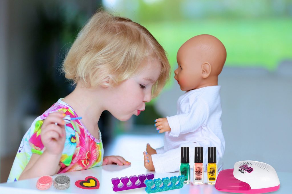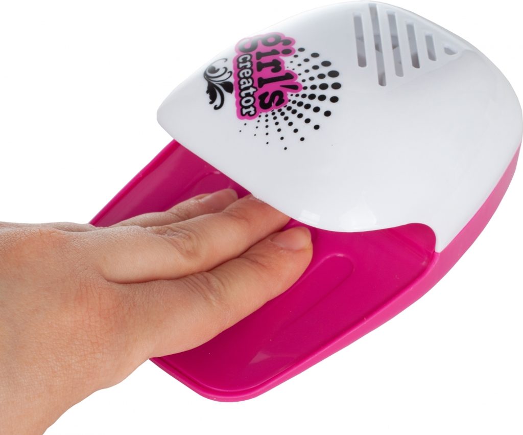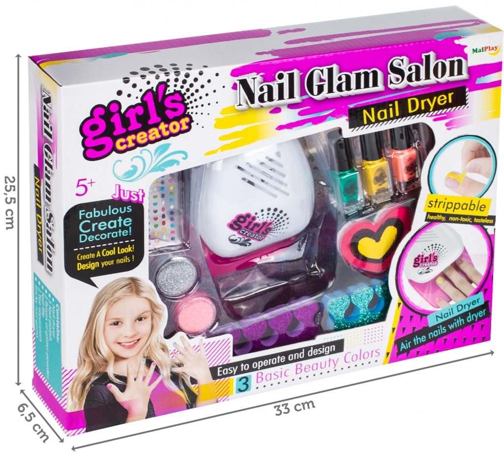Kompletní nehtové studio Nail Glam salon obsahuje vše potřebné k péči o dětské nehty. Holčičky zde najdou laky a třpyty na nehty, oddělovače, pilníček ve tvaru srdce, nálepky na nehty a také sušičku na baterie pod kterou si mohou hotové nehty hned usušit. Sada je vyrobena z bezpečných netoxických materiálů. Po nalakování lze lak jednoduše odloupnout bez použití odlakovače. Hračka je vyrobená z plastu v pestrobarevném provedení a určena pro děti od 5 let.