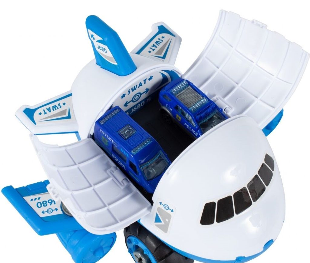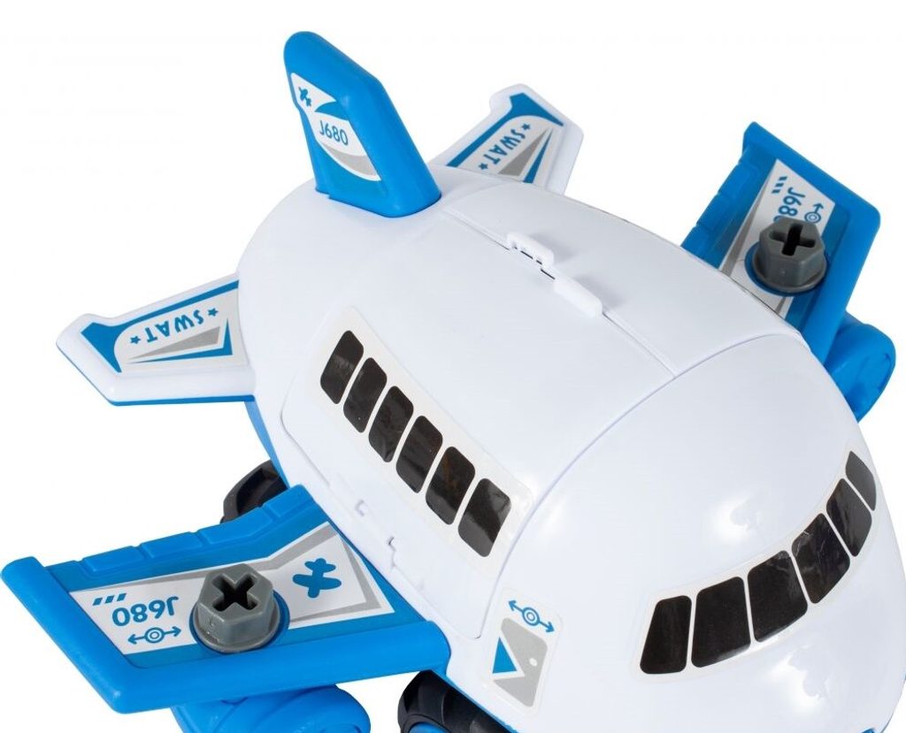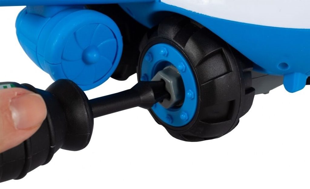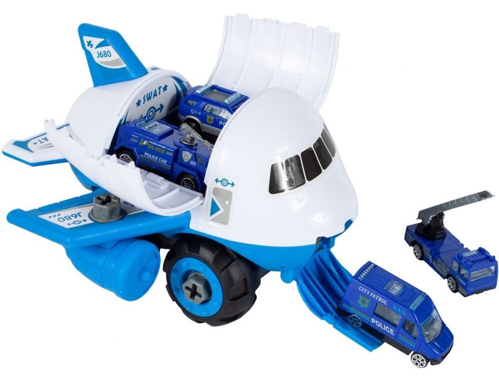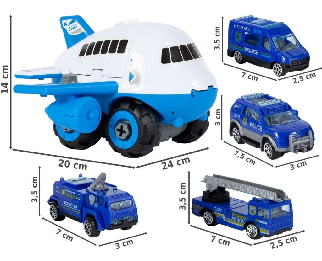 Šroubovací letadlo s autíčky a dalším příslušenstvím Plane Storage je ideální hračkou pro rozvoj manuální zručnosti a logického myšlení. Lze ho rozebrat na jednotlivé díly a šrouby a poté zase složit pomocí přiloženého šroubováku. Zábava je tak nekonečná. Součástí sady jsou 4 policejní autíčka, silniční značky, dopravní značení, stromečky a hydrant. Pohon zajišťuje systém Friction Power kdy se helikoptéra rozpohybuje tlačením po hladkém povrchu. Hračka je určena pro děti od 36 měsíců věku.