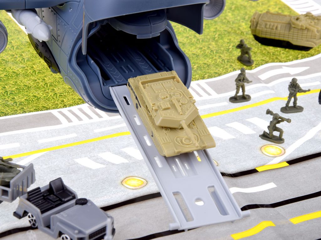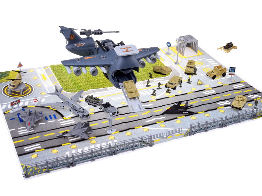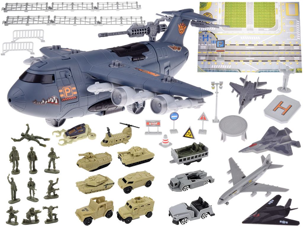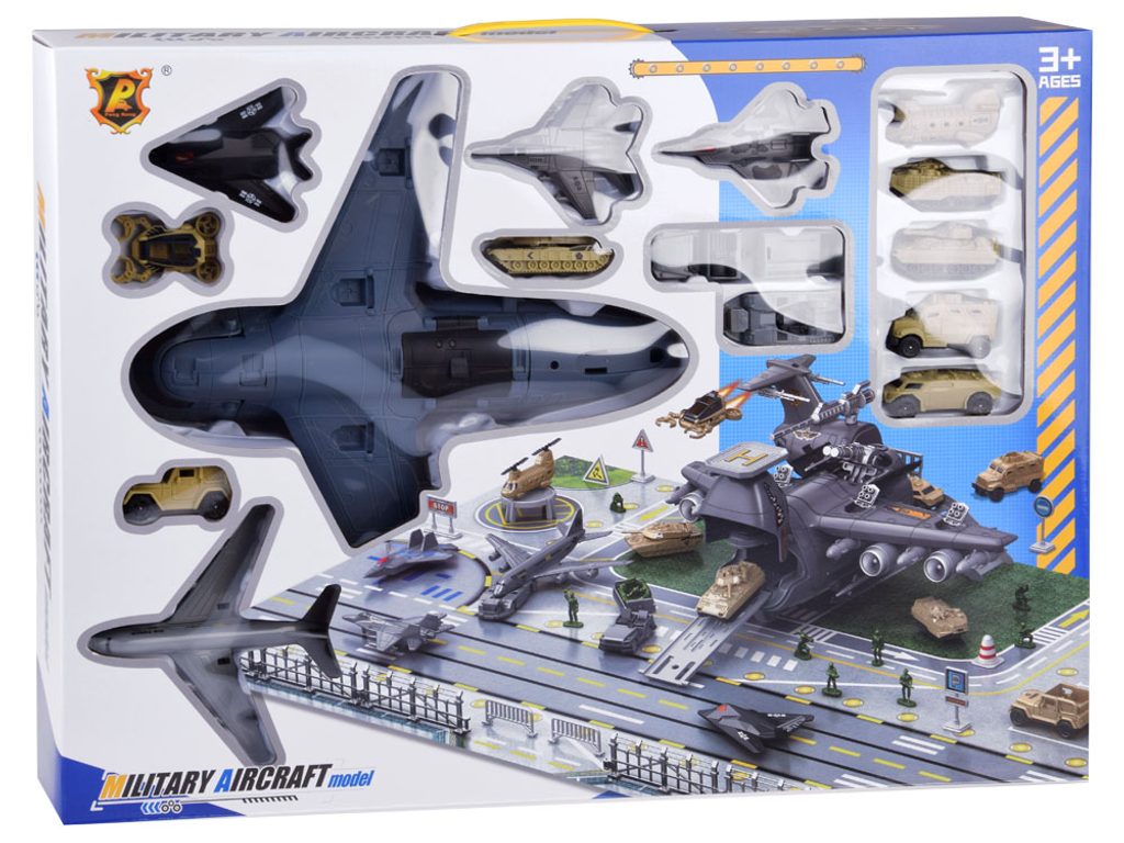 Velká vojenská sada s letištěm Military Aircraft je určena pro každého malého fanouška vojáků, letadel a letectví. Sada obsahuje velké množství příslušenství. Kromě velkého dopravního letadla zde najdete různé druhy vojenských autíček, stíhačky, vojáčky, helikoptéru, tank a samozřejmě součásti ze kterých lze sestavit kompletní letiště. Hračka je určena pro děti od 3 let věku.