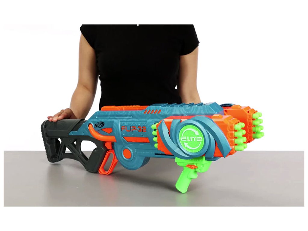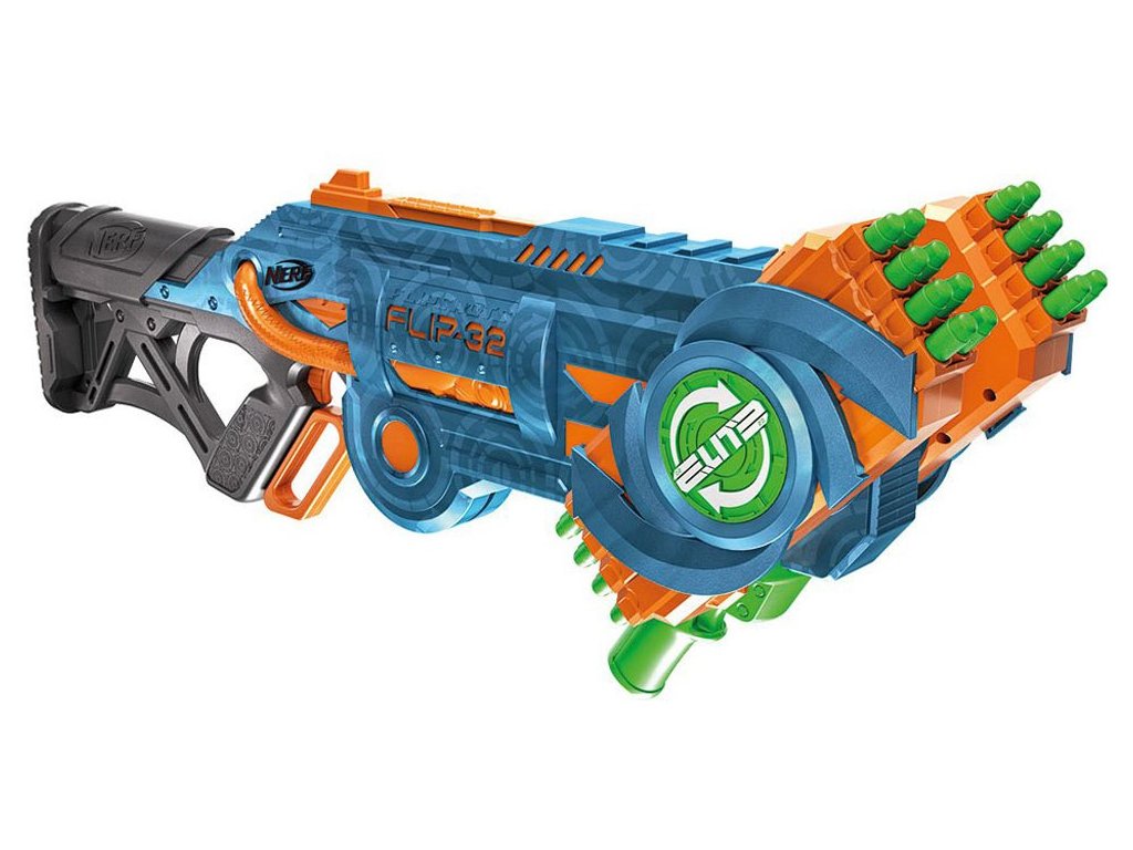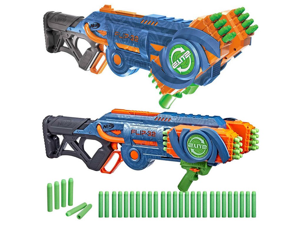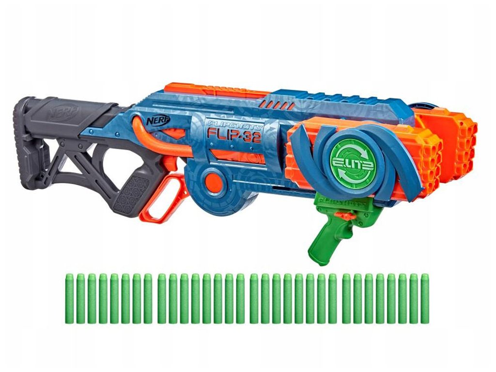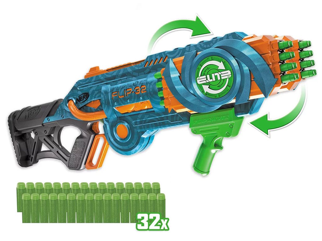 Dětský odpalovač Nerf Elite 2.0 Flip 32 je revoluční novinkou, se kterou si užijete zábavu na maximum a je snem každého chlapce. Hlavní předností je celková kapacita 32 nábojů. K dispozici jsou dva otočné zásobníky s kapacitou 16 nábojů. Pomocí dvoustupňové spouště lze vystřelit jeden náboj nebo rovnou dva zároveň. Jeden náboj vystřelíte a druhý můžete rovnou nabíjet, díky čemuž nabíjíte doslova za pochodu. Když náboje dojdou, stačí zmáčknout zelenou páčku a můžete využít dalších 16. Součástí sady je 32 kusů bezpečných nábojů. Jedná se o skvělou zábavu pro chlapce a můžete nám věřit, že ke hře s tímto samopalem se rádi zapojí i tatínkové.