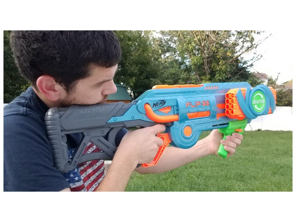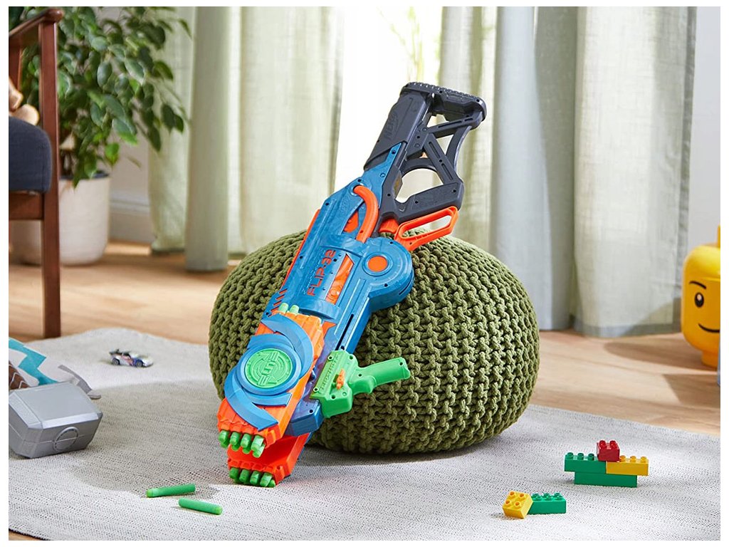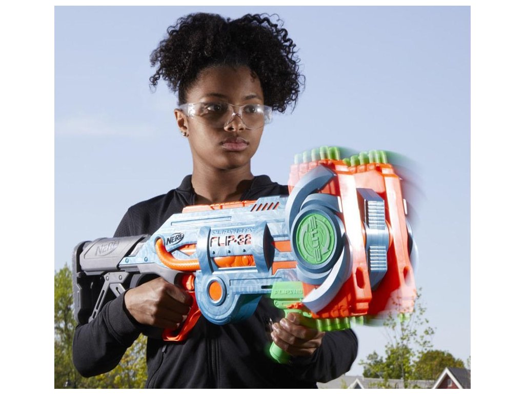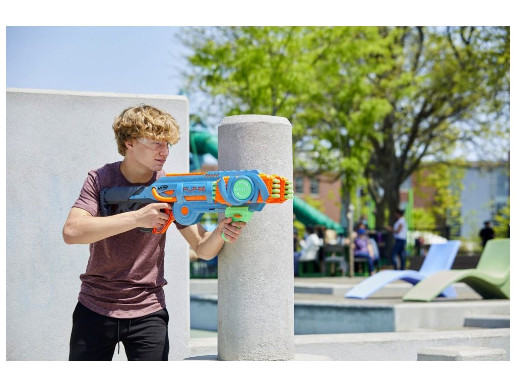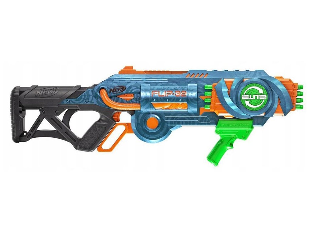 Dětský odpalovač Nerf Elite 2.0 Flip 32 je revoluční novinkou, se kterou si užijete zábavu na maximum a je snem každého chlapce. Hlavní předností je celková kapacita 32 nábojů. K dispozici jsou dva otočné zásobníky s kapacitou 16 nábojů. Pomocí dvoustupňové spouště lze vystřelit jeden náboj nebo rovnou dva zároveň. Jeden náboj vystřelíte a druhý můžete rovnou nabíjet, díky čemuž nabíjíte doslova za pochodu. Když náboje dojdou, stačí zmáčknout zelenou páčku a můžete využít dalších 16. Součástí sady je 32 kusů bezpečných nábojů. Jedná se o skvělou zábavu pro chlapce a můžete nám věřit, že ke hře s tímto samopalem se rádi zapojí i tatínkové.