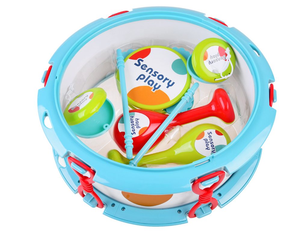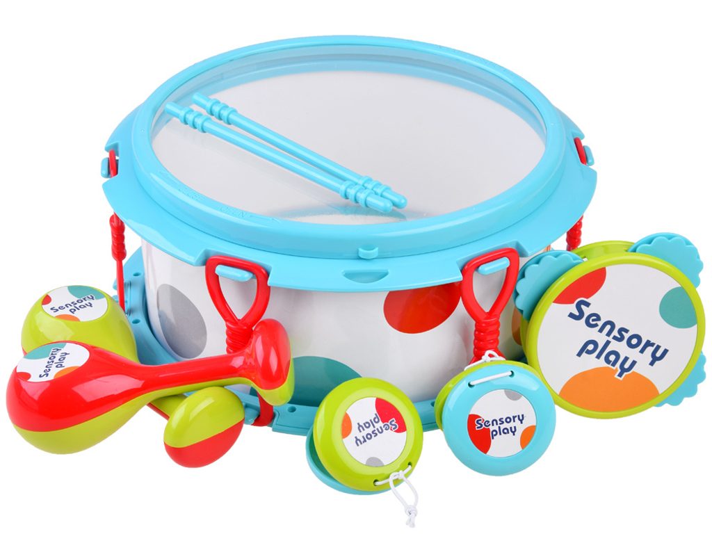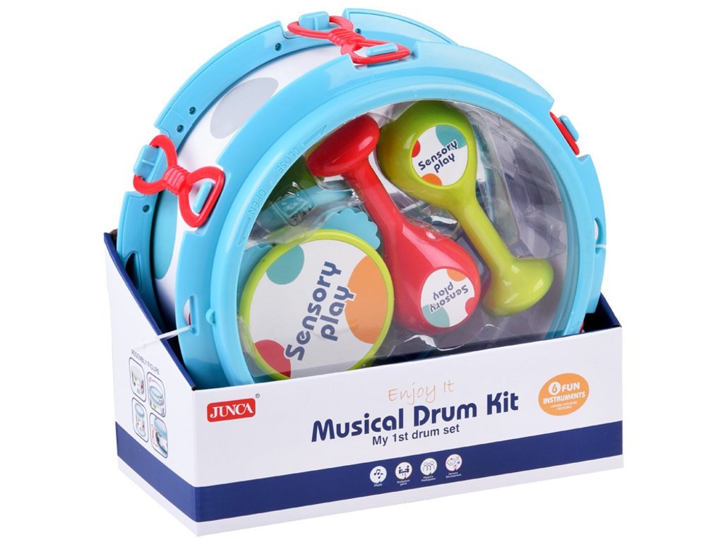 Dětský bubínek s nástroji Drum Kit je ideální hračkou pro ty nejmenší děti. Umožní dítěti rozvíjet hmat, zrak a hlavně sluch. Souprava obsahuje celkem 8 nástrojů: tamburínu, 2 paličky, 2 marakasy, bubínek a dva kaštaněty. Vše je vyrobeno v pestrých barvách a Vaše dítě tak hračka ihned zaujme. Souprava je určena pro děti od 18 měsíců věku.