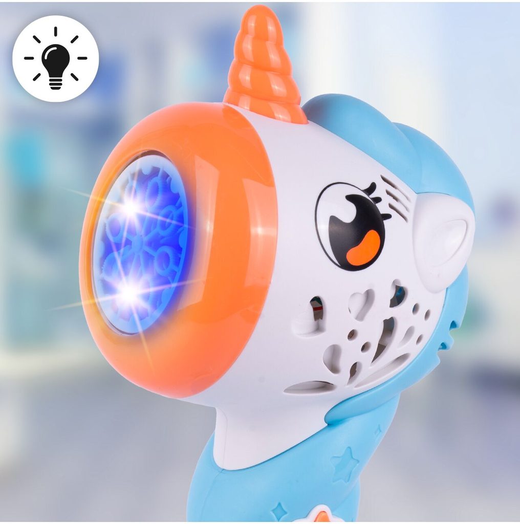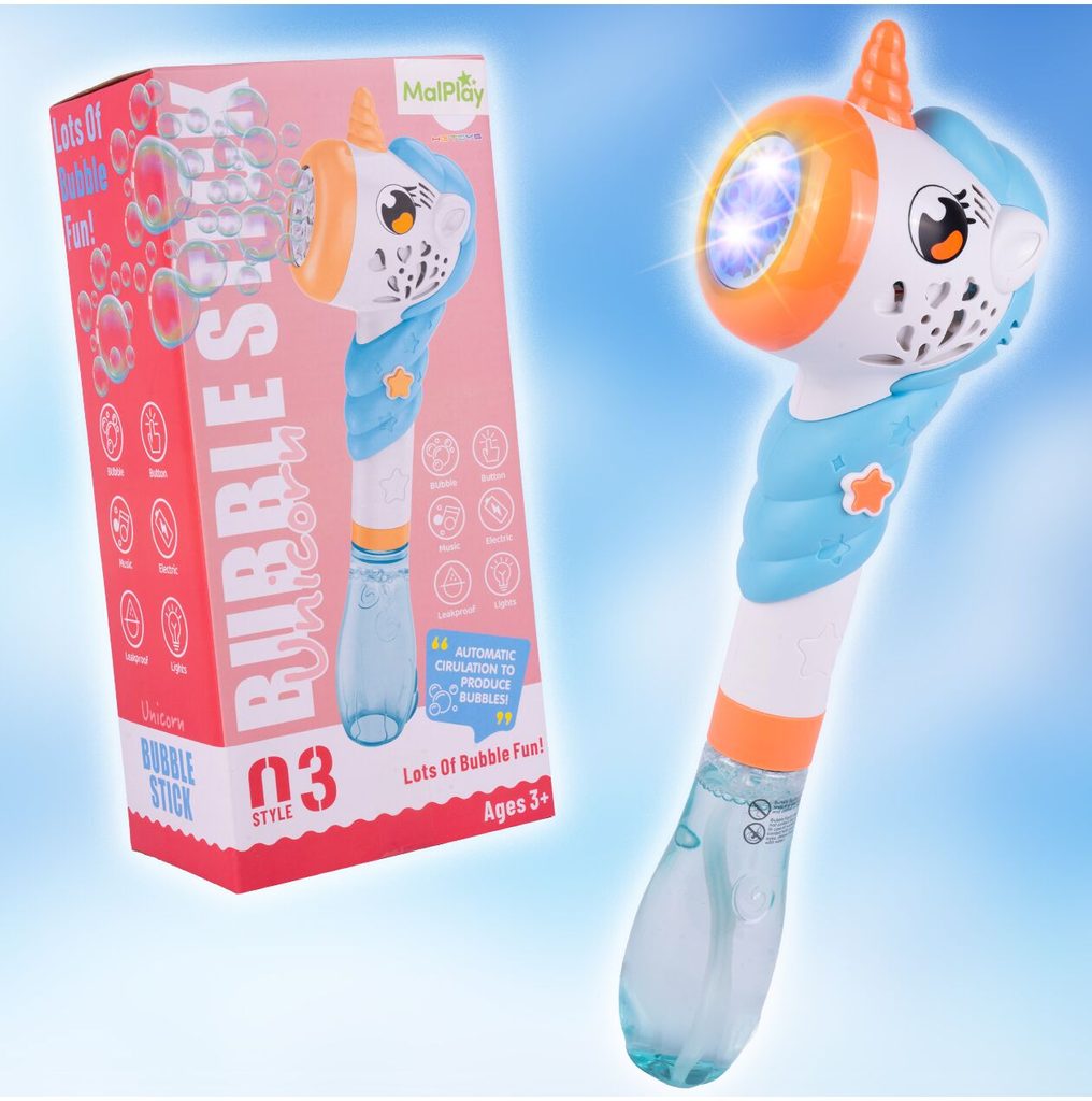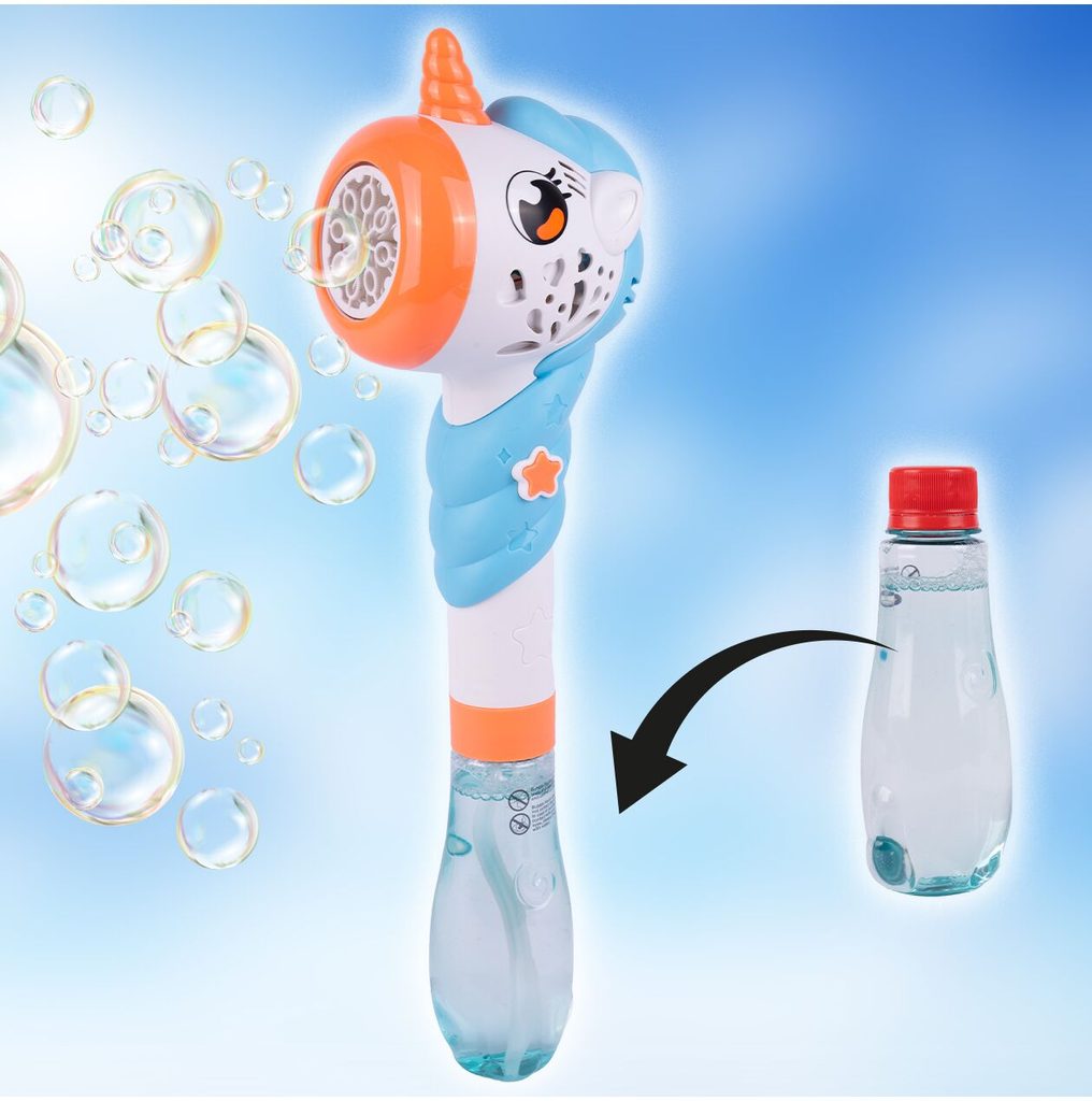 Dětský bublifuk ve tvaru jednorožce dokáže vytvořit nekonečné množství bublin. Nejdříve je třeba nalít mýdlový roztok do zásobníku ve spodní části bublifuku. Zmáčknutím tlačítka se spouští generátor bublin spolu s melodiemi a světýlkem. Po ukončení hry je třeba zásobník vylít a vytřít ho suchým hadříkem. Hračka je vyrobena z plastu a je určena pro děti od 36 měsíců věku.