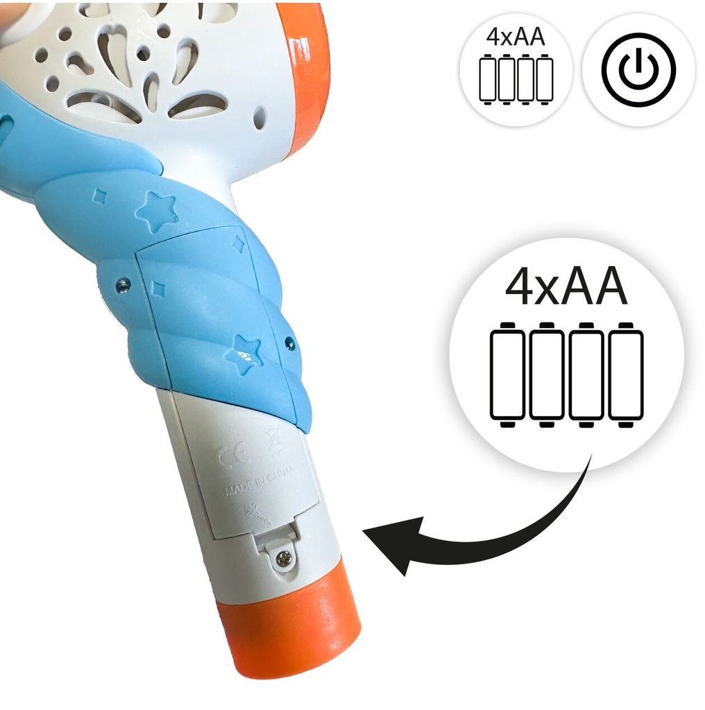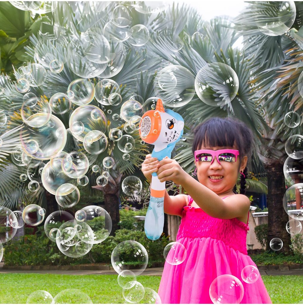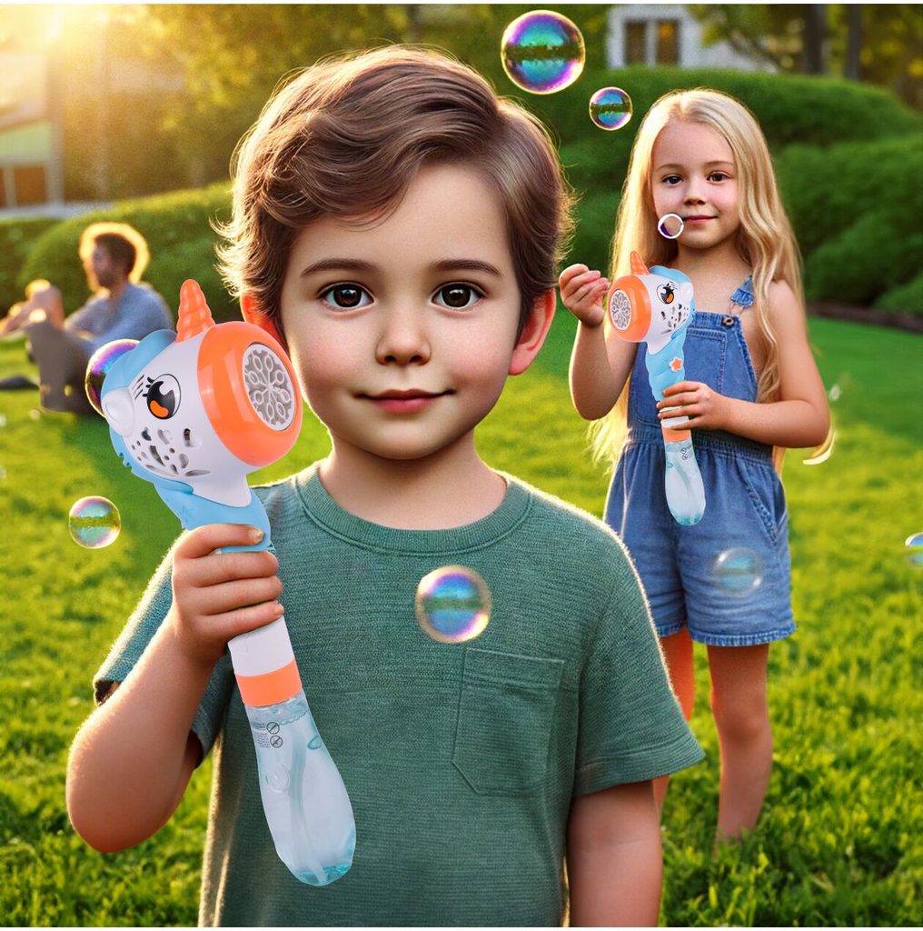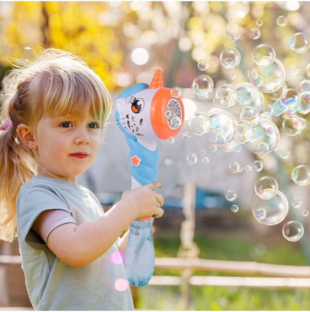 Dětský bublifuk ve tvaru jednorožce dokáže vytvořit nekonečné množství bublin. Nejdříve je třeba nalít mýdlový roztok do zásobníku ve spodní části bublifuku. Zmáčknutím tlačítka se spouští generátor bublin spolu s melodiemi a světýlkem. Po ukončení hry je třeba zásobník vylít a vytřít ho suchým hadříkem. Hračka je vyrobena z plastu a je určena pro děti od 36 měsíců věku.
