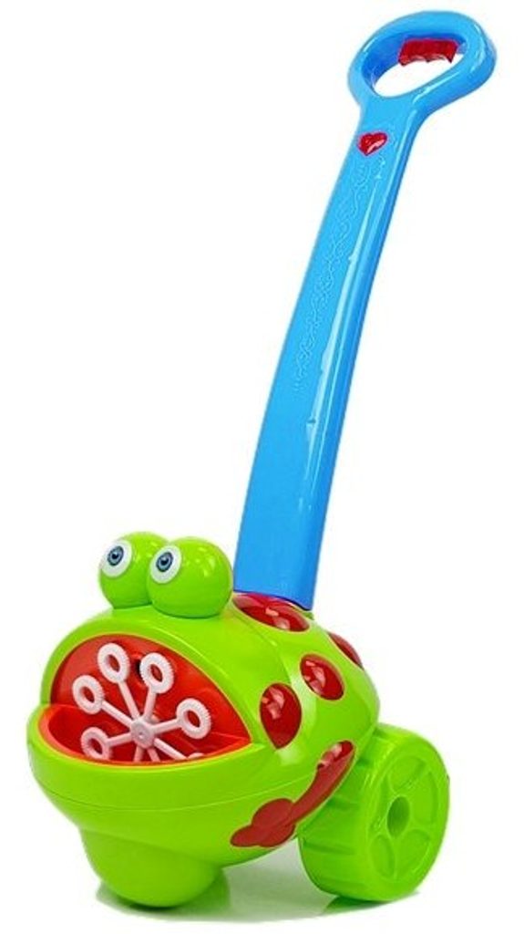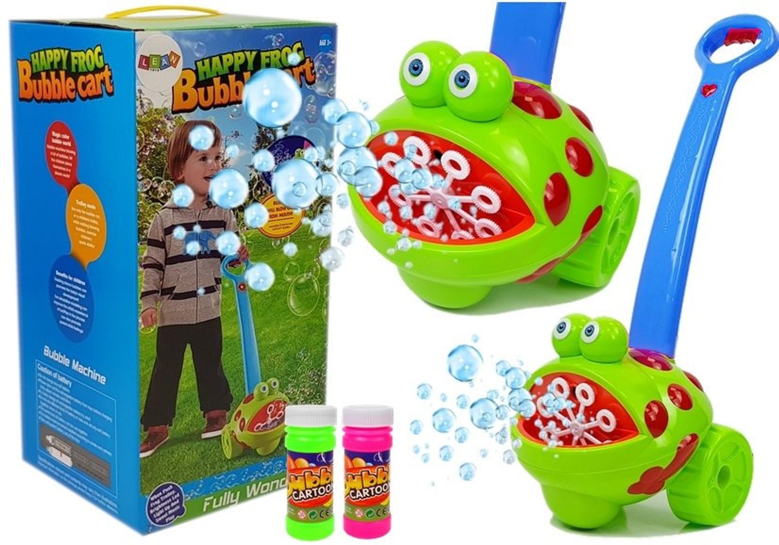 Dětský bublinkovač s kolečky a rukojeťí ve tvaru žabky Happy Frog dokáže vytvořit nekonečné množství bublin. Je vybaven plastovými kolečky a rukojetí která má délku 36 cm (od země 47,5 cm). Tu je třeba nasadit a propojit s tělem bublinkovače. Po nalití mýdlového roztoku do nádržky pod generátorem bublin se začnou během jízdy vyrábět bubliny za doprovodu melodií a světýlka. Hra venku se tak stane velmi zajímavou. Hračka je vyrobena z plastu a je určena pro děti od 36 měsíců věku.