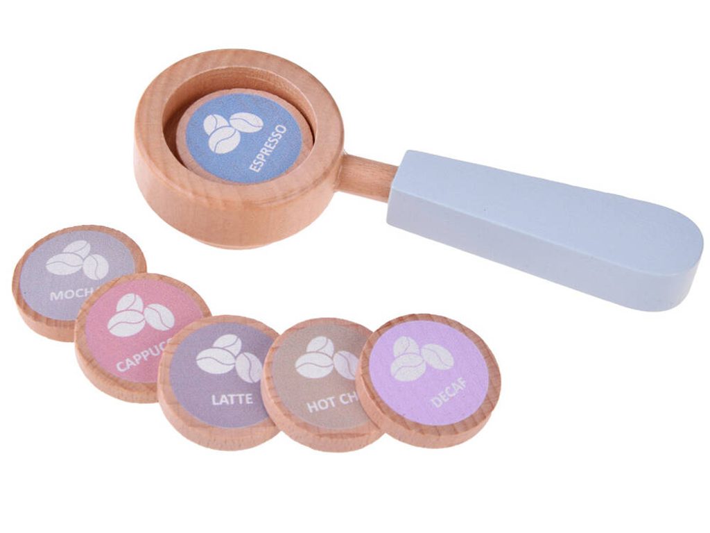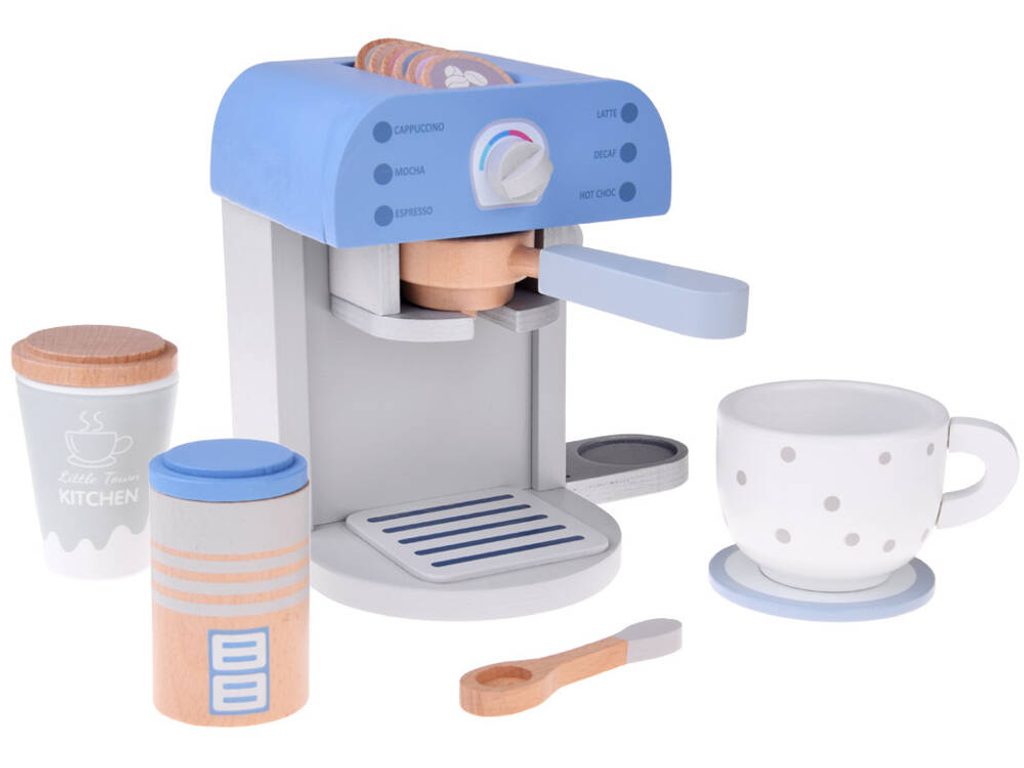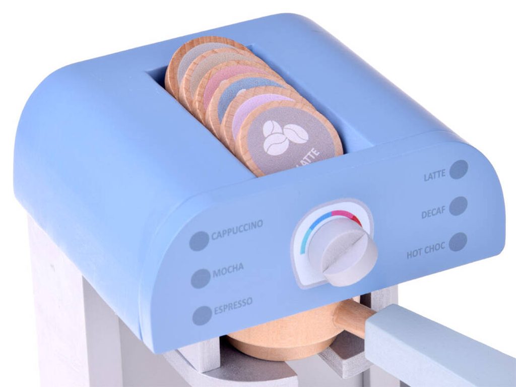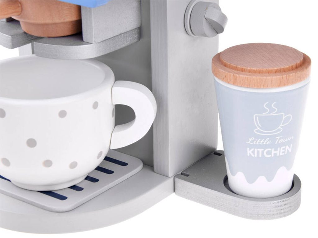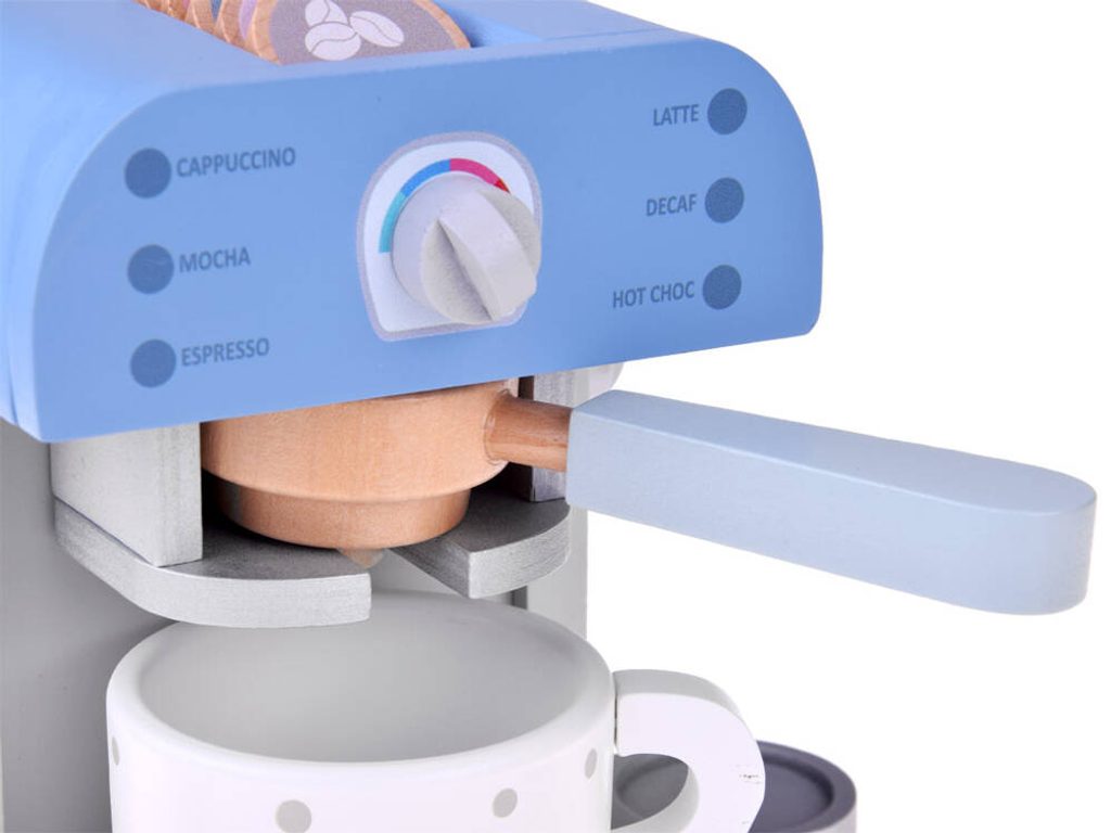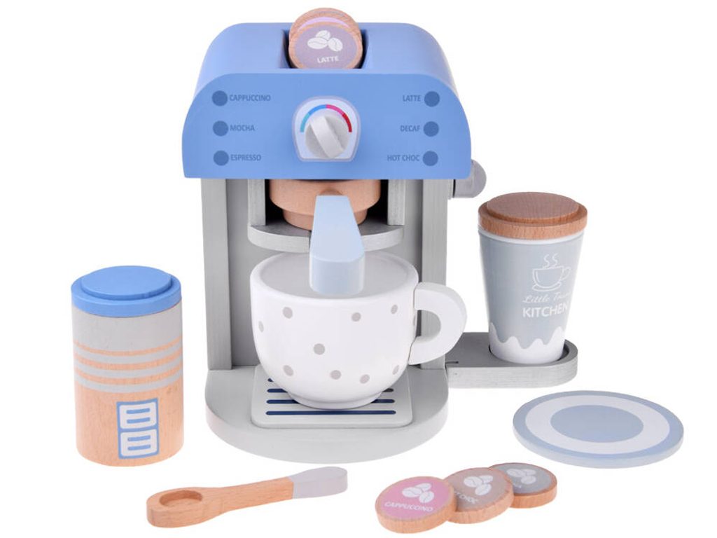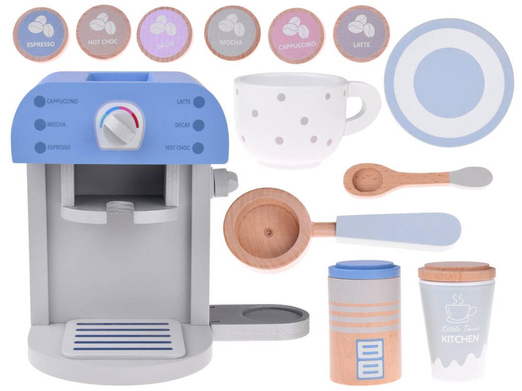 Pěkný a elegantní dřevěný kávovar se šálkem a příslušenstvím je nezbytnou výbavou každé kuchyně, kanceláře nebo kavárny. Tato hračka, vyrobená z kvalitního dřeva v bílých a několika odstínech modré barvy, přináší vysokou estetickou hodnotu, bezpečnost, komfort používání, a odolnost proti poškození. Vysoká kvalita zpracování a důraz na detaily činí každou hru s touto sadou příjemnou a uvolňující. Dřevěný kávovar je vybaven knoflíky a dalšími příslušenstvími, které dělají hru ještě realističtější. Sada obsahuje vše potřebné pro hraní role malého baristy: krásný kávovar s pohyblivou a výsuvnou lžičkou, šálek se lžičkou a podšálkem, hrnek s víčkem na kávu s sebou, cukřenku/kořenku s víkem a až šest druhů kávy k přípravě. Hrací kávovar je ideální pro zábavu doma, v kavárně nebo na večírku s medvídky a panenkami.