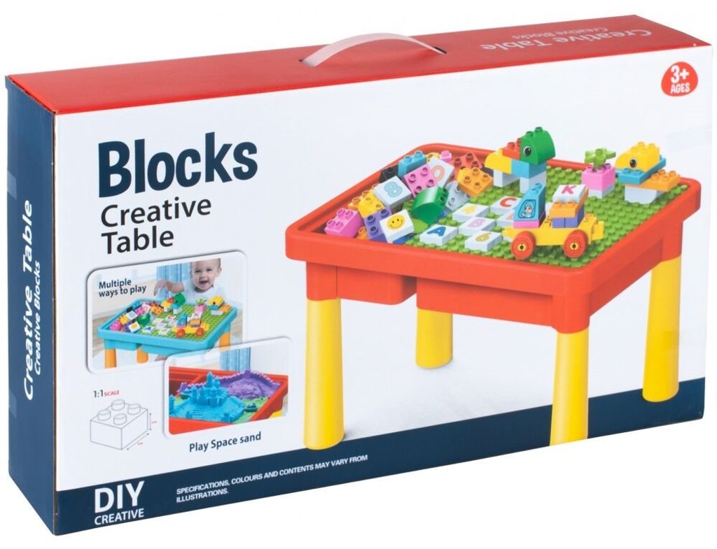 Dětský herní stoleček Creative Table je ideální hračkou pro všechny malé konstruktéry. Součástí sestavy je kromě stolečku 50 kostek v různých barvách. Stoleček je rozdělený na dva úložné prostory. Jeden z nich je překrytý deskou s výstupky, které slouží jako základna pro hru. Hračka je určena pro děti od 36 měsíců věku.