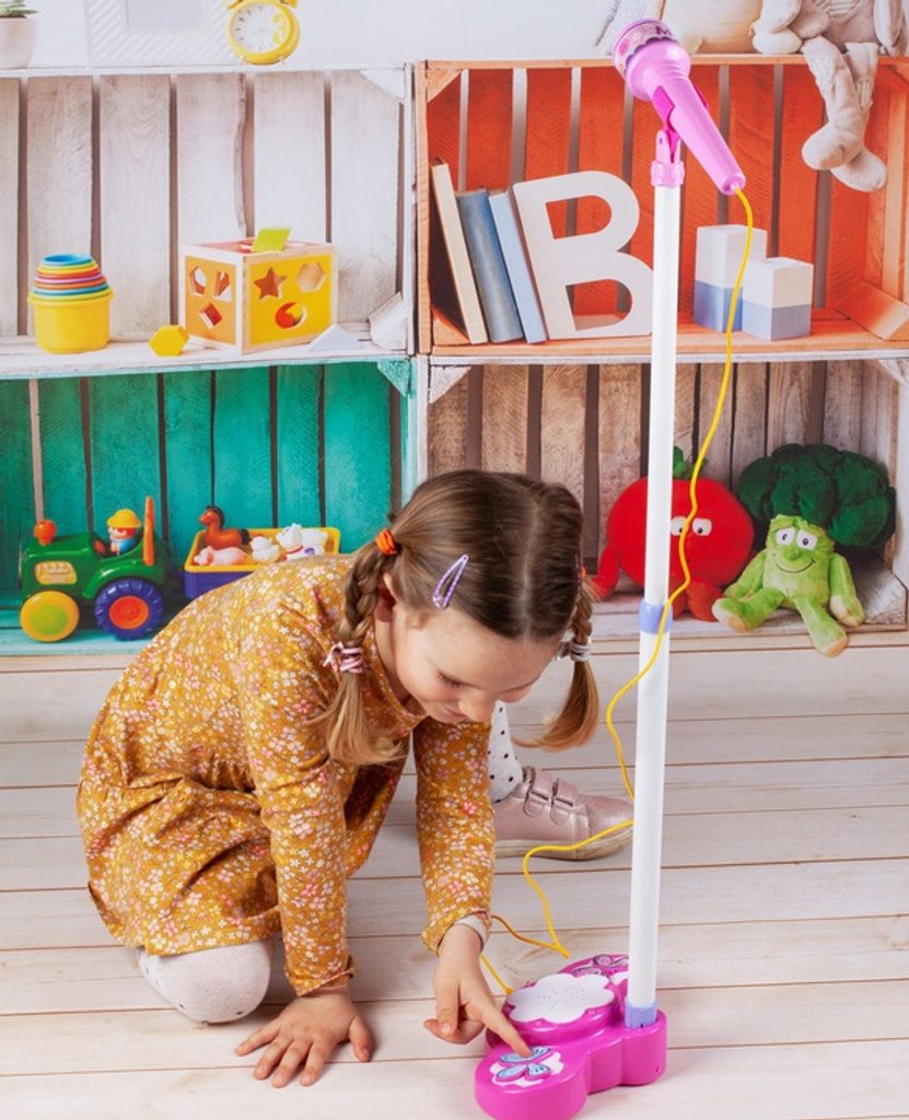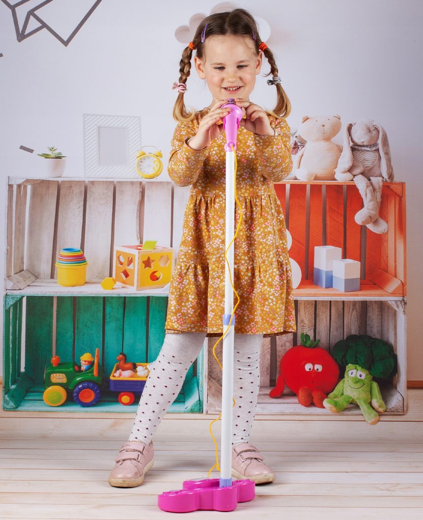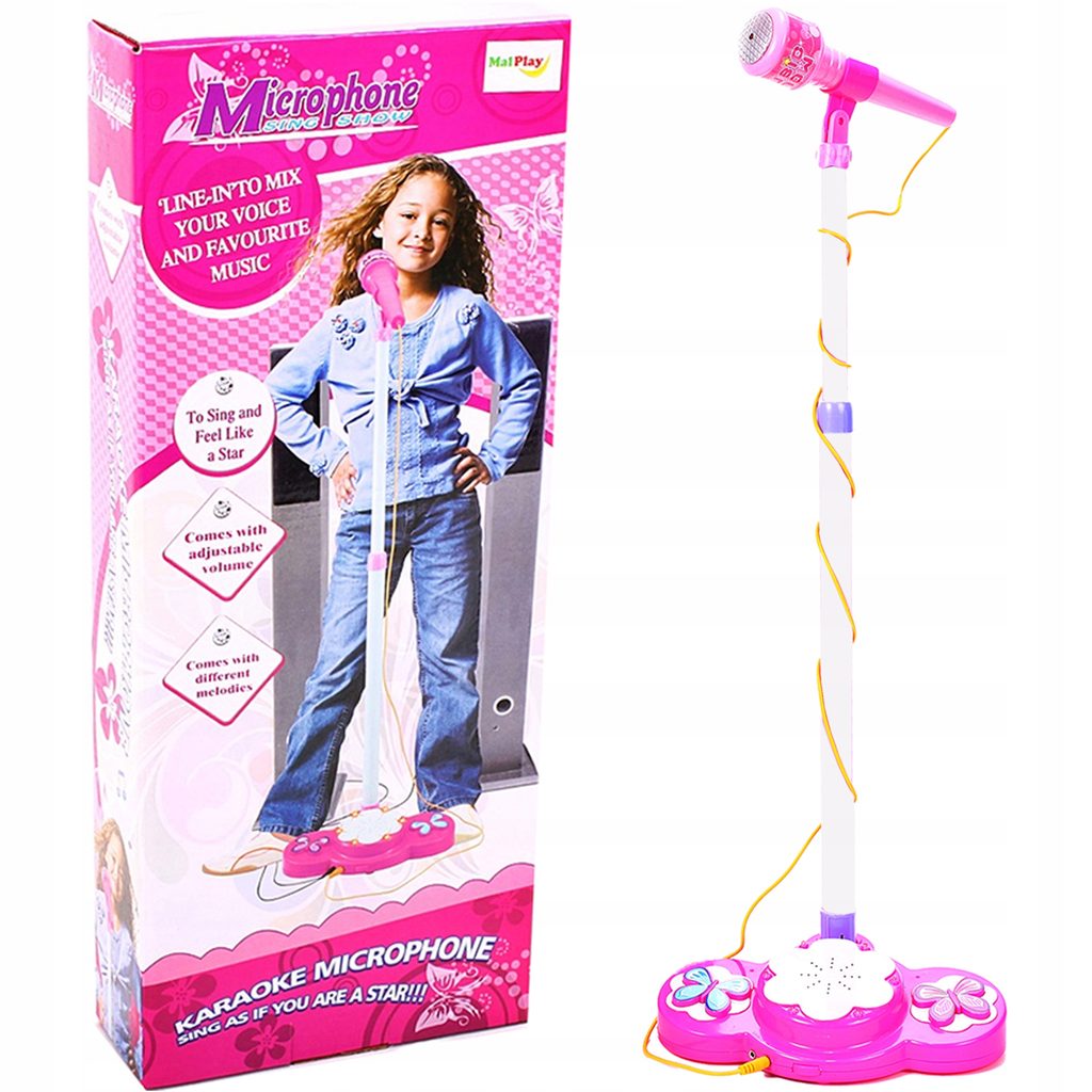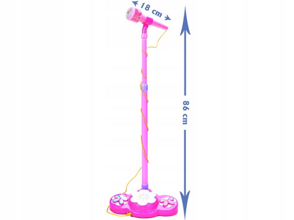 Dětský karaoke mikrofon se světelnými efekty a přehrávání přemění Vaše dítě ve skutečnou zpěvačku nebo zpěváka. Je vybavený světýlky v horní části. Lze ho připojit na MP3 přehrávač nebo telefon dítě si tak může pouštět své oblíbené písničky a podklady. Také má 11 přednastavených skladeb. Stojan má výšku až 86 cm. Hračka je vyrobená z kvalitního plastu a určena pro děti od 3 let.