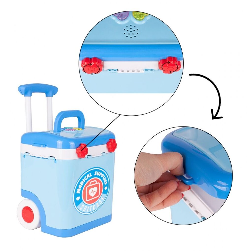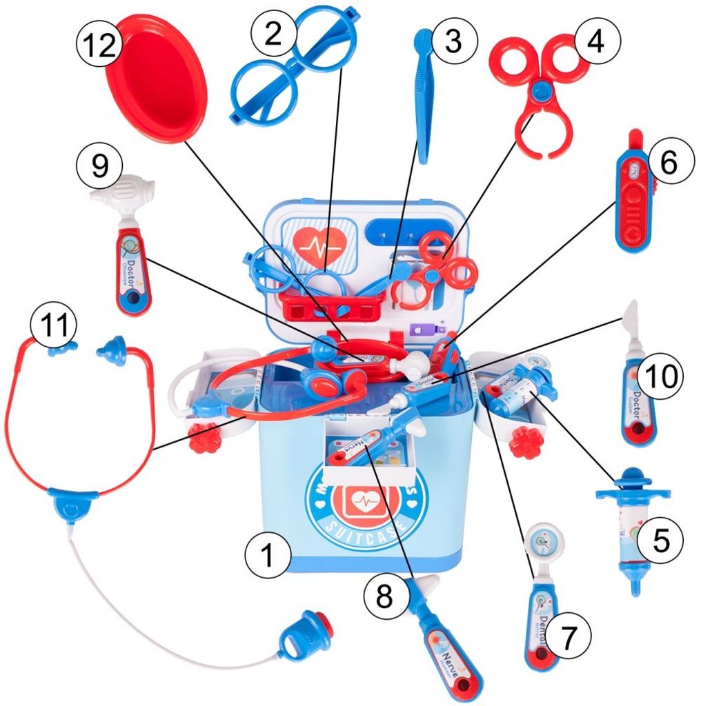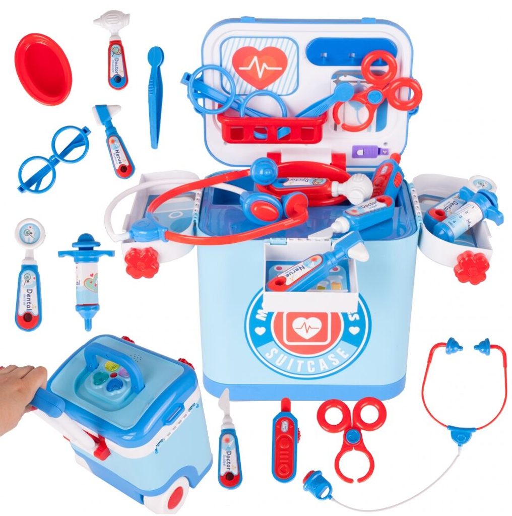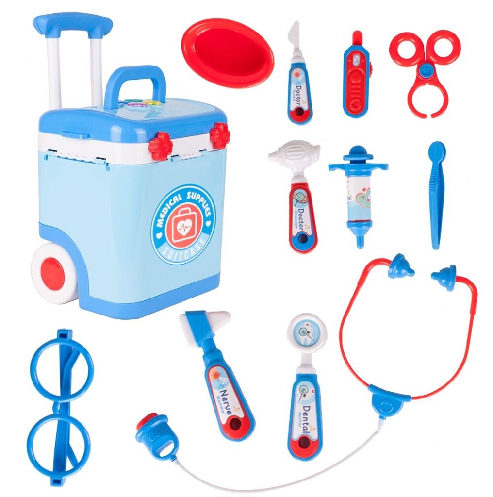 Lékařský kufřík s kolečky Family Doctor je určen pro děti od 36 měsíců věku. Je vybaven celkem 11 součástmi. Jako základ slouží praktický kufřík ve kterém je vše uloženo. je vybavený kolečky, popruhem a úchytem. Uvnitř najdete stetoskop, teploměr, brýle, pinzetu, kleště, kladívko, stříkačku, skalpel, misku, zrcadlo a otoskop. Na víku kufříku jsou umístěny 4 tlačítka ve tvaru srdíček, které zmáčknutím spouštějí melodie a světýlka. Vaše dítě se určitě s touto hračkou nudit nebude a návštěva u skutečného doktora pro něj nebude tolik stresující. Kufřík a vše uvnitř je vyrobeno z kvalitního plastu v pestrobarevném provedení.