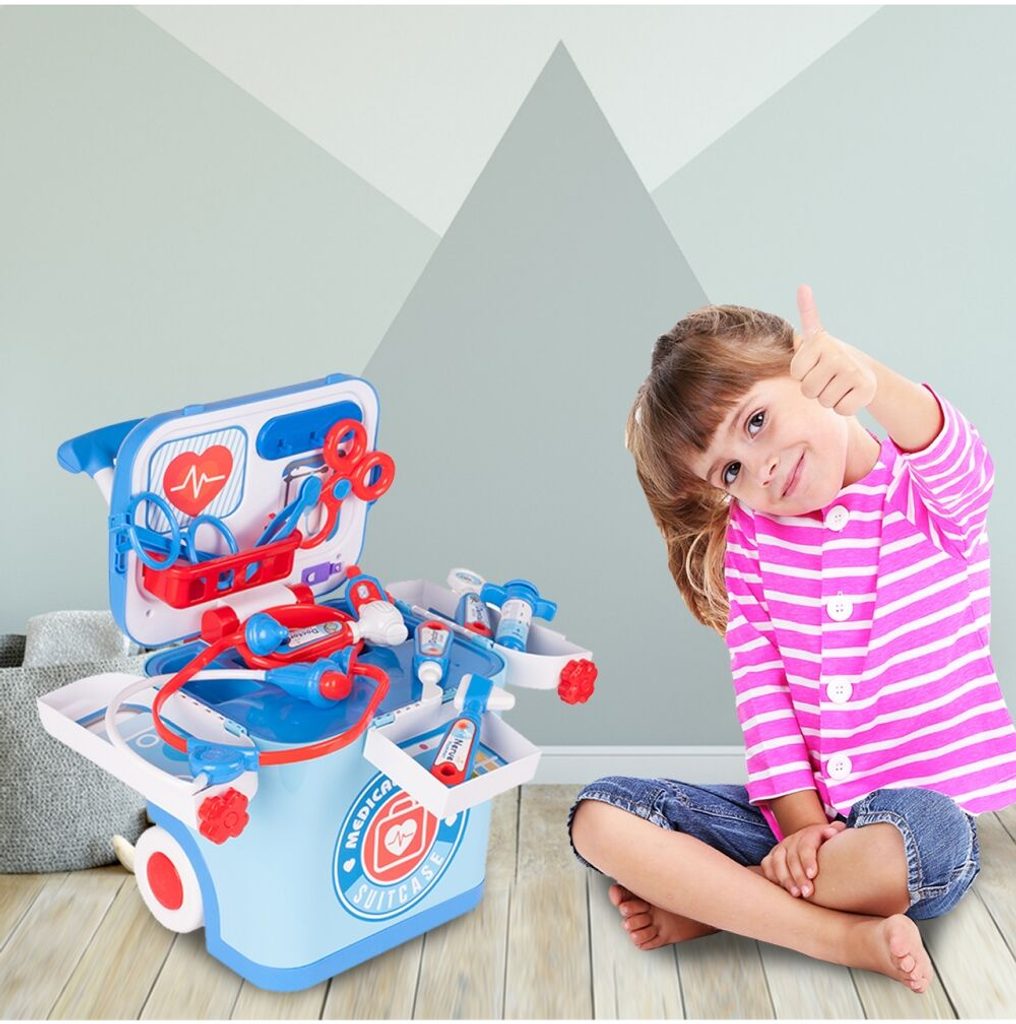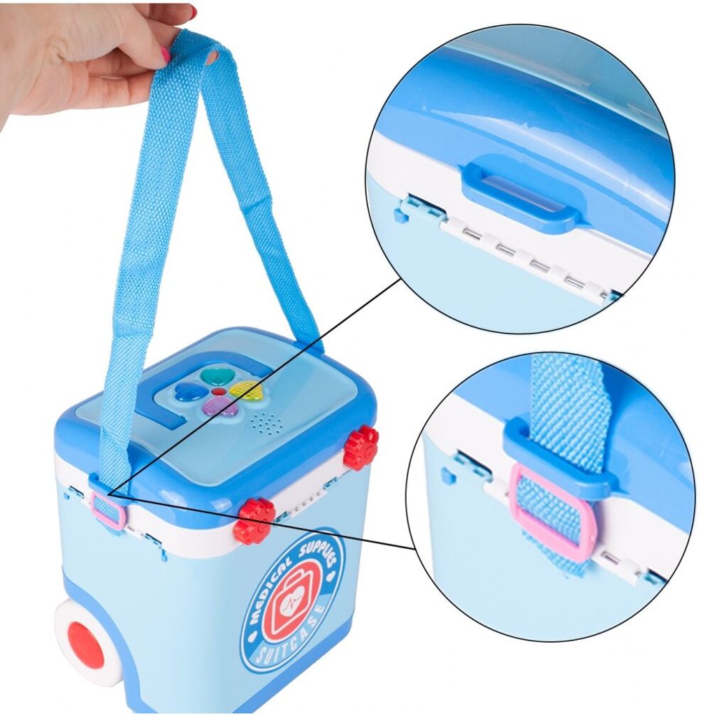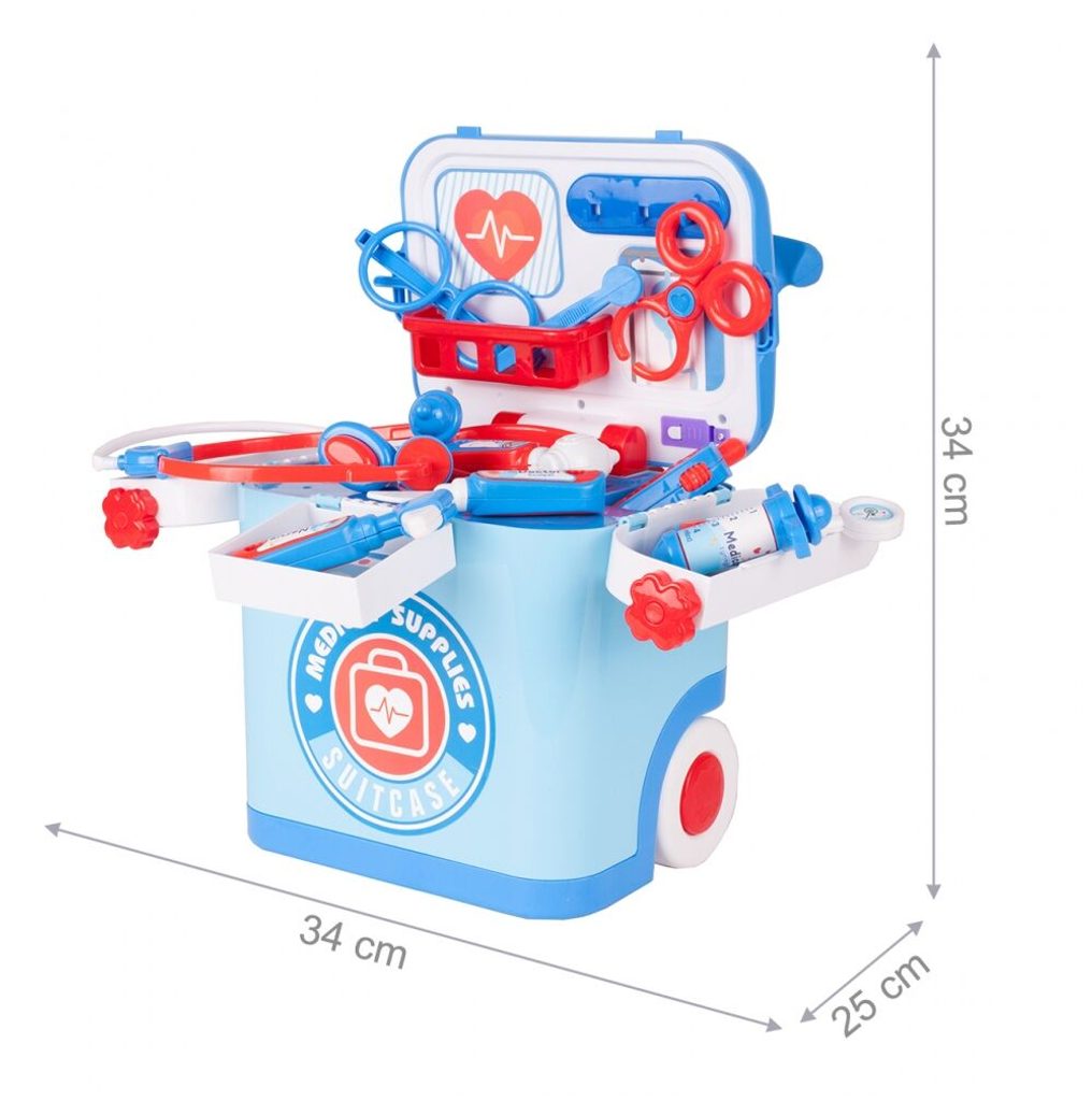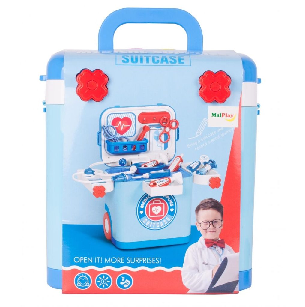 Lékařský kufřík s kolečky Family Doctor je určen pro děti od 36 měsíců věku. Je vybaven celkem 11 součástmi. Jako základ slouží praktický kufřík ve kterém je vše uloženo. je vybavený kolečky, popruhem a úchytem. Uvnitř najdete stetoskop, teploměr, brýle, pinzetu, kleště, kladívko, stříkačku, skalpel, misku, zrcadlo a otoskop. Na víku kufříku jsou umístěny 4 tlačítka ve tvaru srdíček, které zmáčknutím spouštějí melodie a světýlka. Vaše dítě se určitě s touto hračkou nudit nebude a návštěva u skutečného doktora pro něj nebude tolik stresující. Kufřík a vše uvnitř je vyrobeno z kvalitního plastu v pestrobarevném provedení.