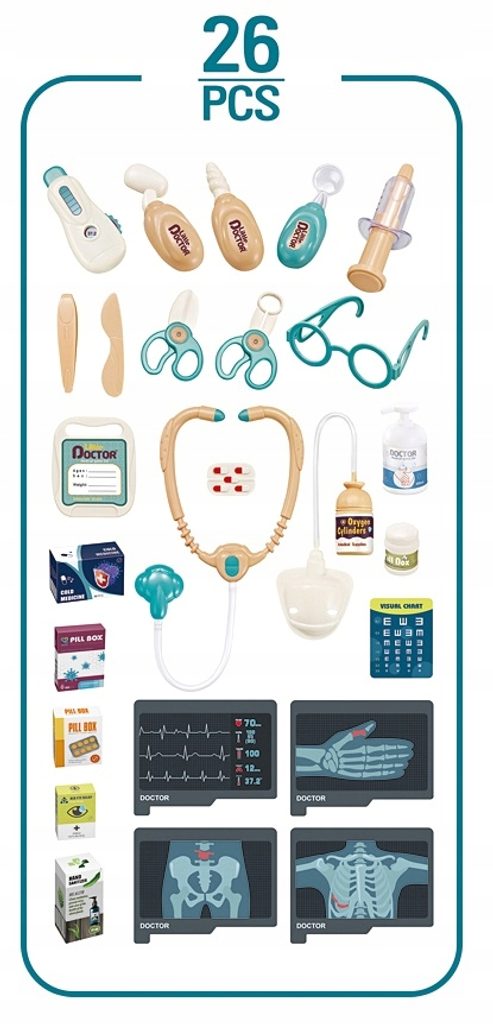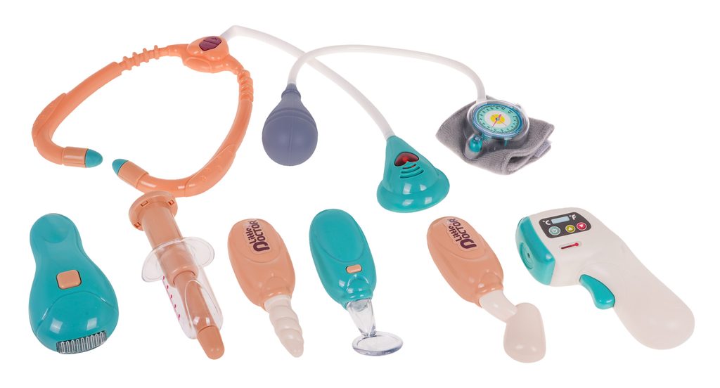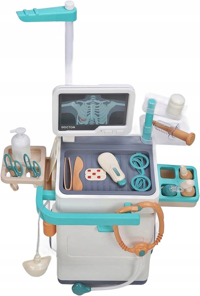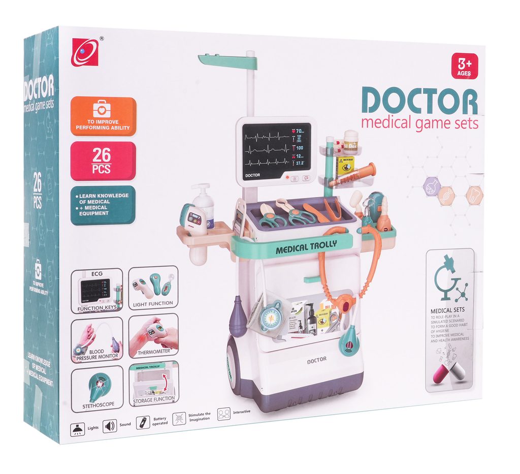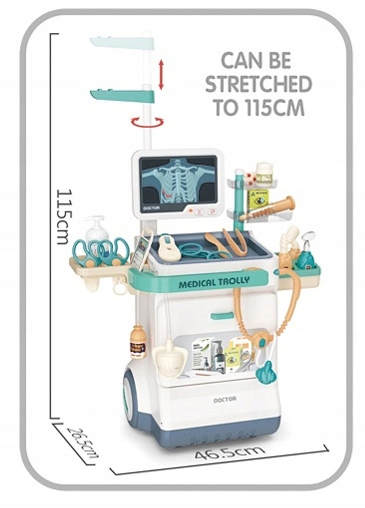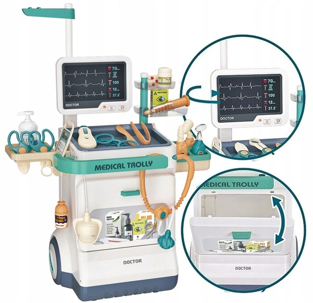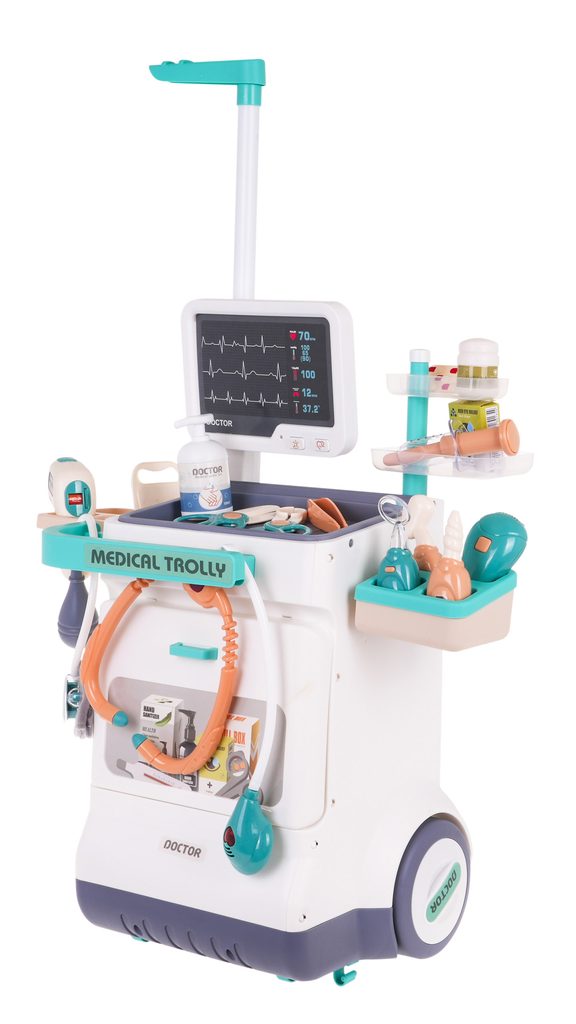 Dětský lékařský stůl s kolečky Medical Trolly je určen pro děti od 36 měsíců věku. Je vybaven mnoha elementy. Jako základ slouží RTG/EKG monitor se zvuky a melodiemi. Dále zde najdete stetoskop na baterie, zubařské zrcadlo, teploměr, skalpel, nůžky, imitace léků, teploměr, měřič tlaku, neurologické kladívko a mnoho dalších užitečných věcí, které potřebuje malý doktor nebo doktorka ke své práci. Vaše dítě se určitě s touto velkou hračkou nudit nebude a návštěva u skutečného doktora pro něj nebude tolik stresující. Je vyroben z plastu v pestrobarevném provedení.