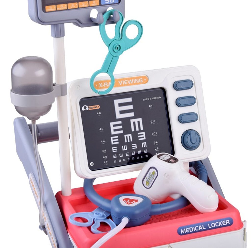 Dětský lékařský vozík Medical Cart s panelem a zvukovými efekty je určen pro děti od 36 měsíců věku. Je vybaven spoustou příslušenství pro každého malého doktora. Jako základ slouží panel se zvukovými efekty. Dále zde najdete stetoskop se zvukem bijícího srdce, otoskop, neurologické kladívko, kleště, nůžky, mirku, stříkačku a mnoho dalších užitečných věcí, které potřebuje malý doktor nebo doktorka ke své práci. Vaše dítě se určitě s touto velkou hračkou nudit nebude a návštěva u skutečného doktora pro něj nebude tolik stresující. Je vyrobena z kvalitního plastu v pestrobarevném provedení.