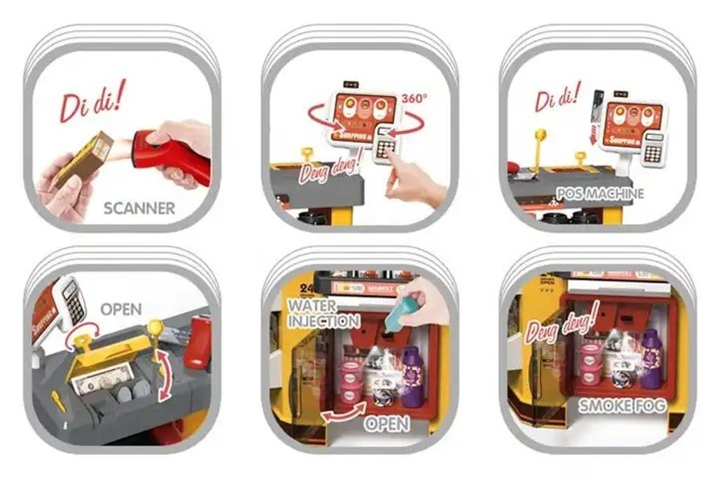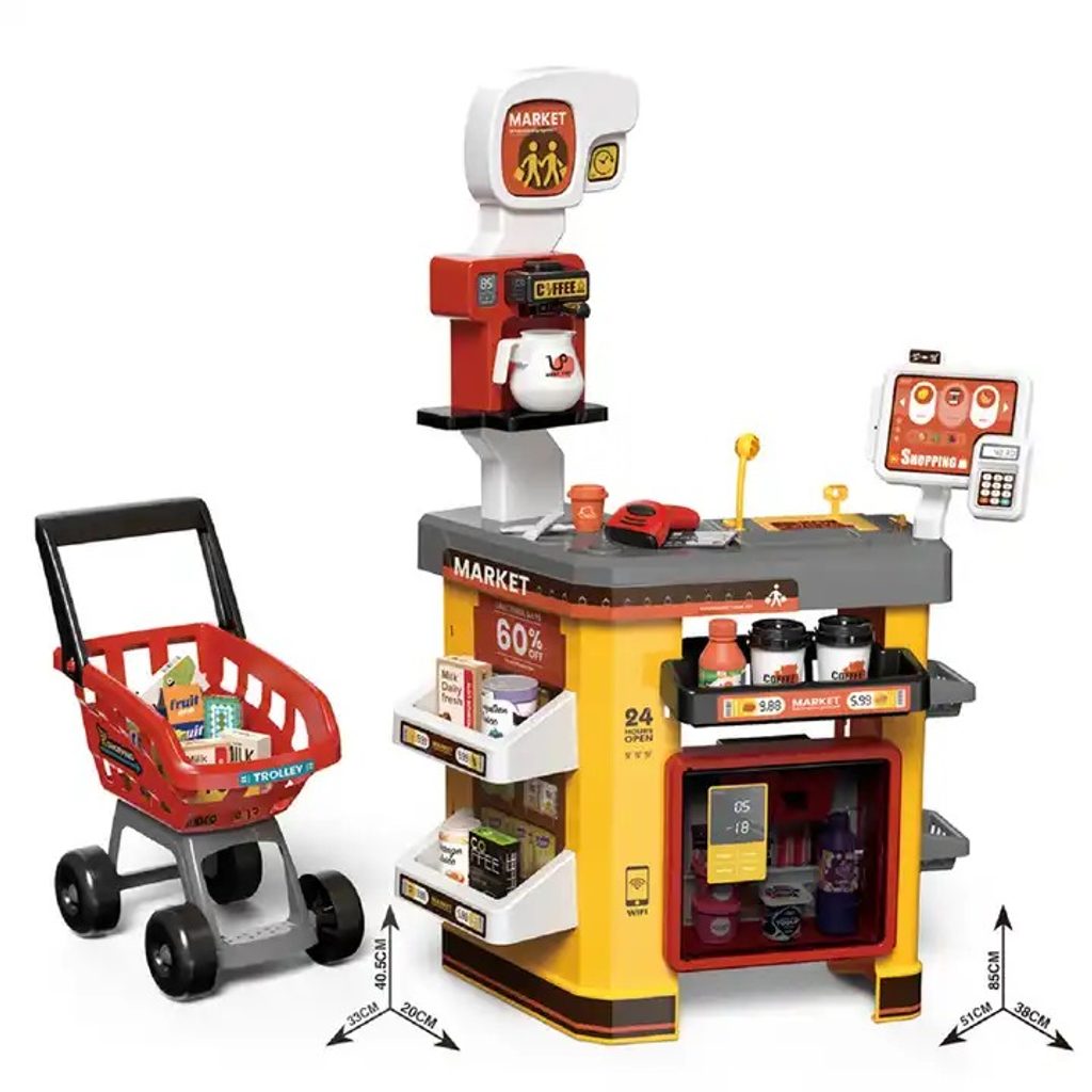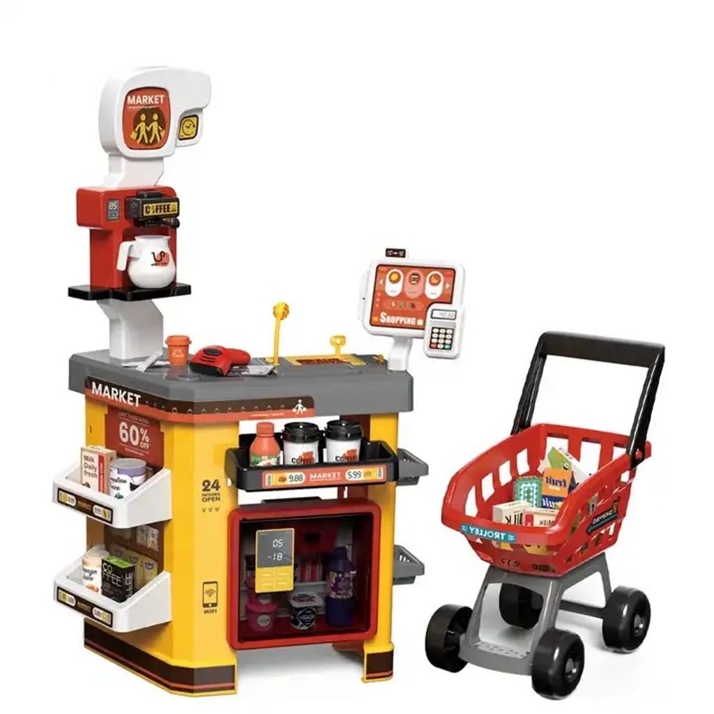 Dětský obchůdek Supermarket s nákupním košíkem a lednicí s mlhovým efektem přemění Vaše dítě ve skutečného prodavače. Je vybaven vším důležitým co takový malý obchodník potřebuje. Najdete zde pokladní terminál s otevírací přihrádkou a zvuky, čtečku čárových kódů, která vydává charakteristický zvuk, kávovar, lednici s osvětlením a mlhovým efektem,imitace potravin a další příslušenství. Obchůdek má samozřejmě police, kde může být vše přehledně vystaveno. Hračka je určena pro děti od 36 měsíců věku.