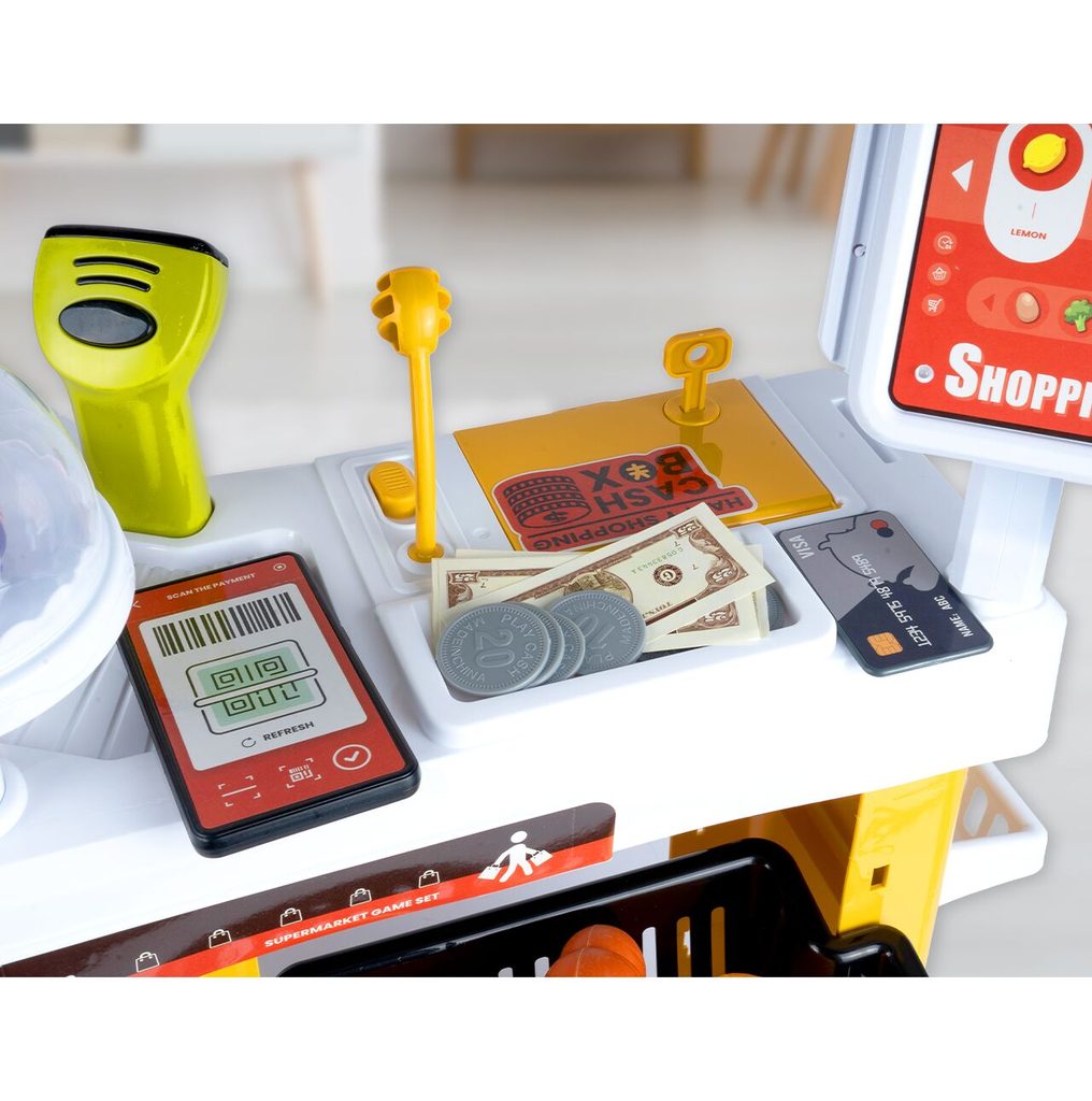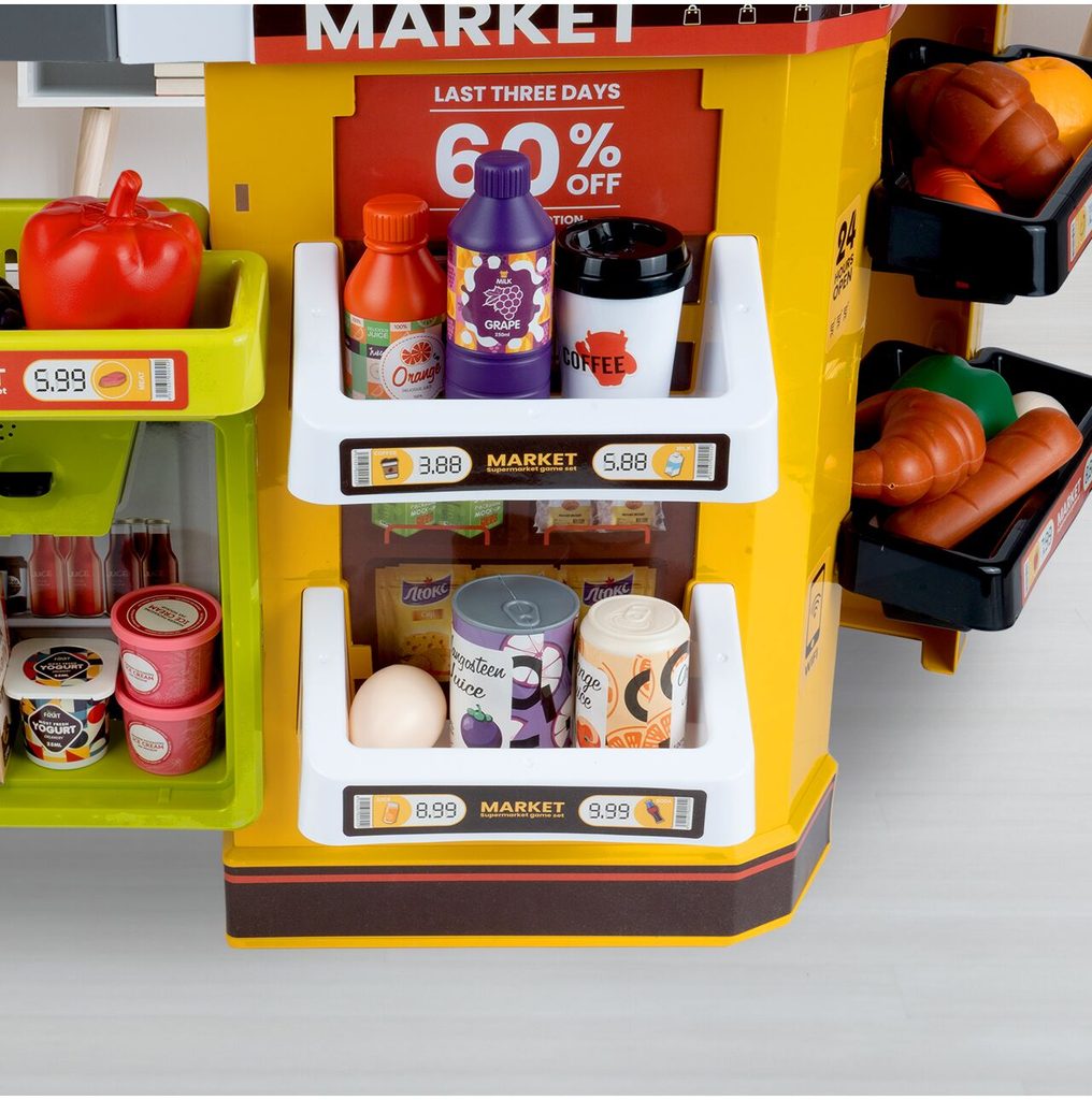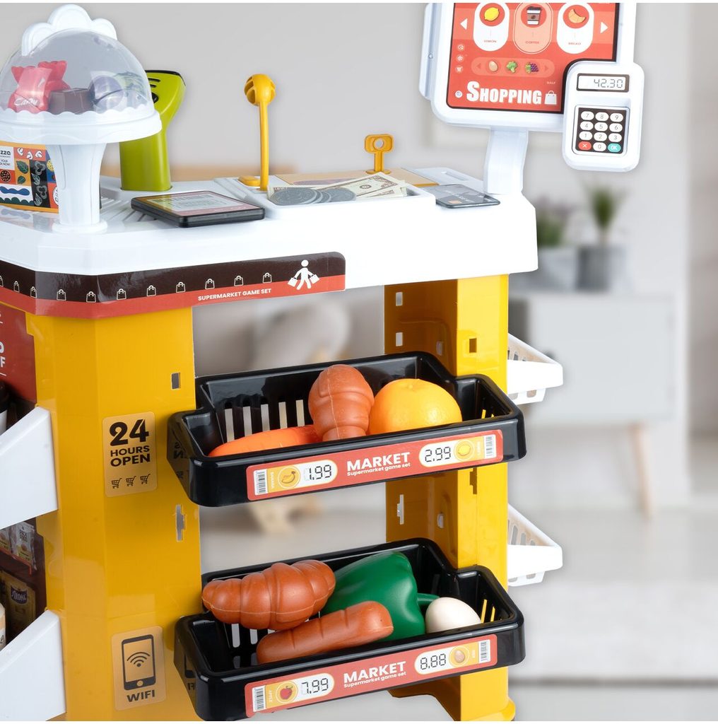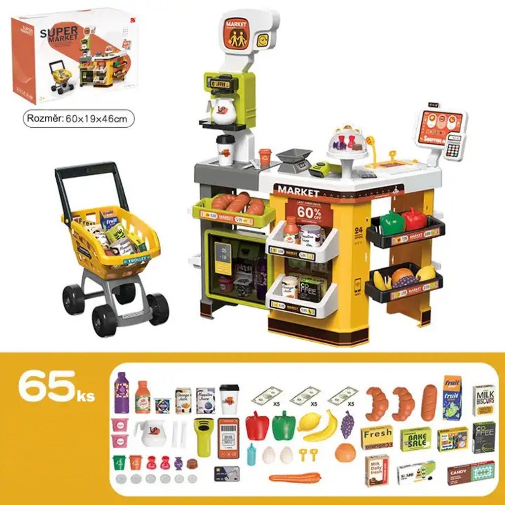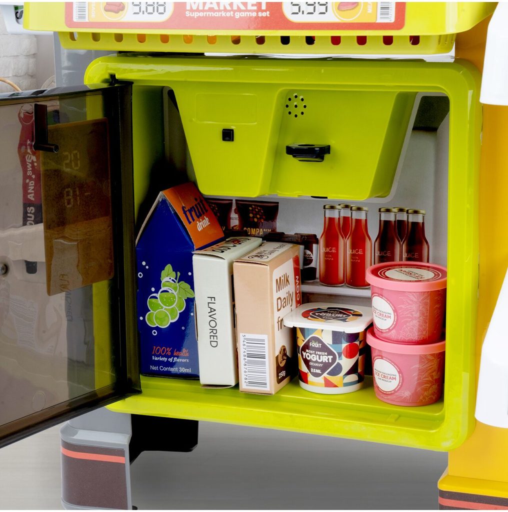Dětský obchůdek Supermarket s nákupním košíkem a lednicí s mlhovým efektem přemění Vaše dítě ve skutečného prodavače. Je vybaven vším důležitým co takový malý obchodník potřebuje. Najdete zde pokladní terminál s otevírací přihrádkou a zvuky, čtečku čárových kódů, která vydává charakteristický zvuk, kávovar, lednici s osvětlením, imitace ovoce a zeleniny, bankovky a také různé balení potravin. Obchůdek má samozřejmě police, kde může být vše přehledně vystaveno. Hračka je určena pro děti od 36 měsíců věku.