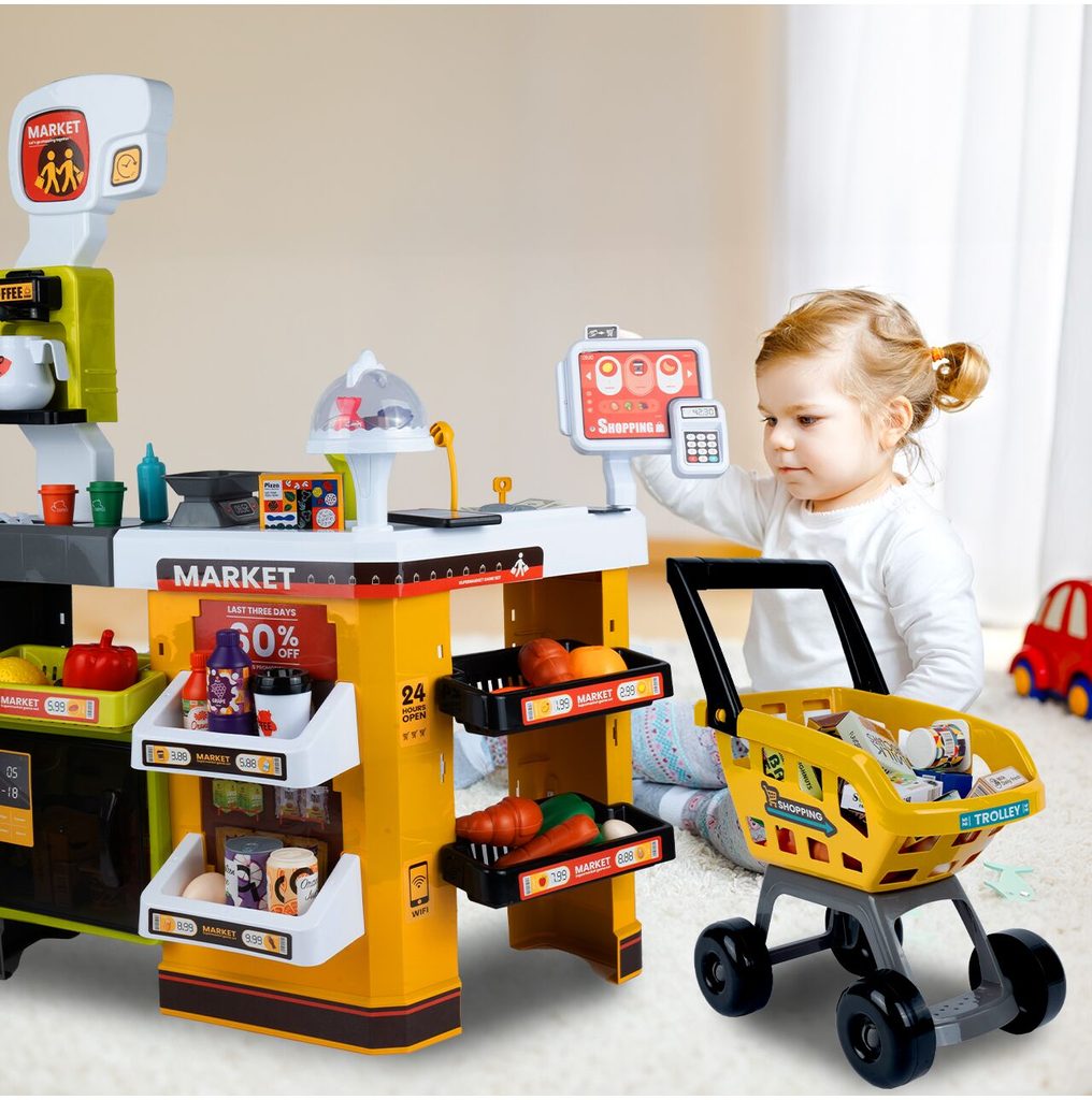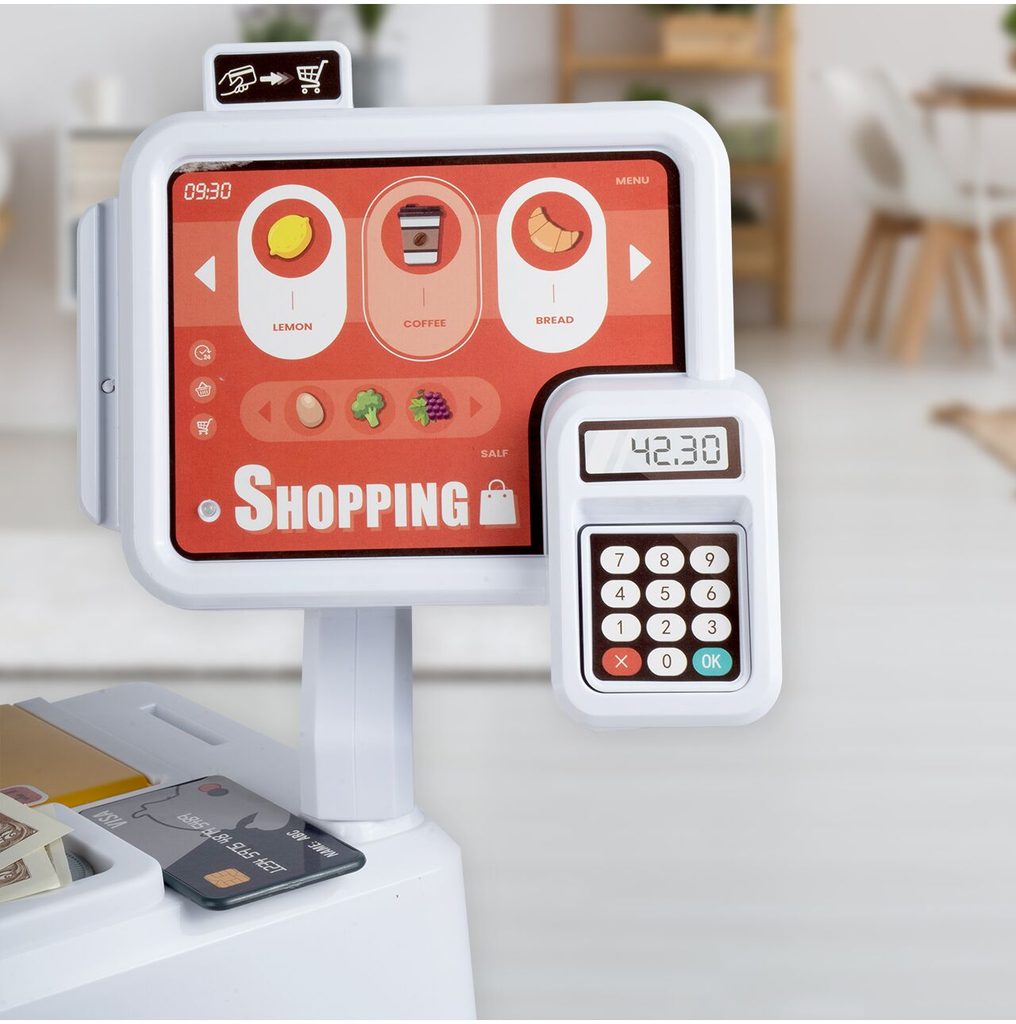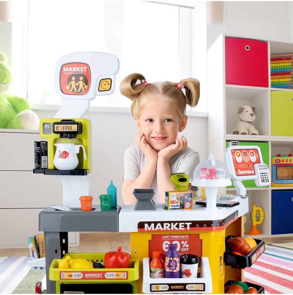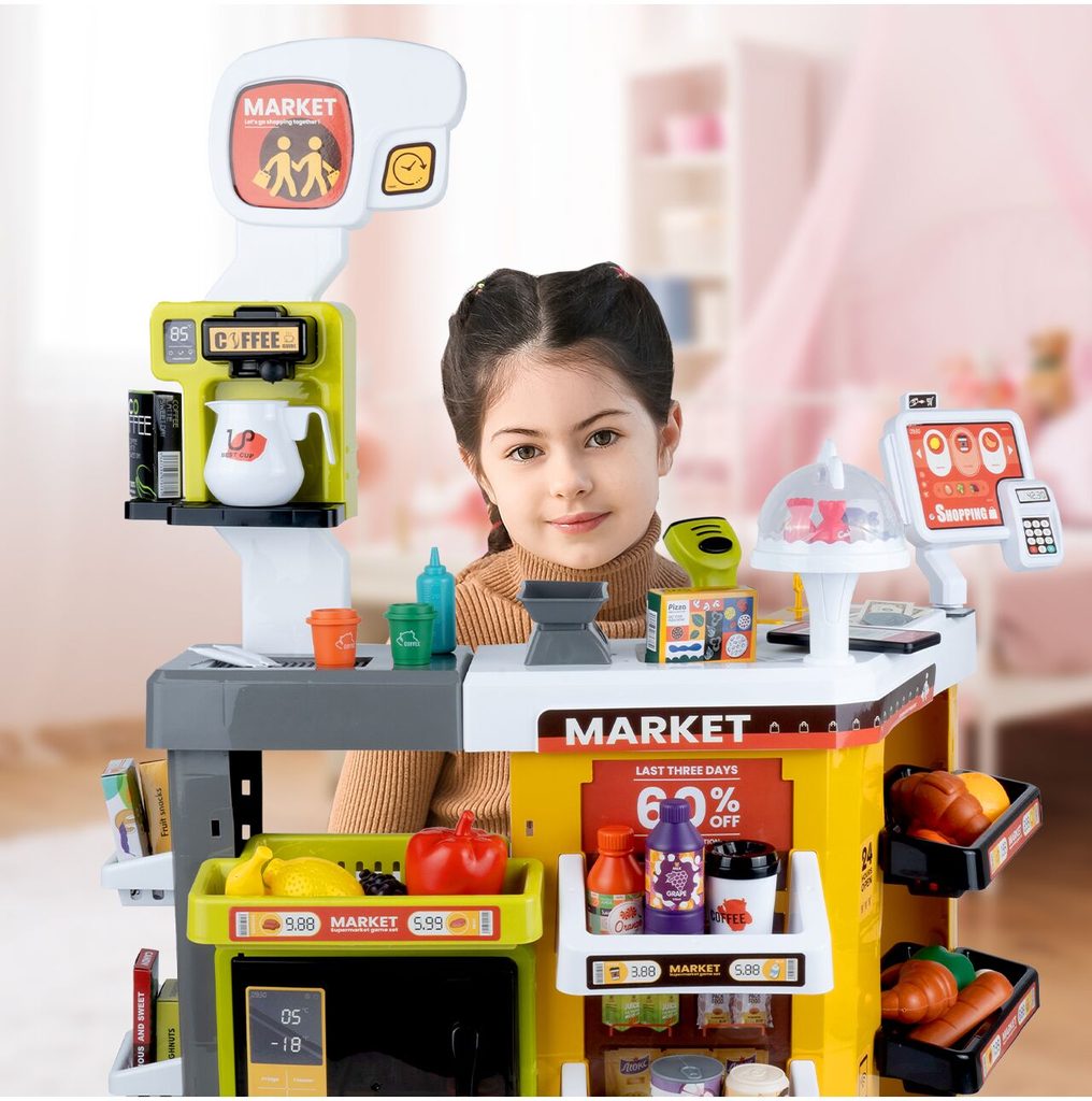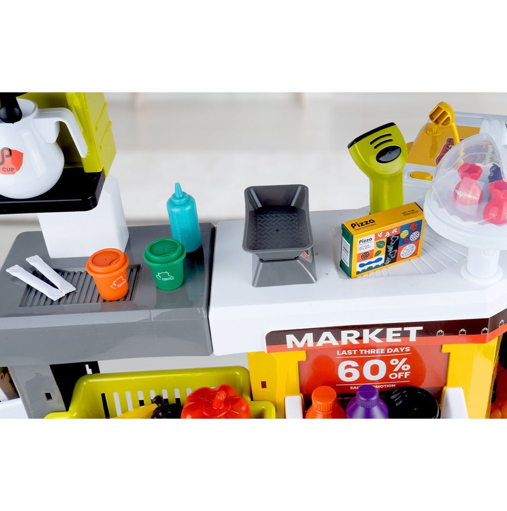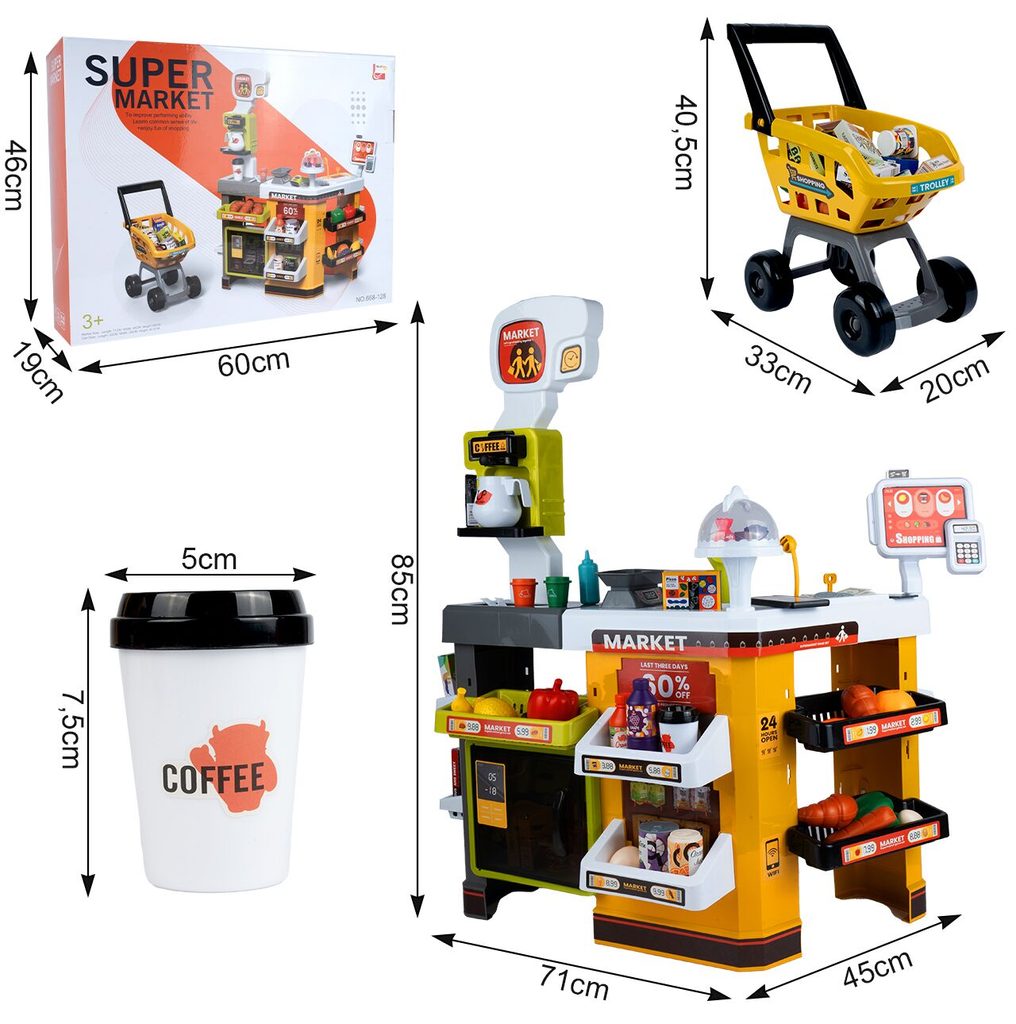 Dětský obchůdek Supermarket s nákupním košíkem a lednicí s mlhovým efektem přemění Vaše dítě ve skutečného prodavače. Je vybaven vším důležitým co takový malý obchodník potřebuje. Najdete zde pokladní terminál s otevírací přihrádkou a zvuky, čtečku čárových kódů, která vydává charakteristický zvuk, kávovar, lednici s osvětlením, imitace ovoce a zeleniny, bankovky a také různé balení potravin. Obchůdek má samozřejmě police, kde může být vše přehledně vystaveno. Hračka je určena pro děti od 36 měsíců věku.