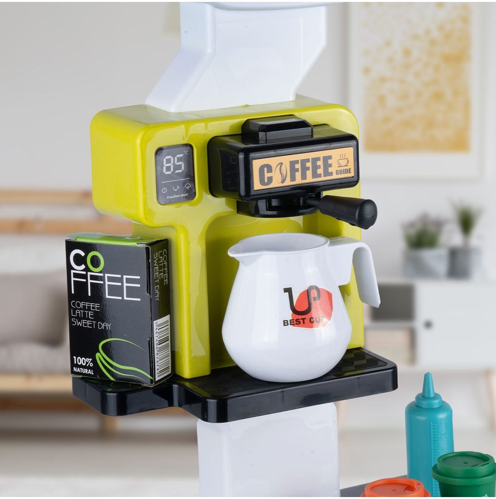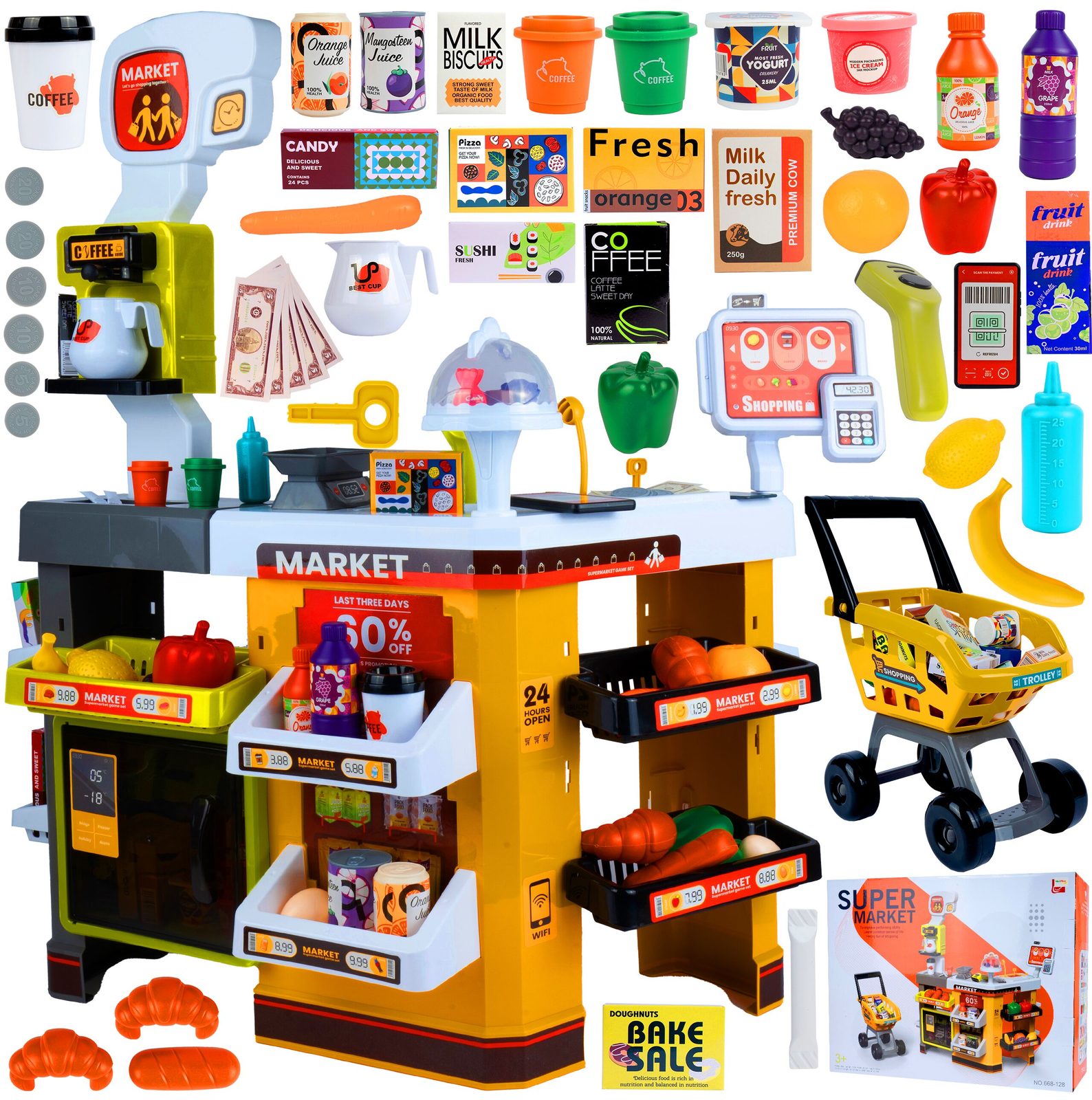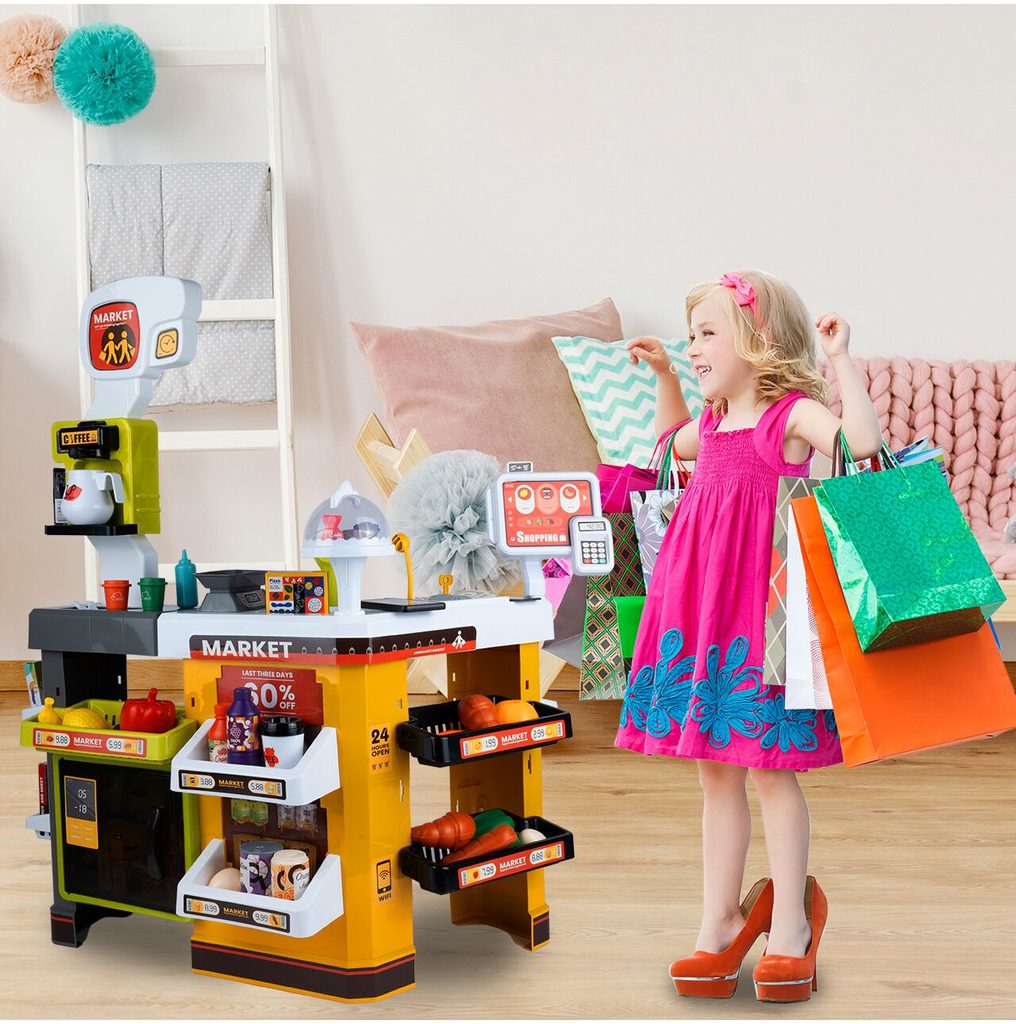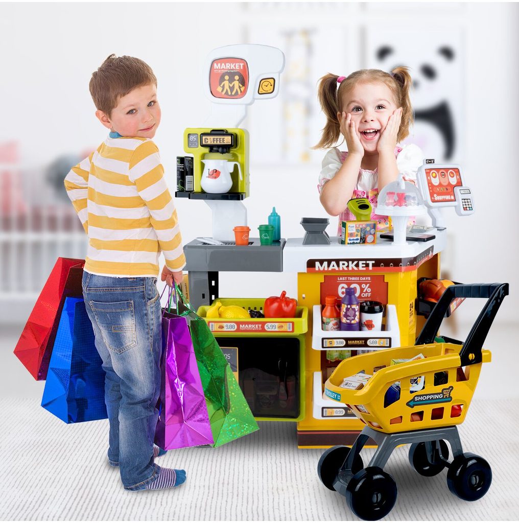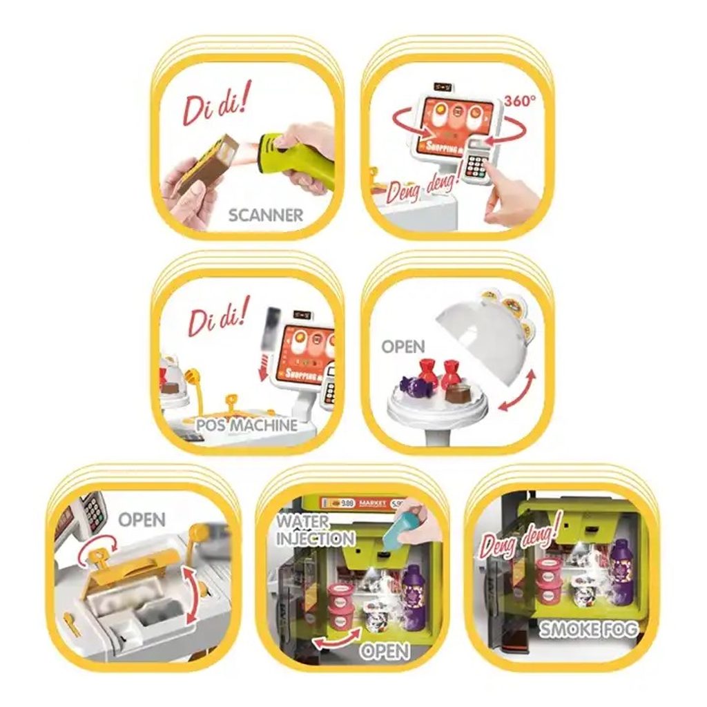 Dětský obchůdek Supermarket s nákupním košíkem a lednicí s mlhovým efektem přemění Vaše dítě ve skutečného prodavače. Je vybaven vším důležitým co takový malý obchodník potřebuje. Najdete zde pokladní terminál s otevírací přihrádkou a zvuky, čtečku čárových kódů, která vydává charakteristický zvuk, kávovar, lednici s osvětlením, imitace ovoce a zeleniny, bankovky a také různé balení potravin. Obchůdek má samozřejmě police, kde může být vše přehledně vystaveno. Hračka je určena pro děti od 36 měsíců věku.