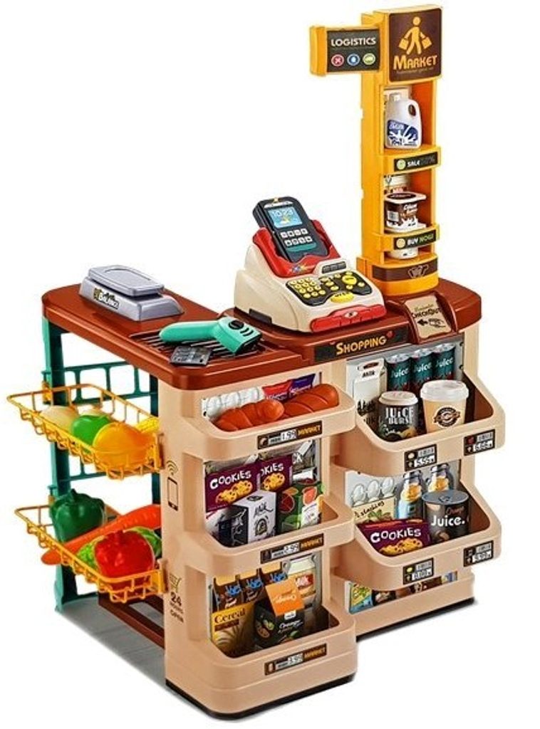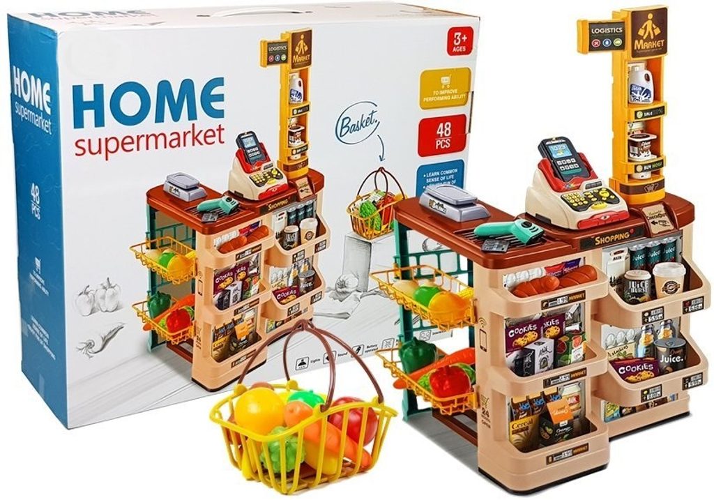 Dětský obchůdek Supermarket s nákupním košíkem přemění Vaše dítě ve skutečného prodavače. Je vybaven vším důležitým co takový malý obchodník potřebuje. Najdete zde pokladnu s tlačítky a zvuky, váhu, čtečku čárových kódů, která vydává charakteristický zvuk, imitace ovoce zeleniny, bankovky a také různé balení potravin. Obchůdek má samozřejmě police, kde může být vše přehledně vystaveno. Hračka je určena pro děti od 36 měsíců věku.
