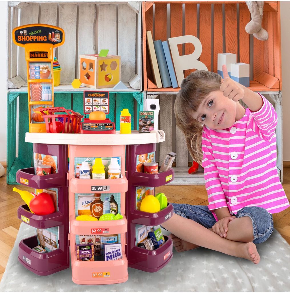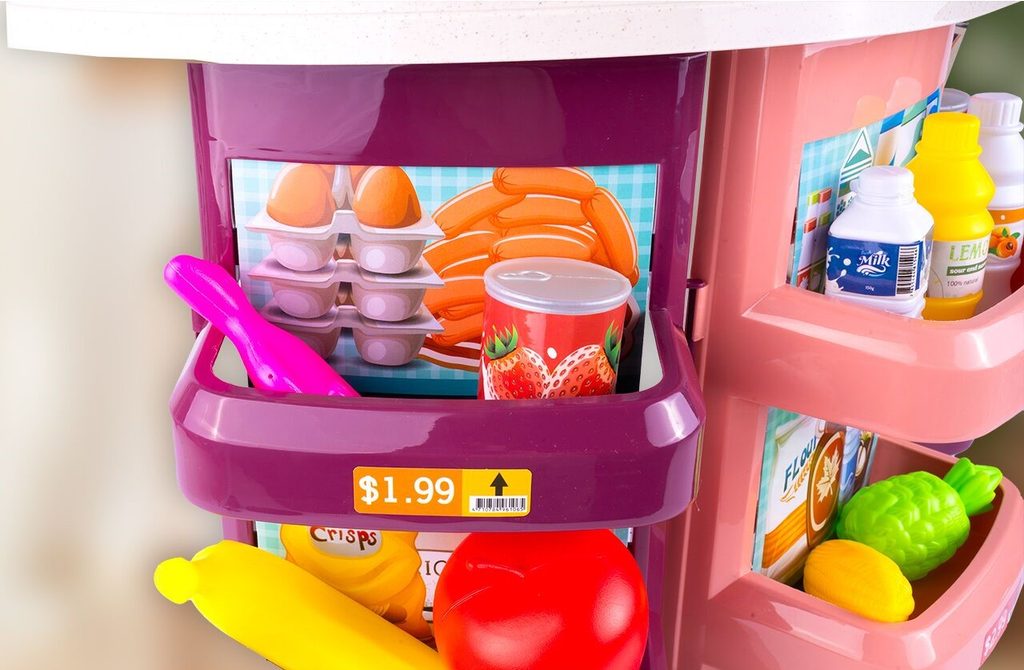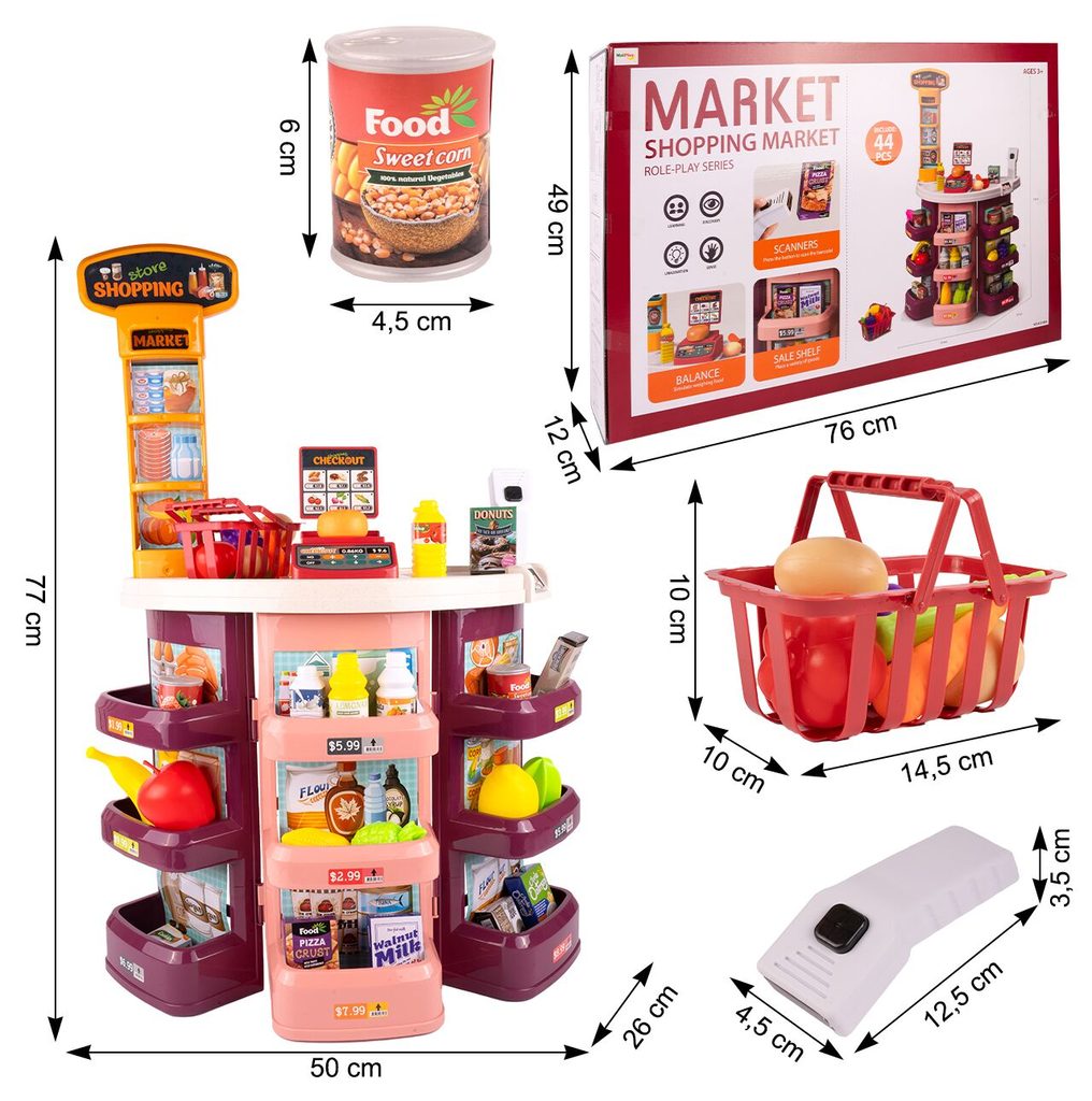 Dětský obchůdek Supermarket s nákupním košíkem přemění Vaše dítě ve skutečného prodavače. Je vybaven vším důležitým co takový malý obchodník potřebuje. Najdete zde pokladnu, čtečku čárových kódů, imitace ovoce zeleniny, bankovky a také různé balení potravin. Obchůdek má samozřejmě police, kde může být vše přehledně vystaveno. Hračka je určena pro děti od 36 měsíců věku.