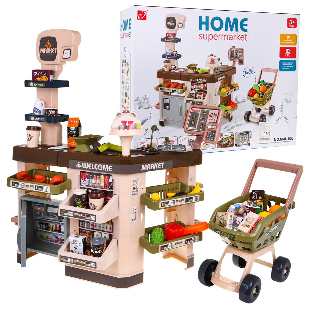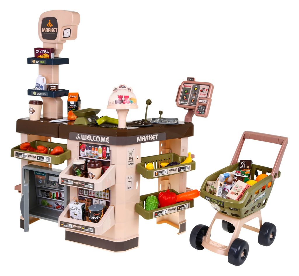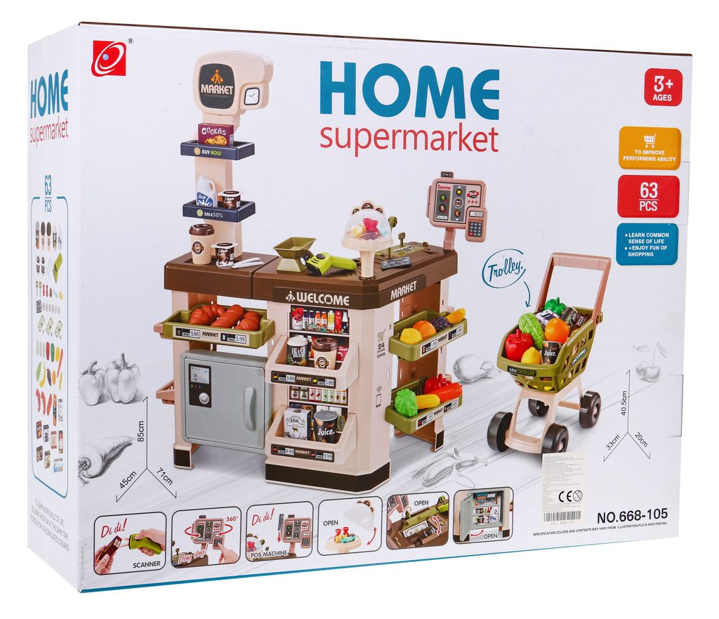 Dětský obchůdek Supermarket s nákupním vozíčkem přemění Vaše dítě ve skutečného prodavače. Je vybaven vším důležitým co takový malý obchodník potřebuje. Najdete zde pokladnu s klíčky, pohyblivou váhu, čtečku čárových kodu, která svítí a vydává charakteristický zvuk, imitace ovoce,zeleniny a potravin, bankovky,mince a také různé balení potravin. Obchůdek má samozřejmě police, kde může být vše přehledně vystaveno. Hračka je určena pro děti od 36 měsíců věku.