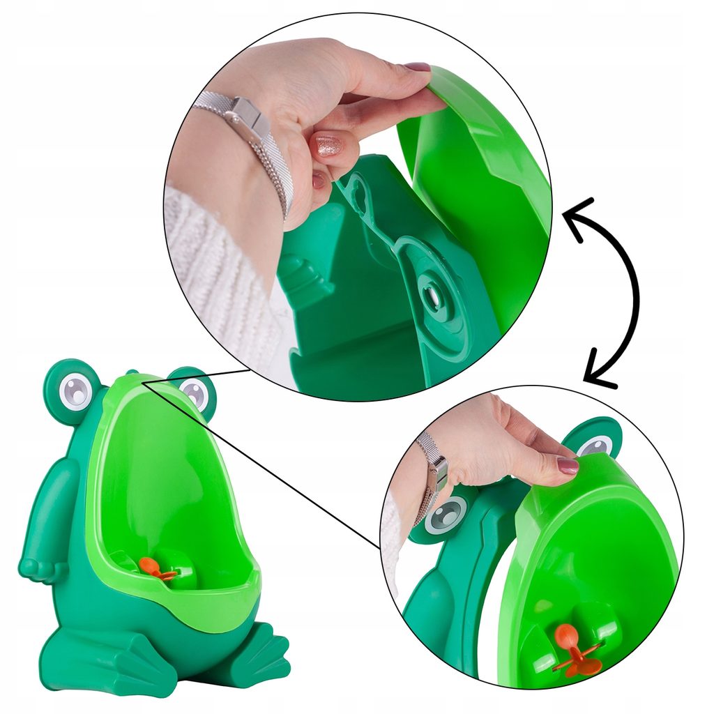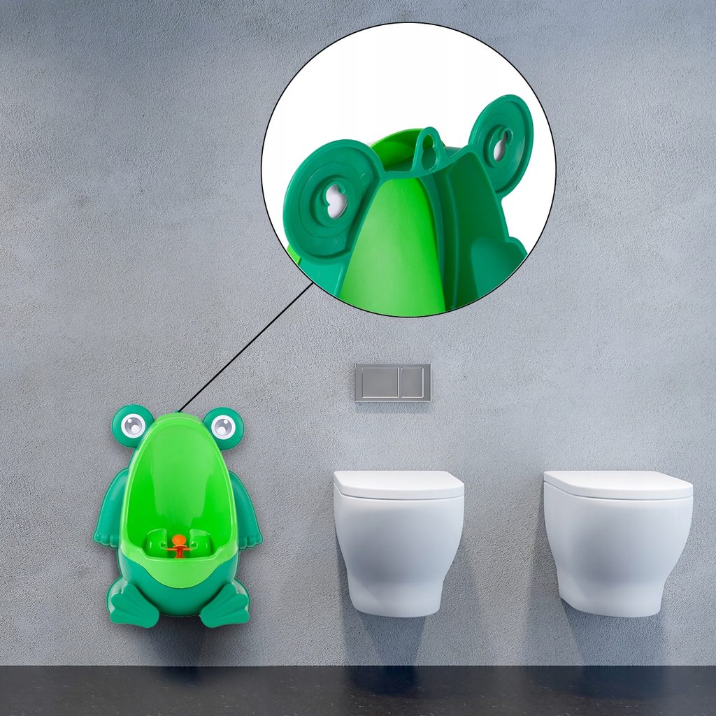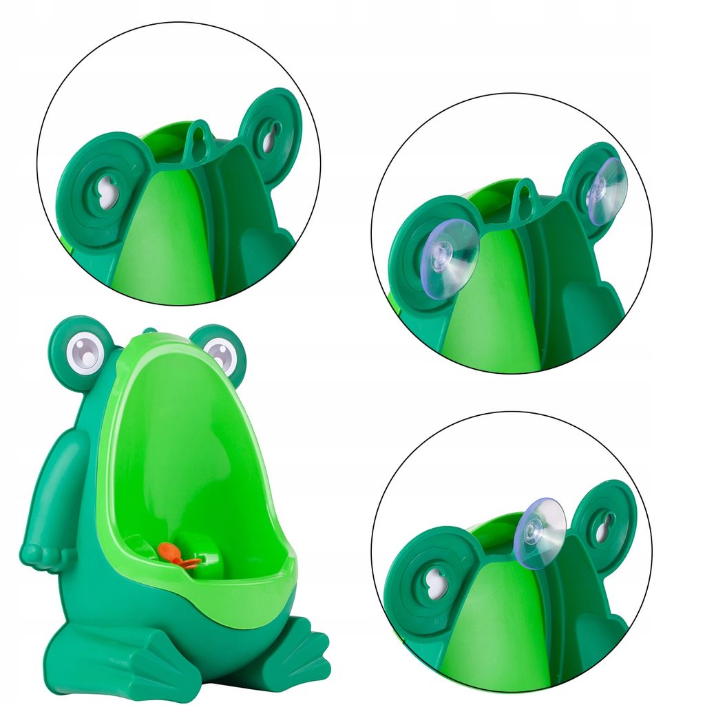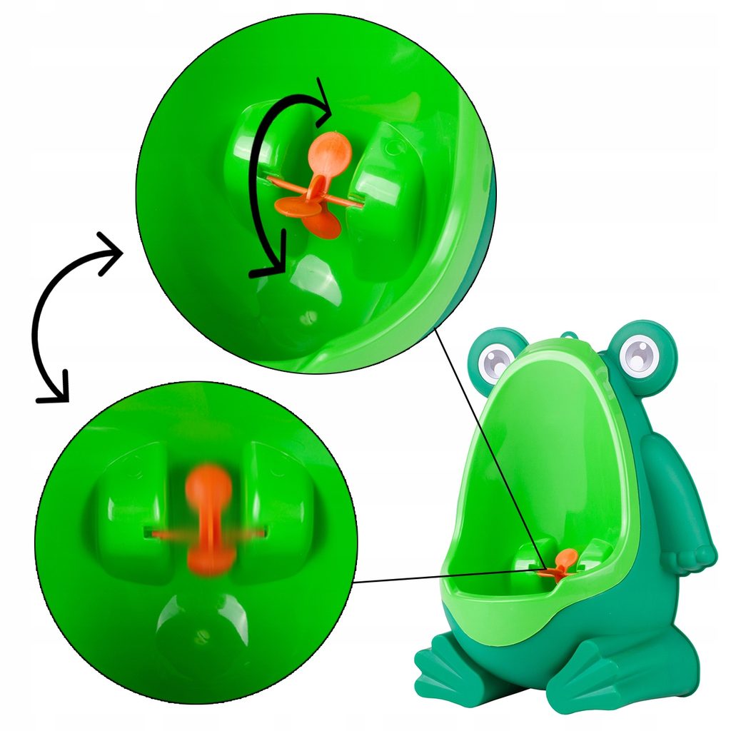 Dětský pisoár Žabka je ideálním prostředkem pro nauku samostatného používání toalety vestoje. Montáž je velmi jednoduchá a to pomocí přísavek, díky kterým můžete navíc nastavit výšku dle věku dítěte. Pisoár můžete připevnit také pomocí šroubů. Uvnitř je umístěn malý kolovrátek v provedení mlýnského kolo což je pro dítě ještě více zábavné. Vnitřní nádobka je vyjímatelná a omyvatelná čímž je zajištěna hygiena. Pisoár je určen pro děti od 3 let věku.