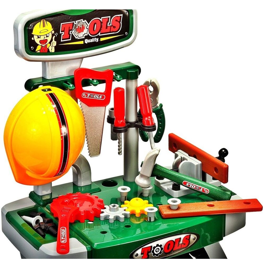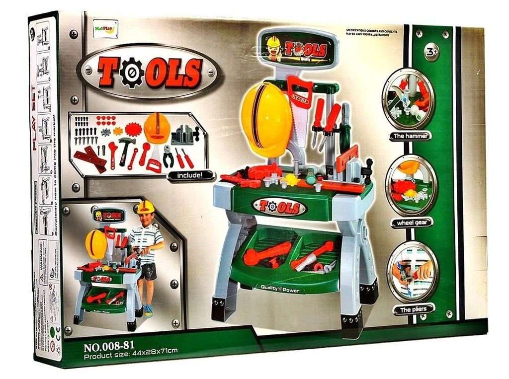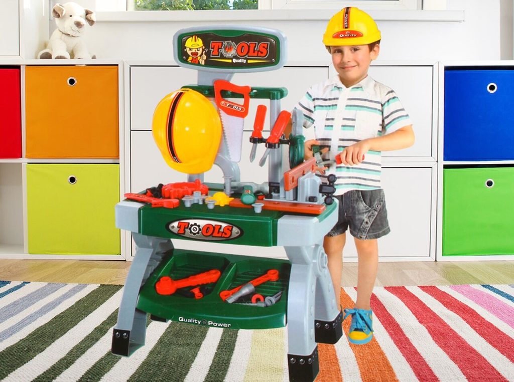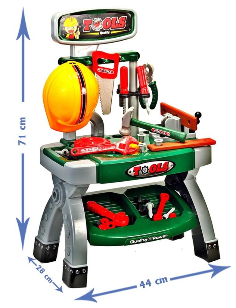 Dětský pracovní stůl Super Tools je určený pro ty nejmenší kutily. Sada obsahuje tyto součást: helmu, kladívko, pilku, kleště, šroubováky, klíče, konstrukční prvky, šroubky a matice. Ve spodní části je umístěna praktická police kam lze uložit pracovní helmu a další potřebné věci. Pracovní deska má otvory pro našroubování šroubků a je na ní umístěn svěrák. Hračka je určena pro děti od 36 měsíců věku.