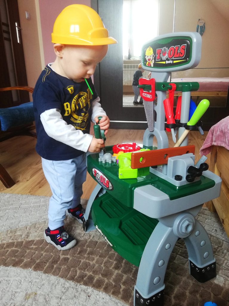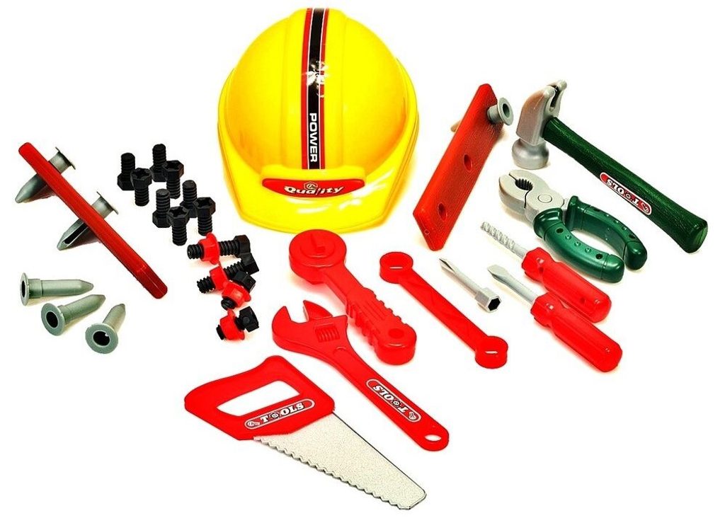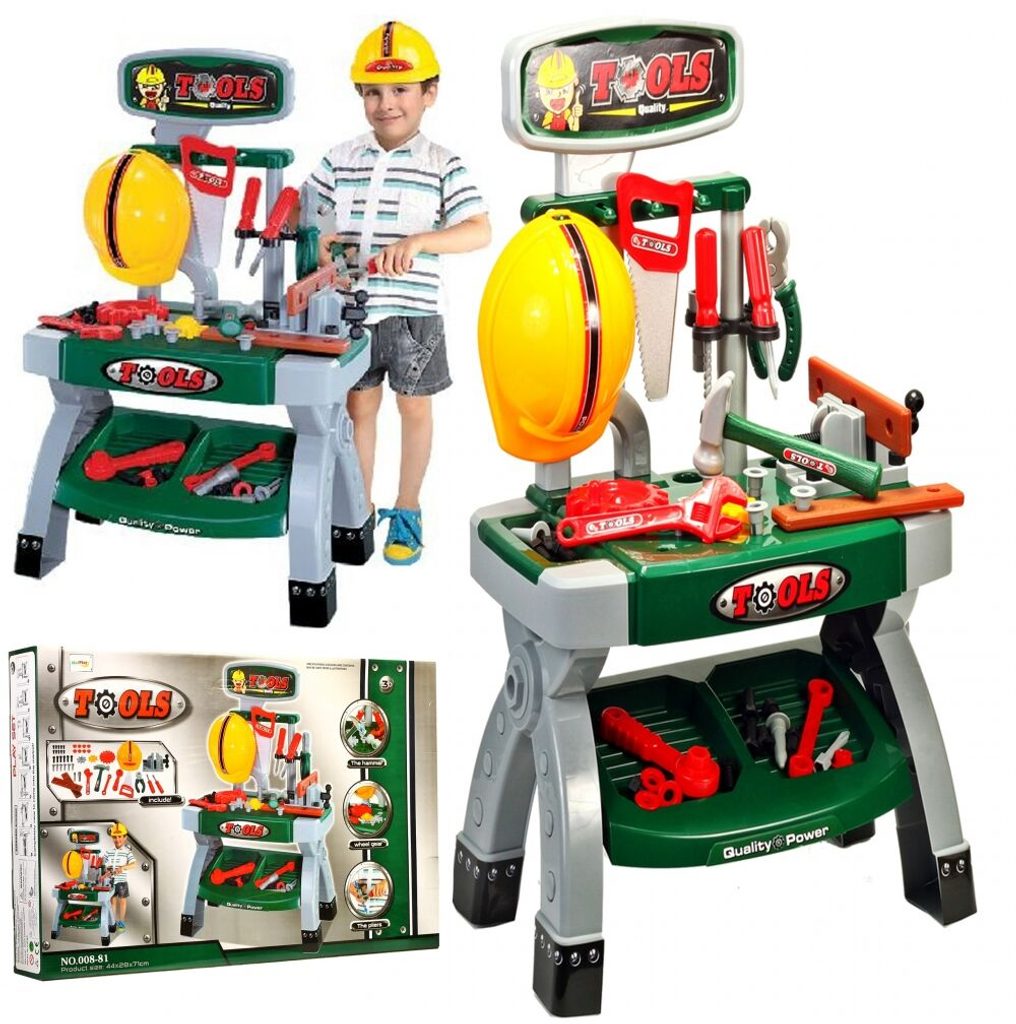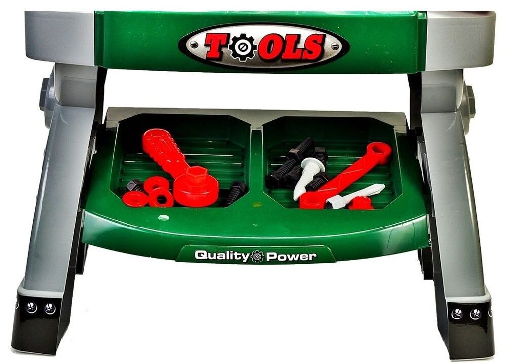 Dětský pracovní stůl Super Tools je určený pro ty nejmenší kutily. Sada obsahuje tyto součást: helmu, kladívko, pilku, kleště, šroubováky, klíče, konstrukční prvky, šroubky a matice. Ve spodní části je umístěna praktická police kam lze uložit pracovní helmu a další potřebné věci. Pracovní deska má otvory pro našroubování šroubků a je na ní umístěn svěrák. Hračka je určena pro děti od 36 měsíců věku.